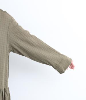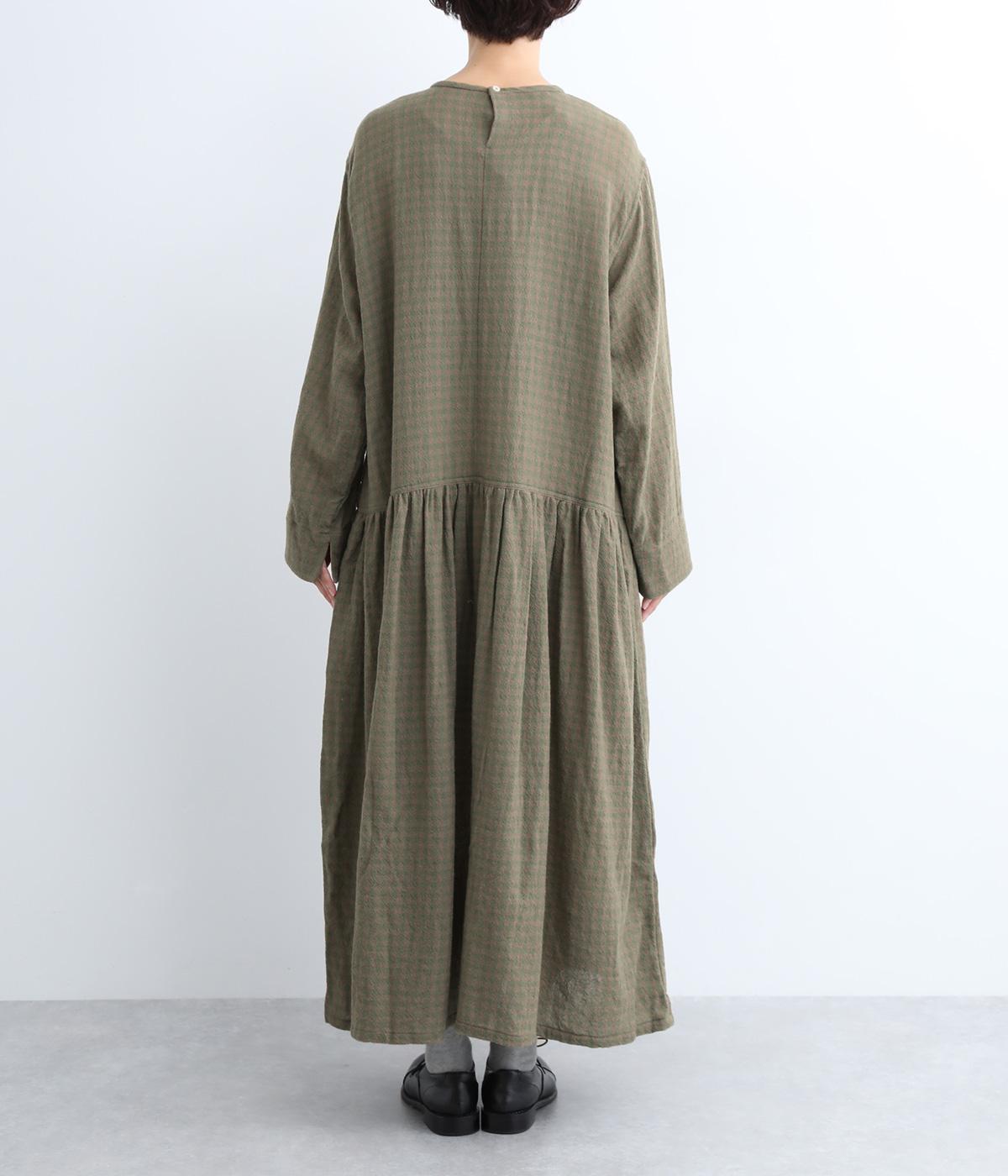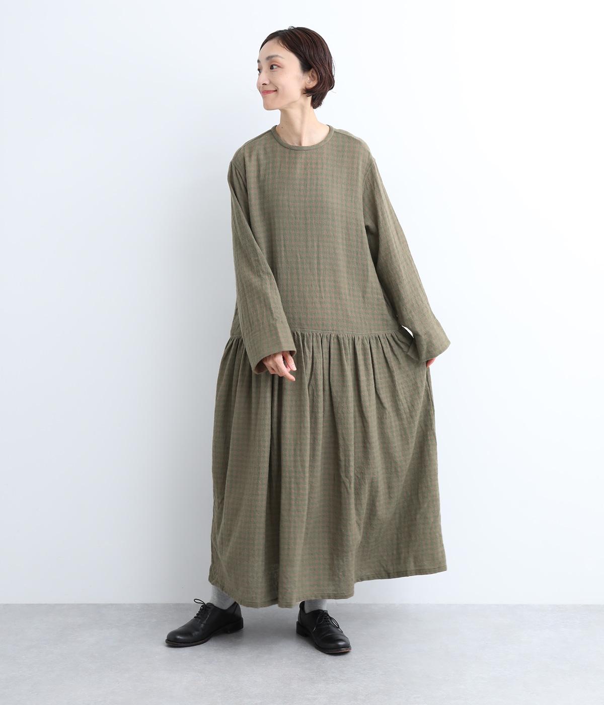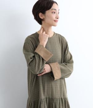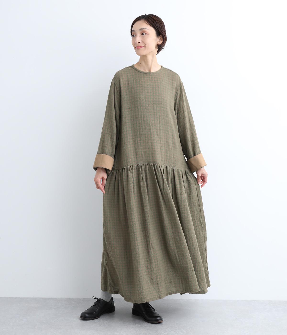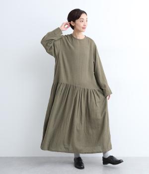 起毛感とチェック柄が表情豊かで、一枚着でスタイリングが完成する着映え力のあるワンピース。ギャザーでフレア感を出し、低めの位置で切り替えてリラックス感を演出。袖裏は無地の綿生地で、折り返してチラ見せするとちょうどいいアクセントに。