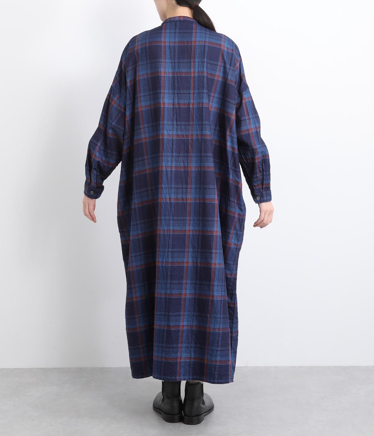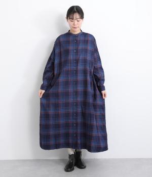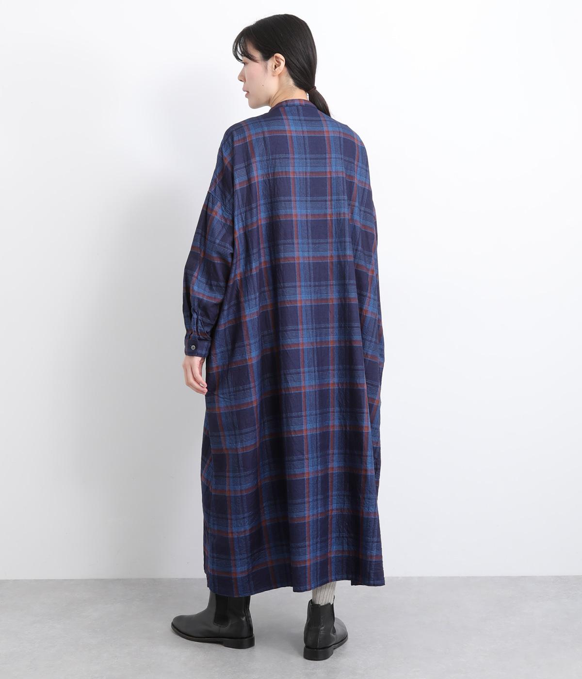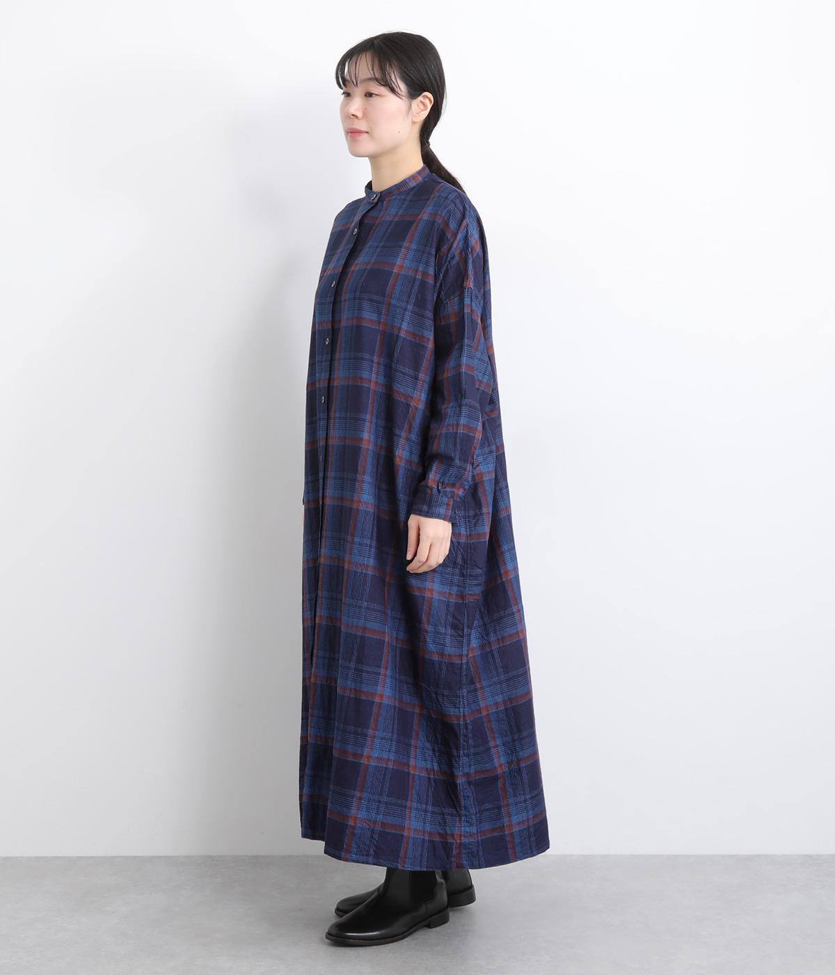 味わい深いインディゴ染めのチェックワンピースです。ゆったりした身幅で体が泳ぐようなリラックス感に、バンドカラーで首元はすっきりさせました。一枚で着るのはもちろん、カーディガンやベストとの重ね着もおすすめです。