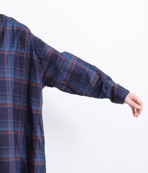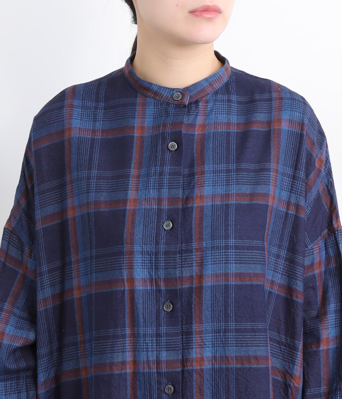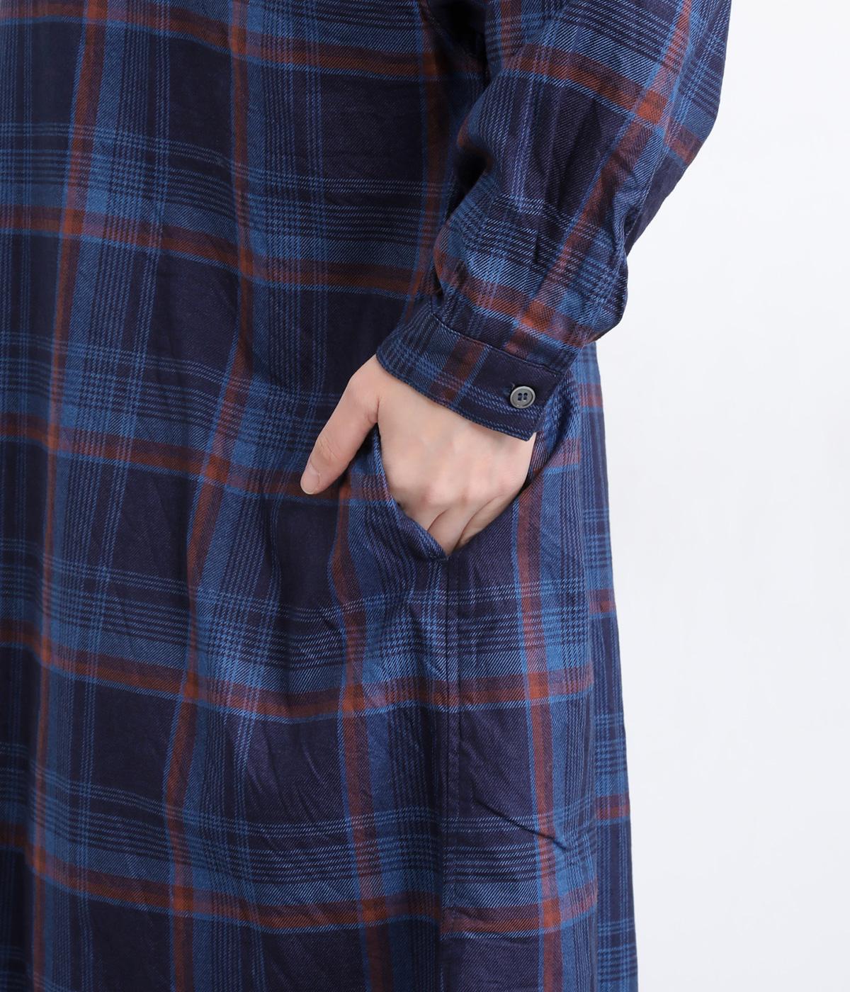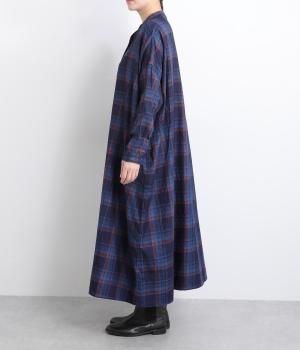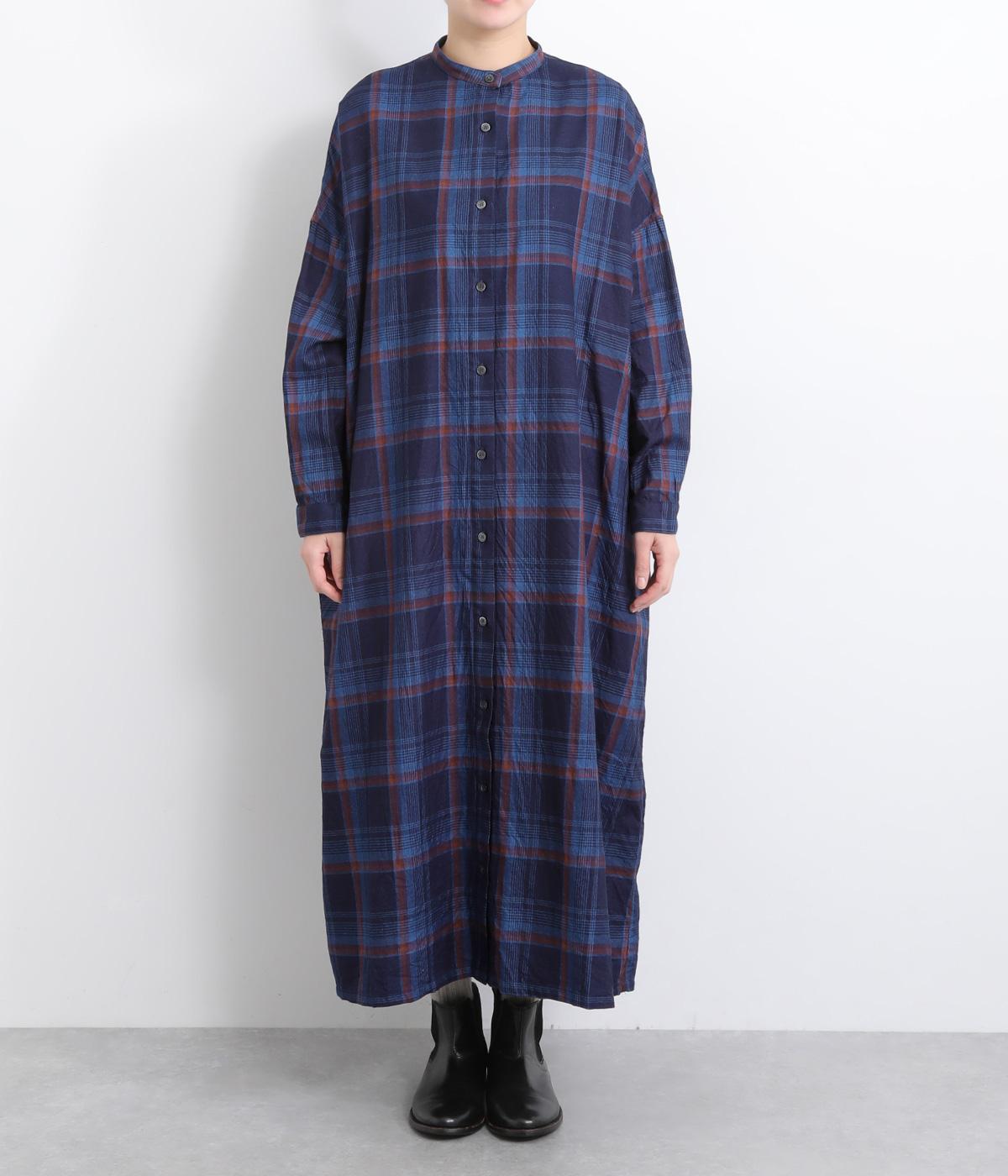 味わい深いインディゴ染めのチェックワンピースです。ゆったりした身幅で体が泳ぐようなリラックス感に、バンドカラーで首元はすっきりさせました。一枚で着るのはもちろん、カーディガンやベストとの重ね着もおすすめです。