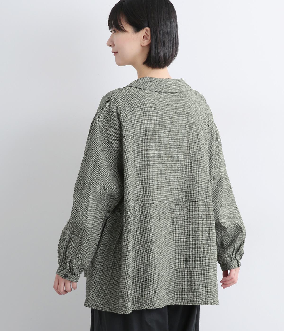 たっぷりと使用した生地がふんわりと女性らしいシルエットをつくるシャツです。ぽわんとした袖がかわいらしさを添えています。首元はすっきりと仕上げ、インナーとも合わせやすく、一枚でもサマになるアイテムです。