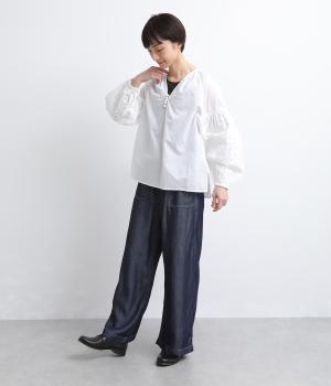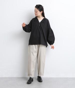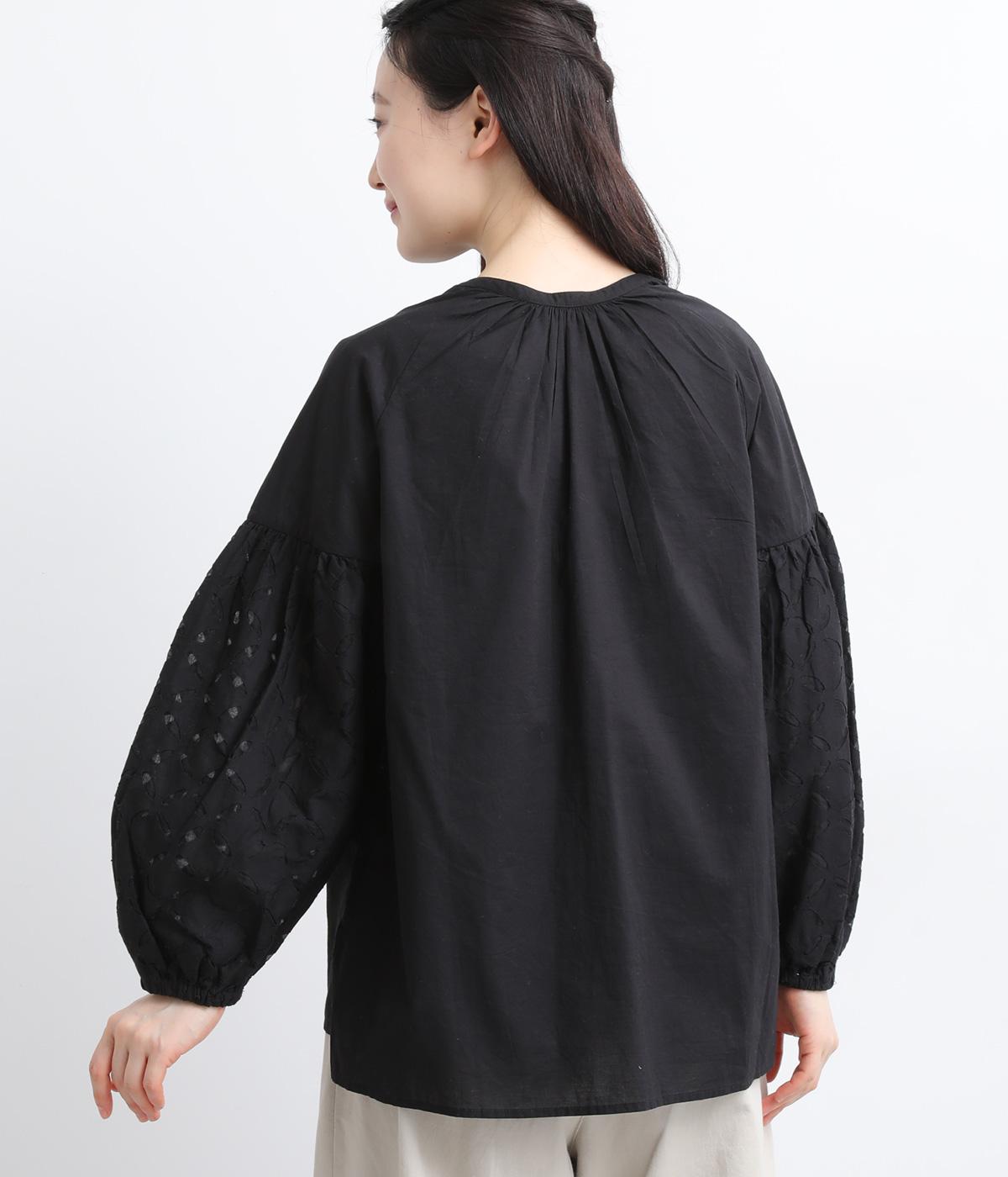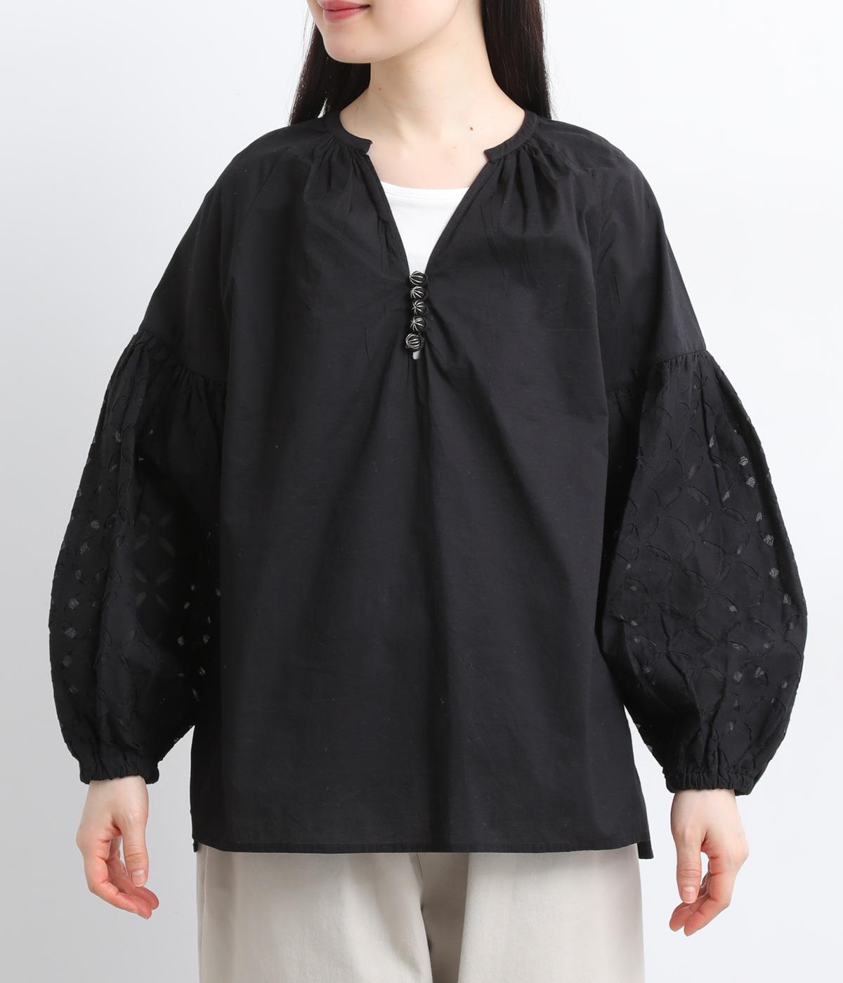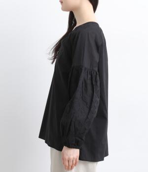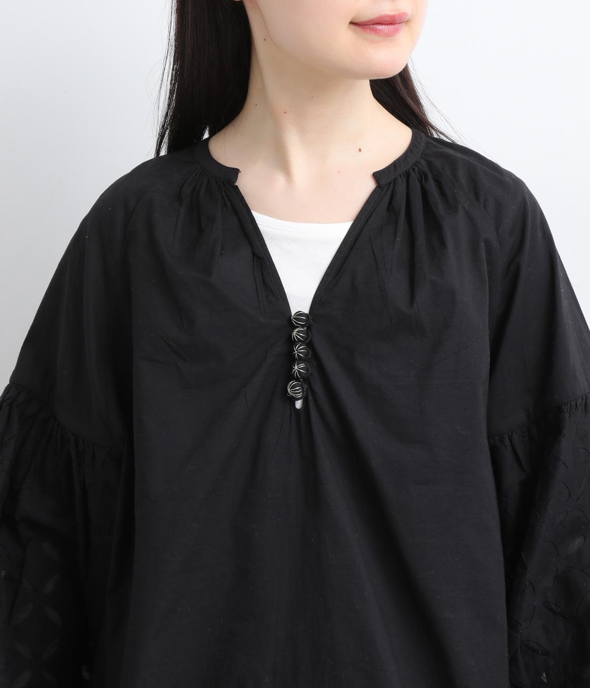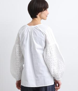 インド西部の伝統技法を用いたリバースアップリケで、袖に繊細なモチーフを表現した特別感のある一枚です。すっきりとあいたネックラインが、顔まわりに抜け感を添え、甘さをおさえた大人の印象に仕上げています。ゴム仕様の袖口がふんわりとした立体感を生み、女性らしいやわらかさを引き立てます。