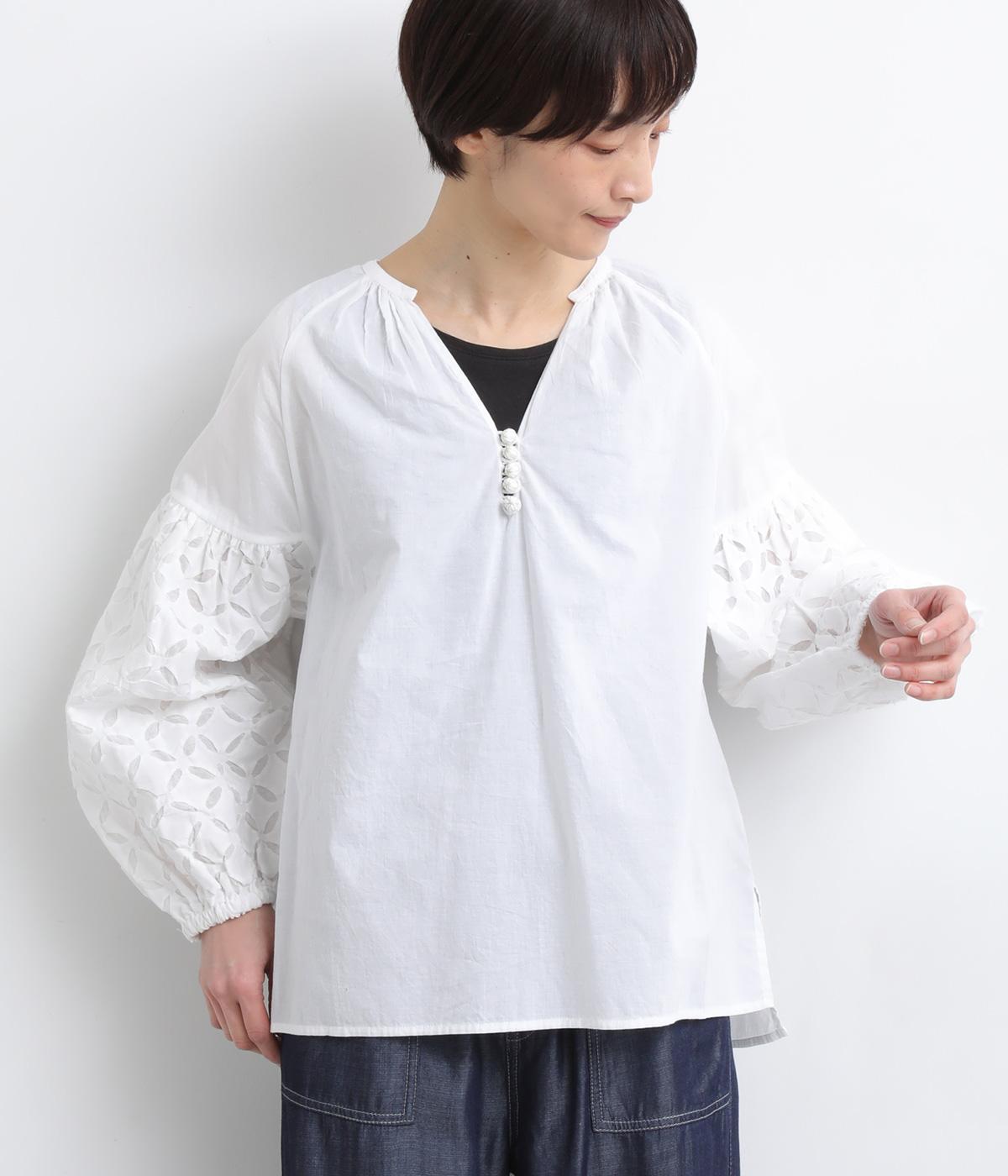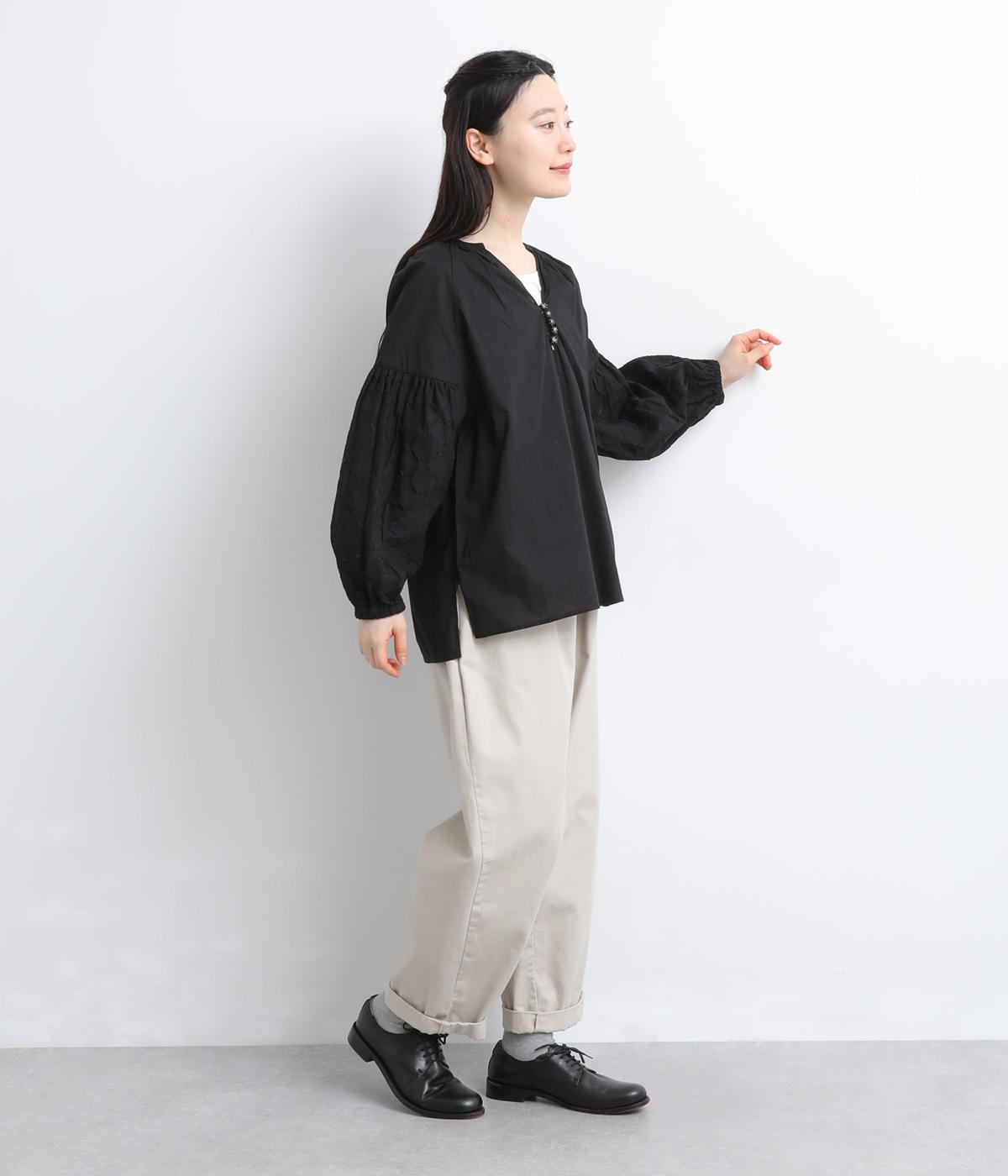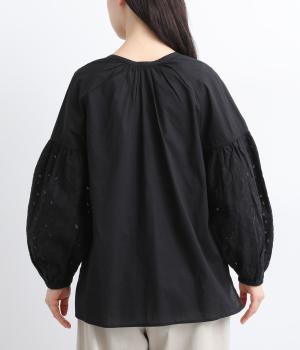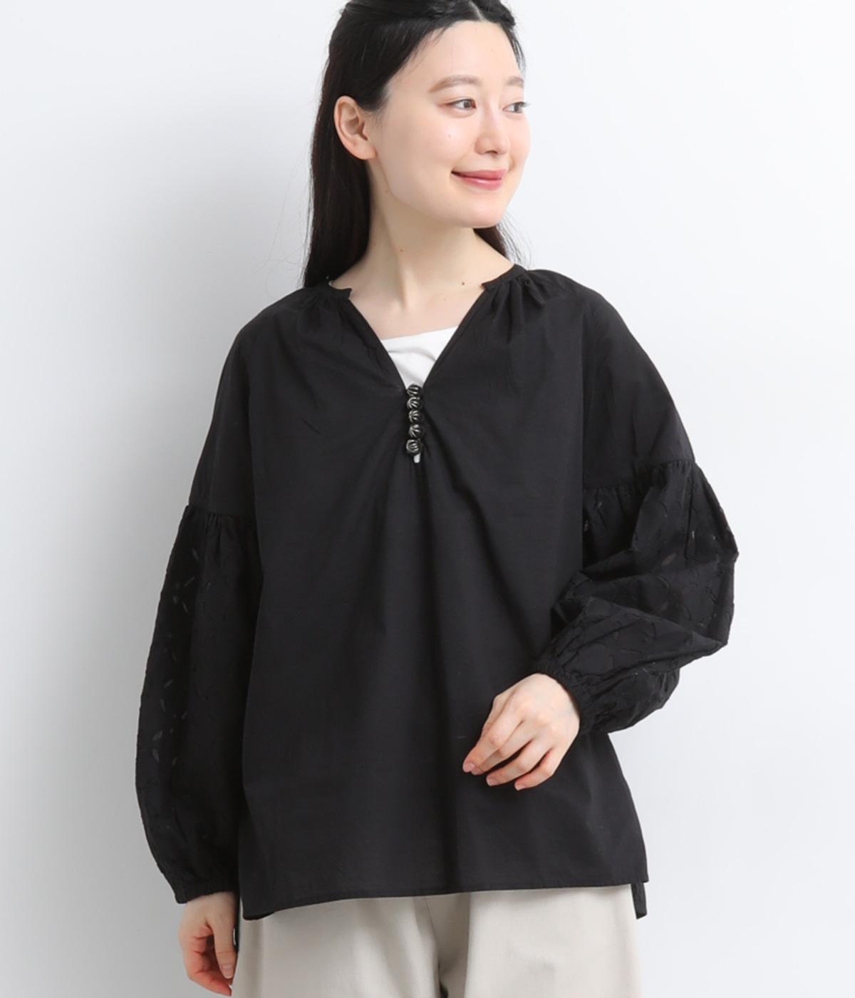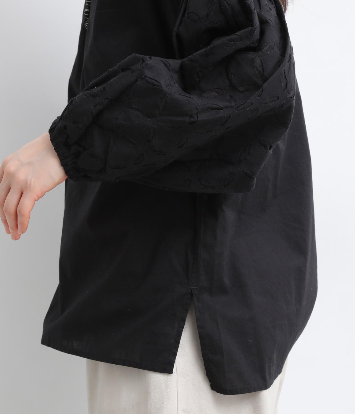 インド西部の伝統技法を用いたリバースアップリケで、袖に繊細なモチーフを表現した特別感のある一枚です。すっきりとあいたネックラインが、顔まわりに抜け感を添え、甘さをおさえた大人の印象に仕上げています。ゴム仕様の袖口がふんわりとした立体感を生み、女性らしいやわらかさを引き立てます。