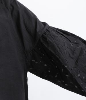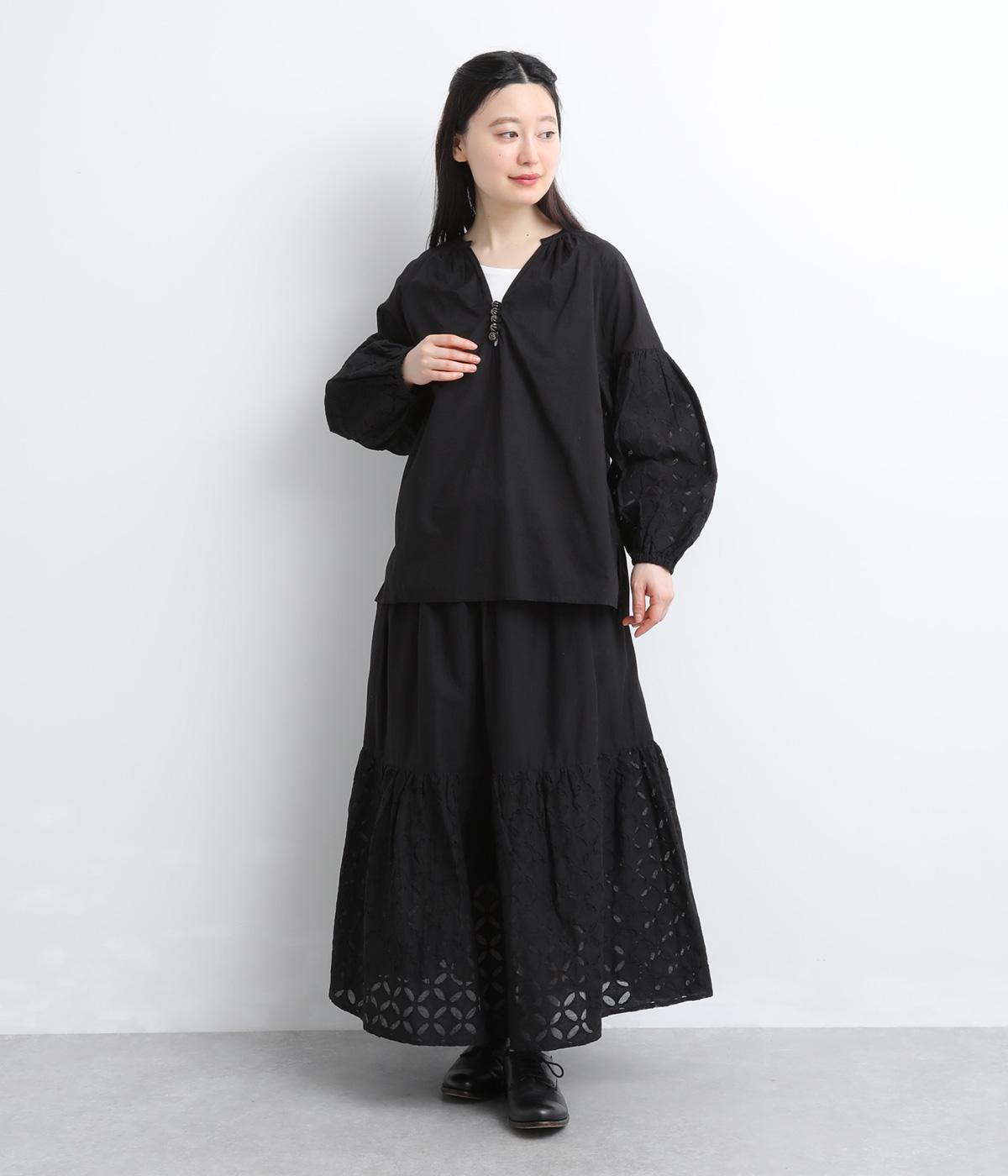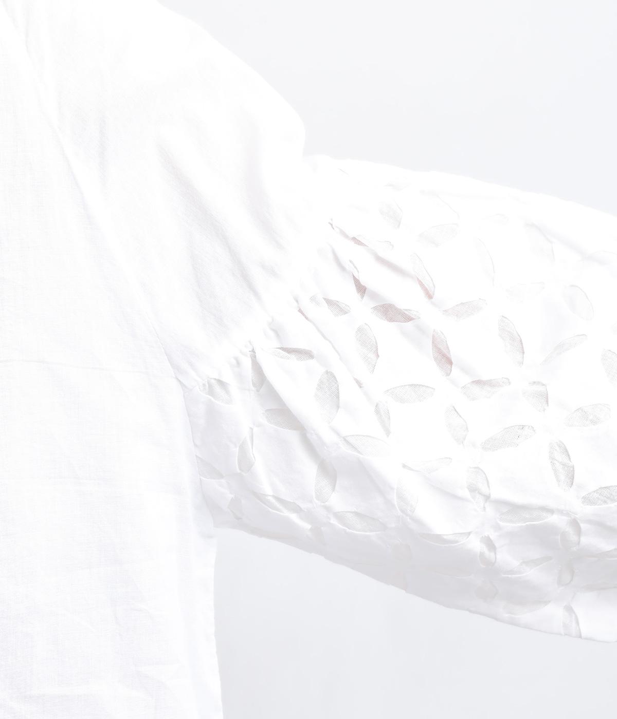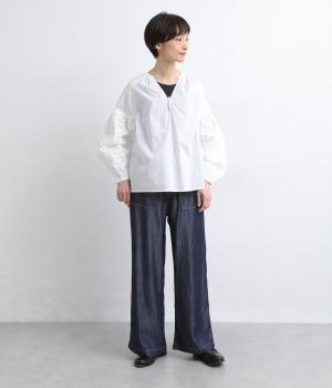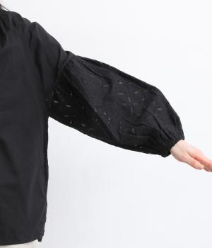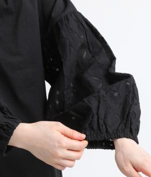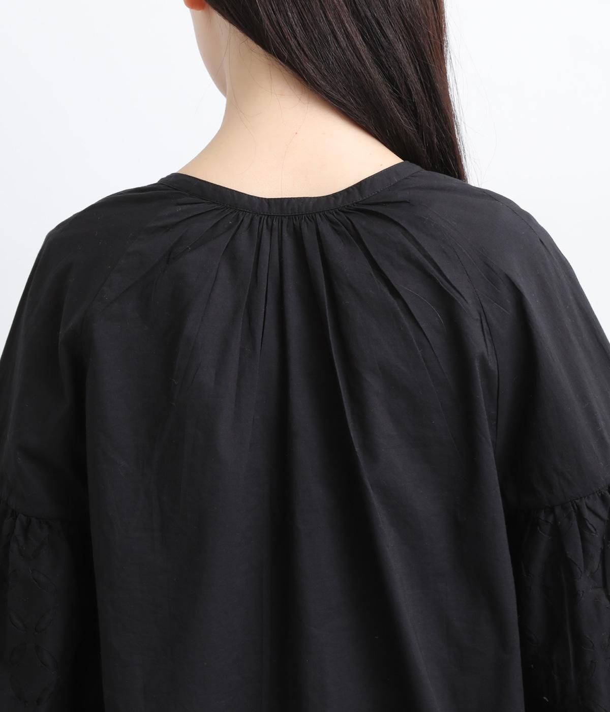 インド西部の伝統技法を用いたリバースアップリケで、袖に繊細なモチーフを表現した特別感のある一枚です。すっきりとあいたネックラインが、顔まわりに抜け感を添え、甘さをおさえた大人の印象に仕上げています。ゴム仕様の袖口がふんわりとした立体感を生み、女性らしいやわらかさを引き立てます。