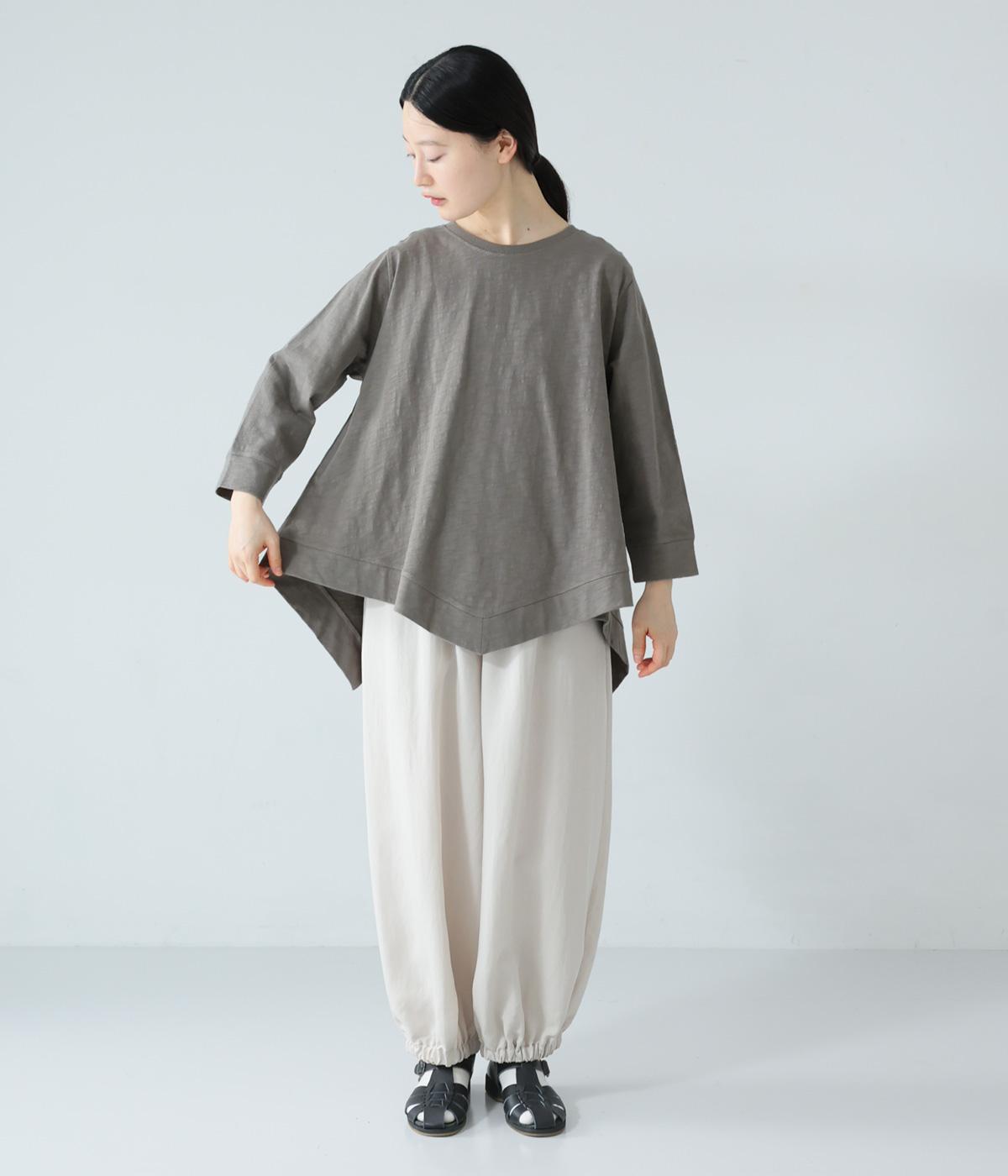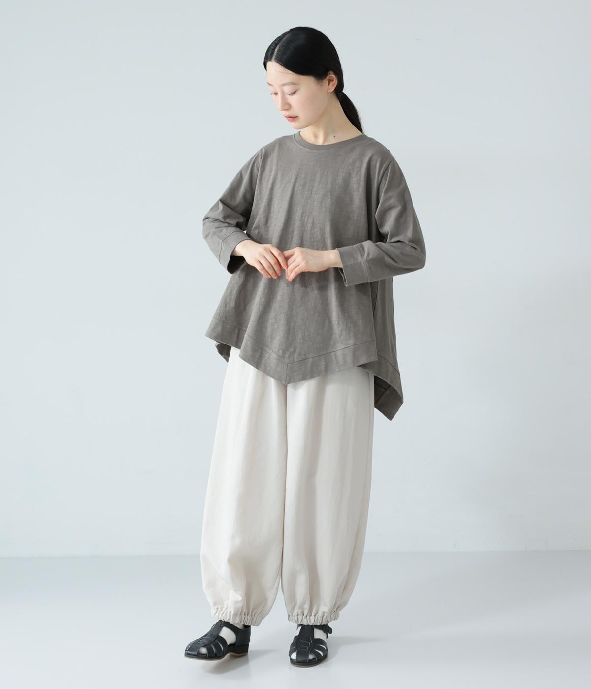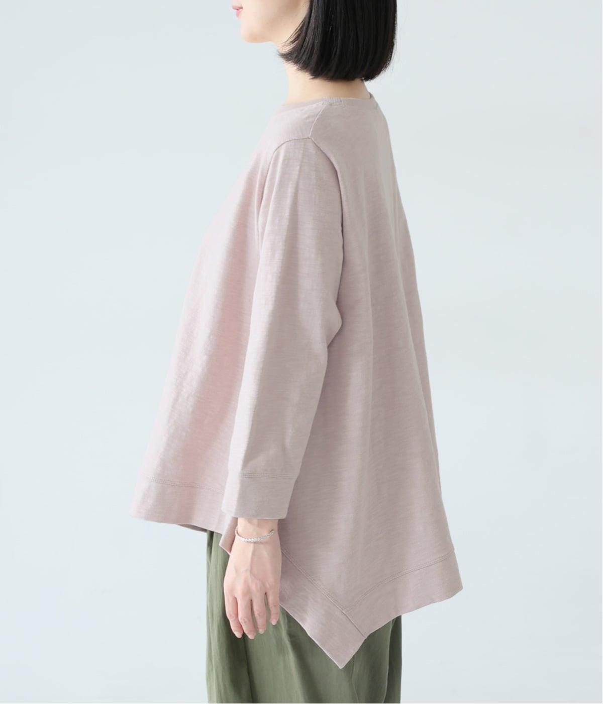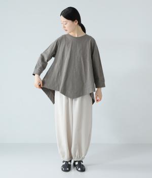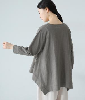変形ヘムが軽やかな動きのあるシルエットを描くプルオーバーです。ゆるやかに揺れるラインがやわらかな表情を生み、前後差のある裾がニュアンスを添えます。シンプルながらも装いのポイントになり、バランスよく着こなせる一枚です。