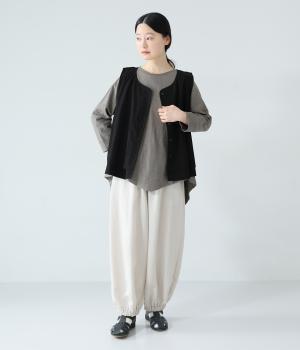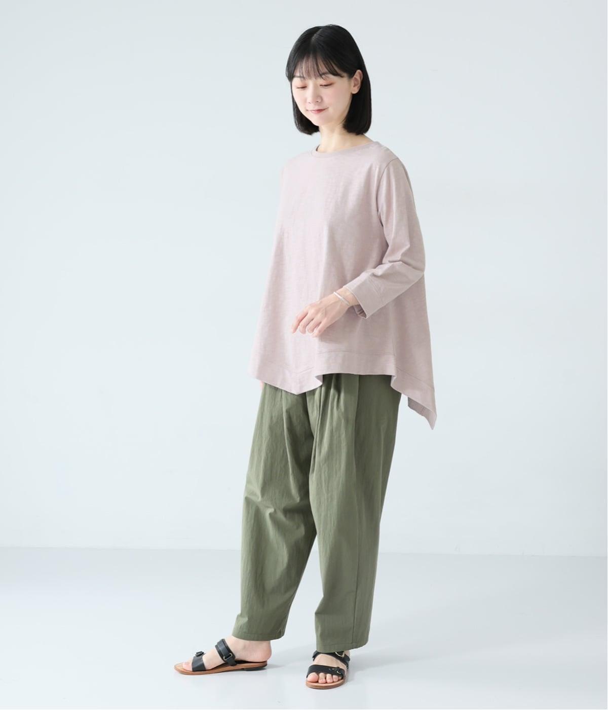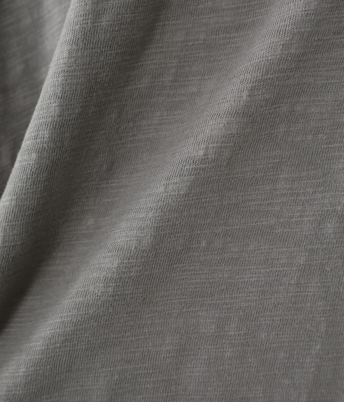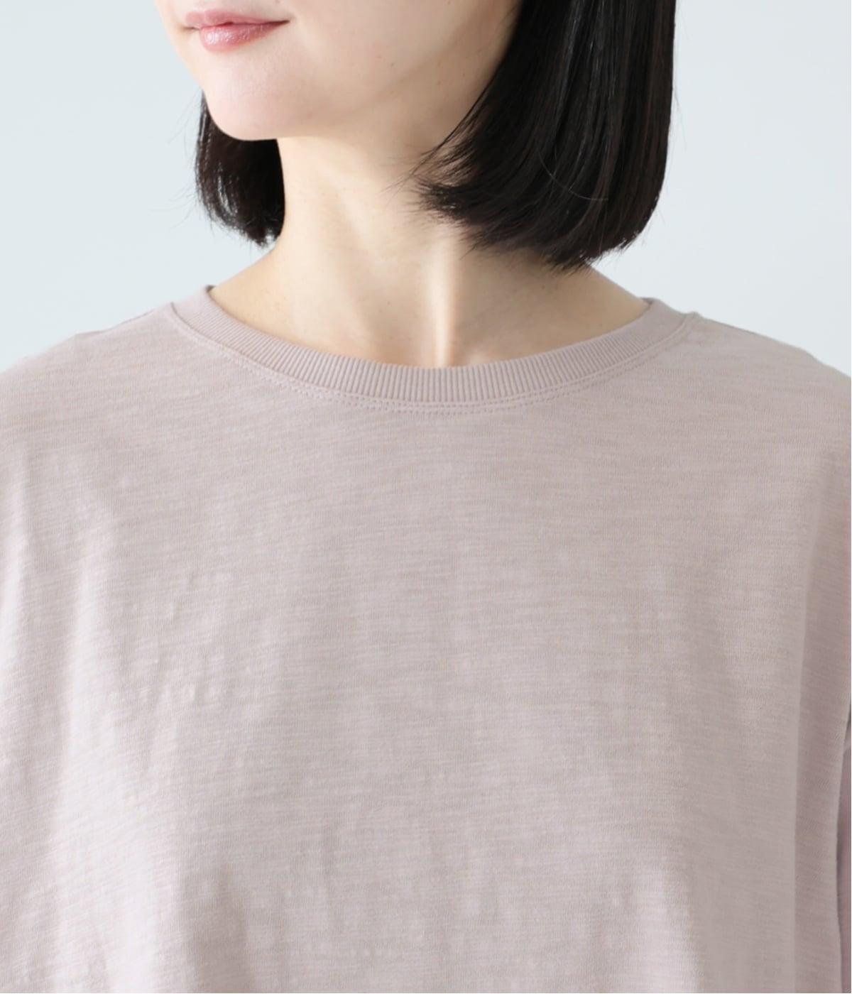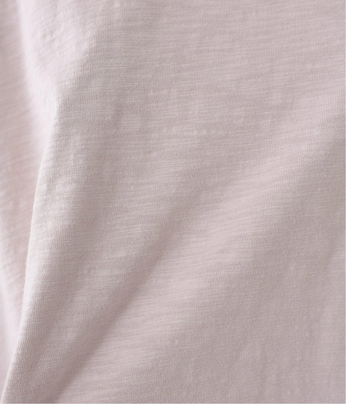 太さにムラのあるスラブ糸で編み立てたコットン天竺生地。ほどよい厚みがあり、編み目を詰めることで型崩れしにくく仕上げました。さらりとした肌ざわりで心地よく着られます。