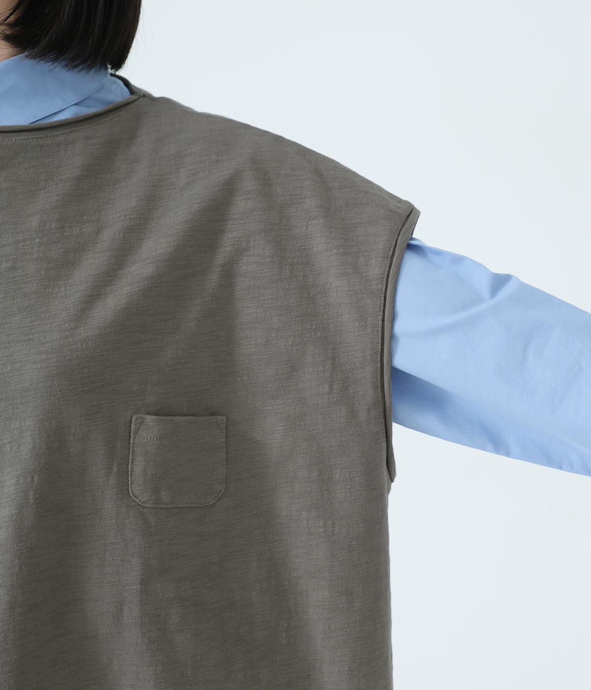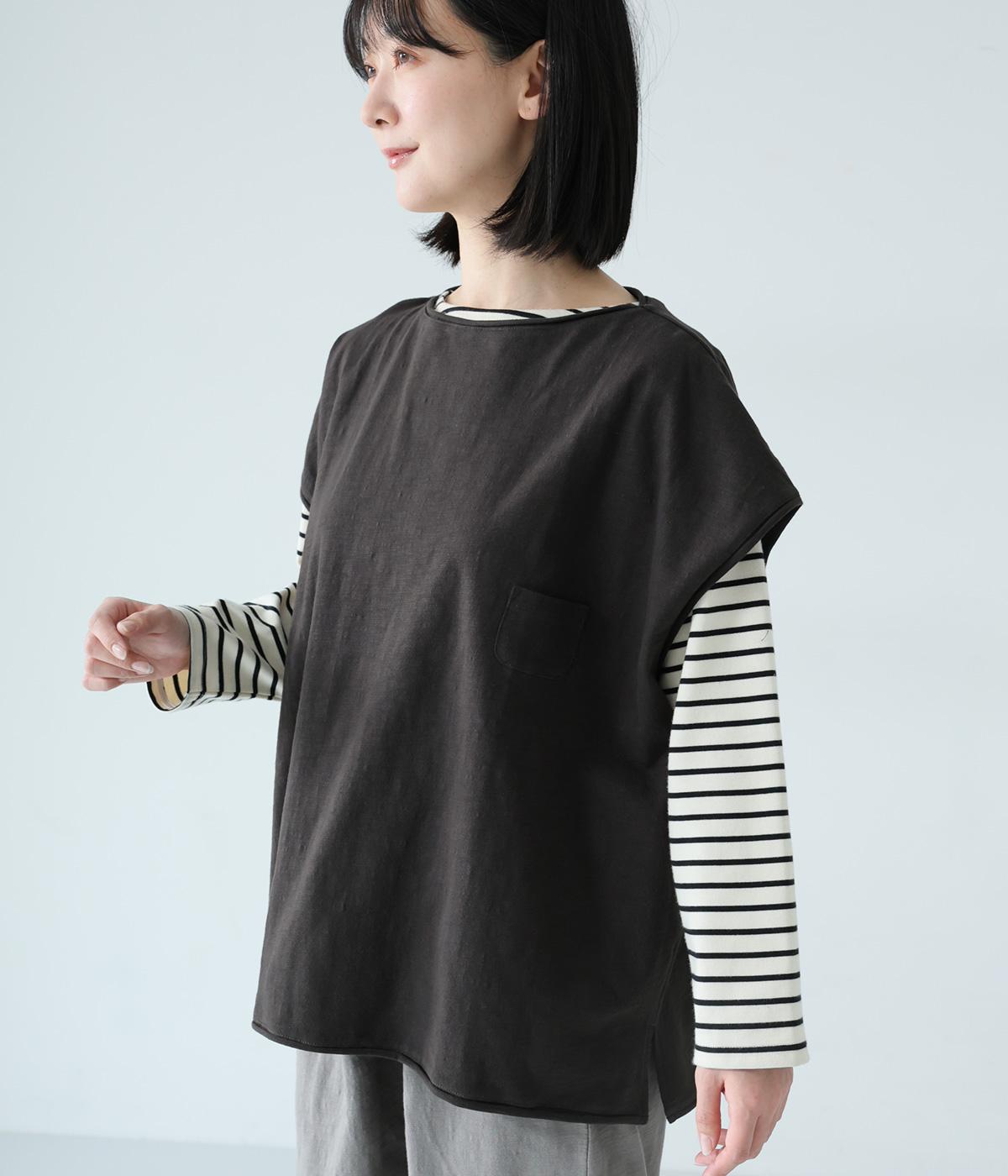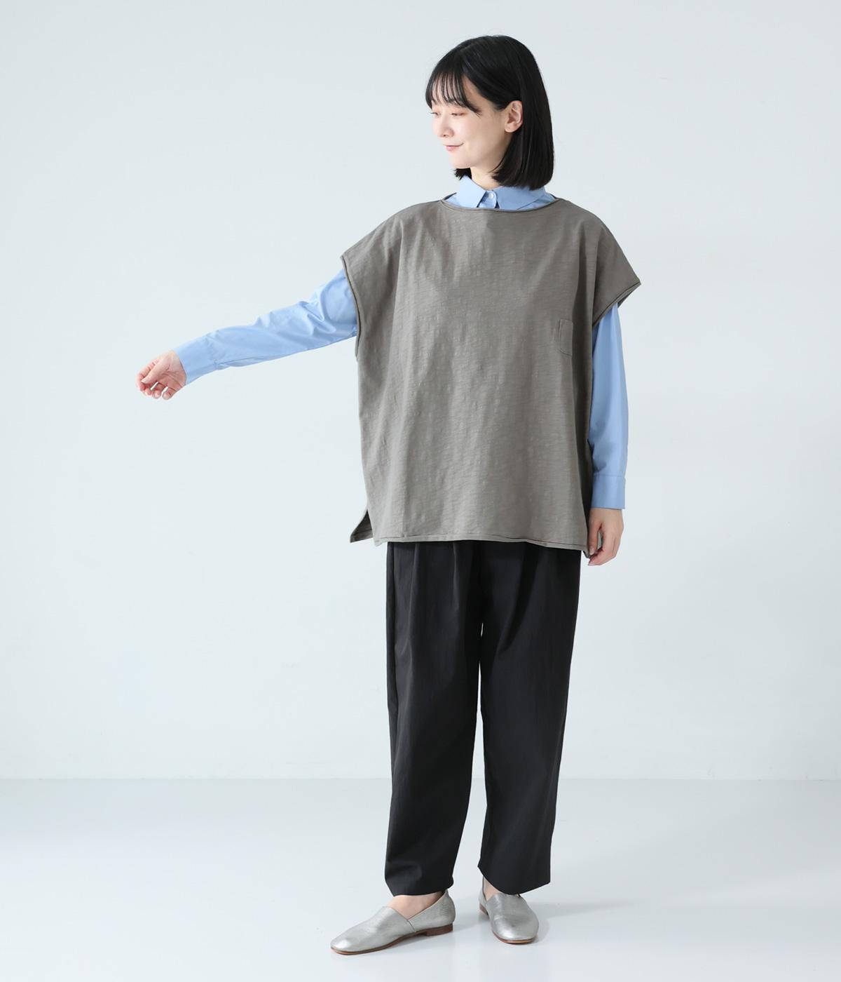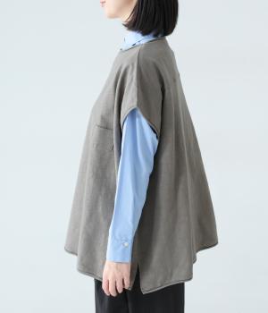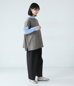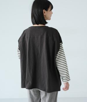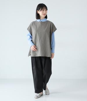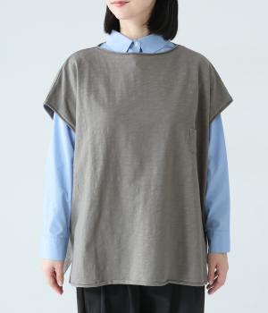ノースリーブながら肩まわりをさりげなくカバーするデザイン。ヴィンテージライクな風合いがこなれた雰囲気をまといます。ロール仕様の襟ぐりや裾がやわらかな印象を添え、ゆとりのあるシルエットで重ねやすく仕上げました。