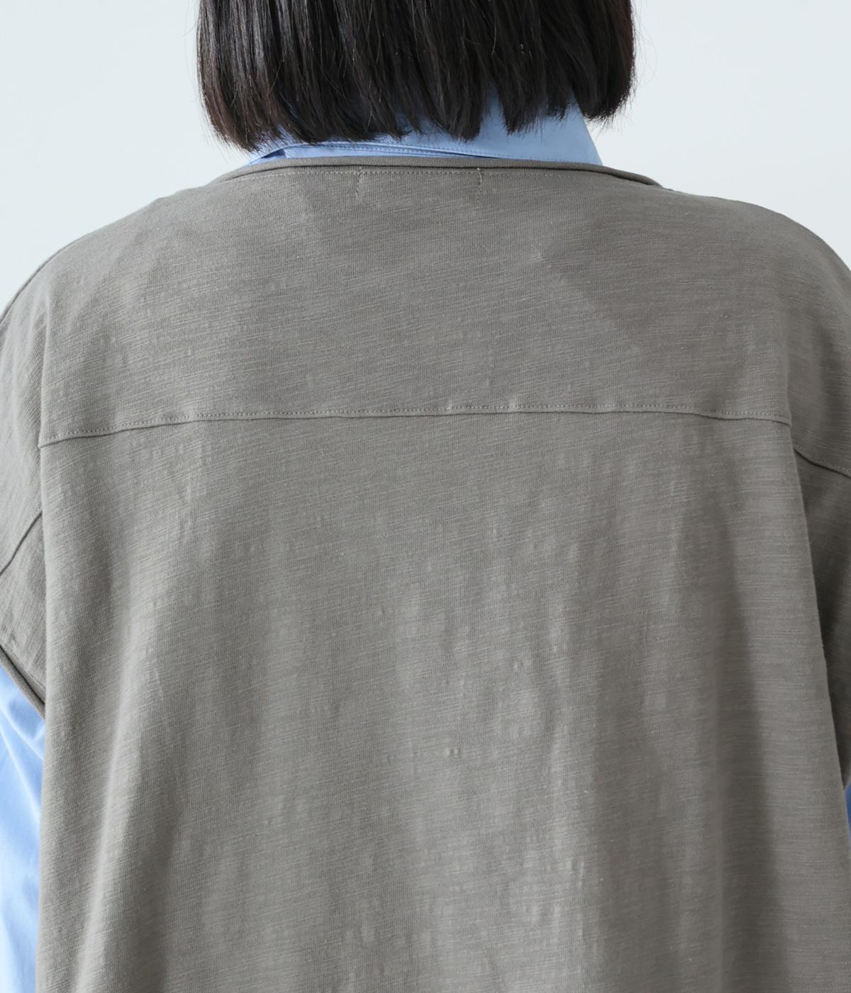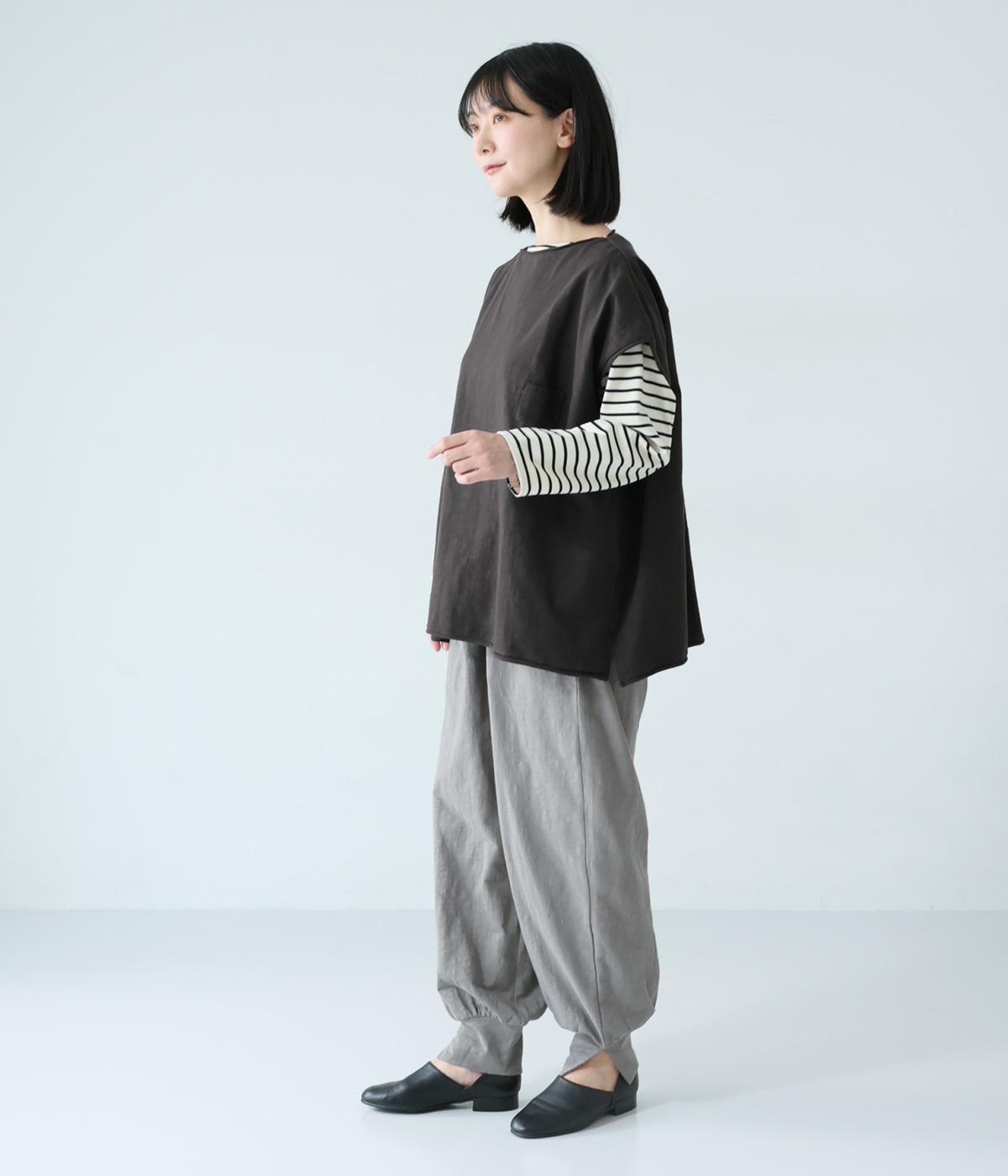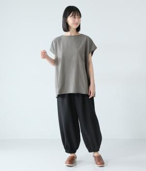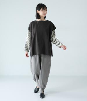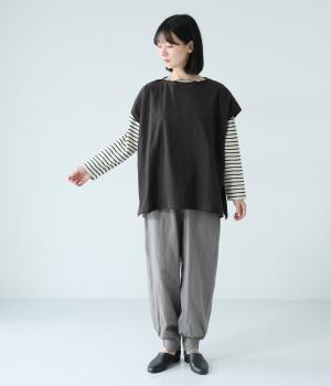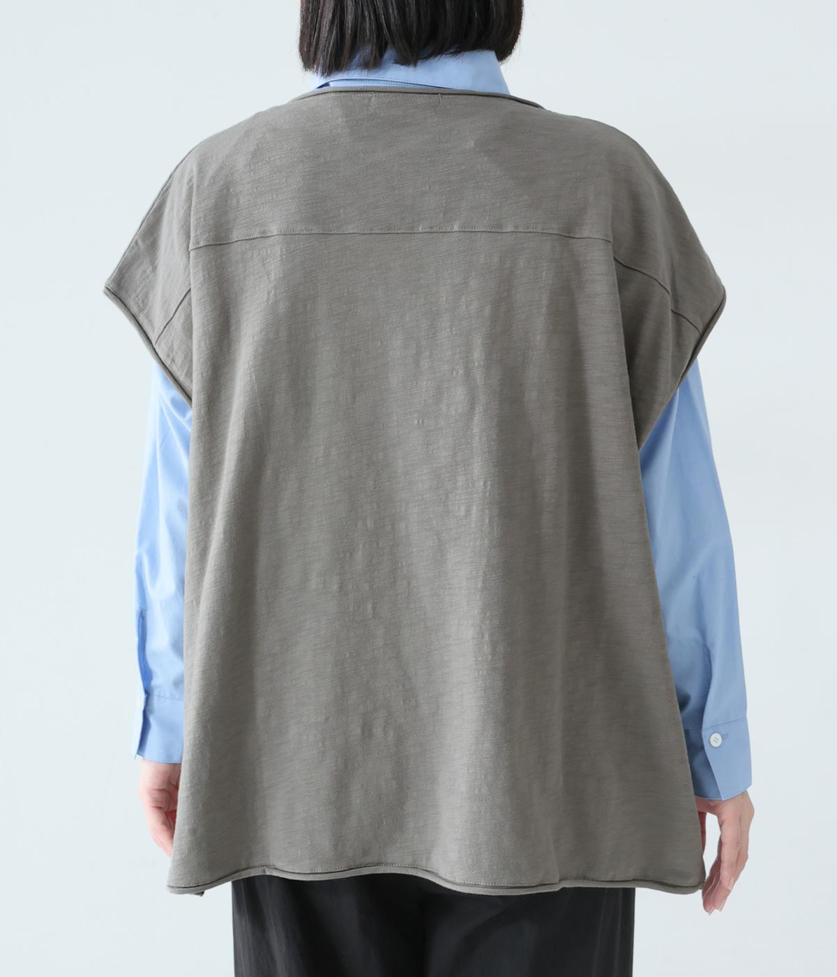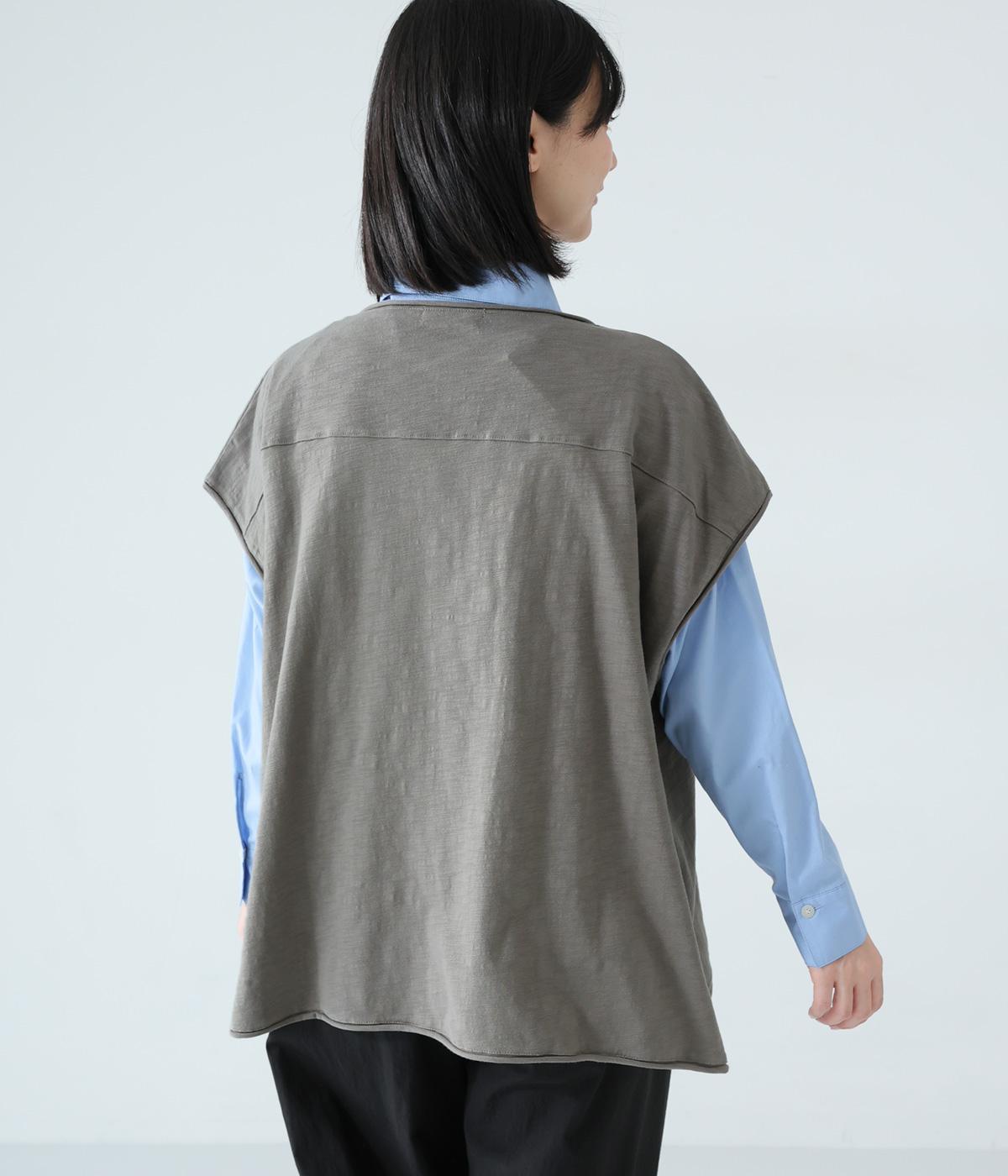 ノースリーブながら肩まわりをさりげなくカバーするデザイン。ヴィンテージライクな風合いがこなれた雰囲気をまといます。ロール仕様の襟ぐりや裾がやわらかな印象を添え、ゆとりのあるシルエットで重ねやすく仕上げました。