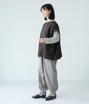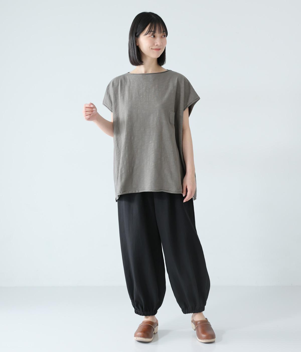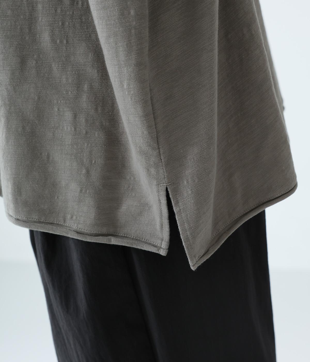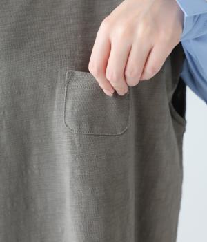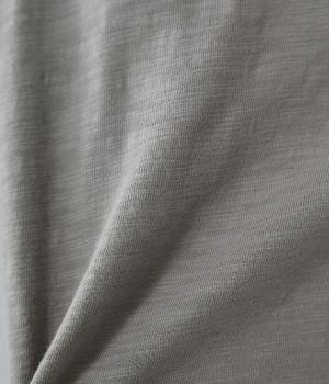 太さにムラのあるスラブ糸で編み立てたコットン天竺生地。ほどよい厚みがあり、編み目を詰めることで型崩れしにくく仕上げました。さらりとした肌ざわりで心地よく着られます。