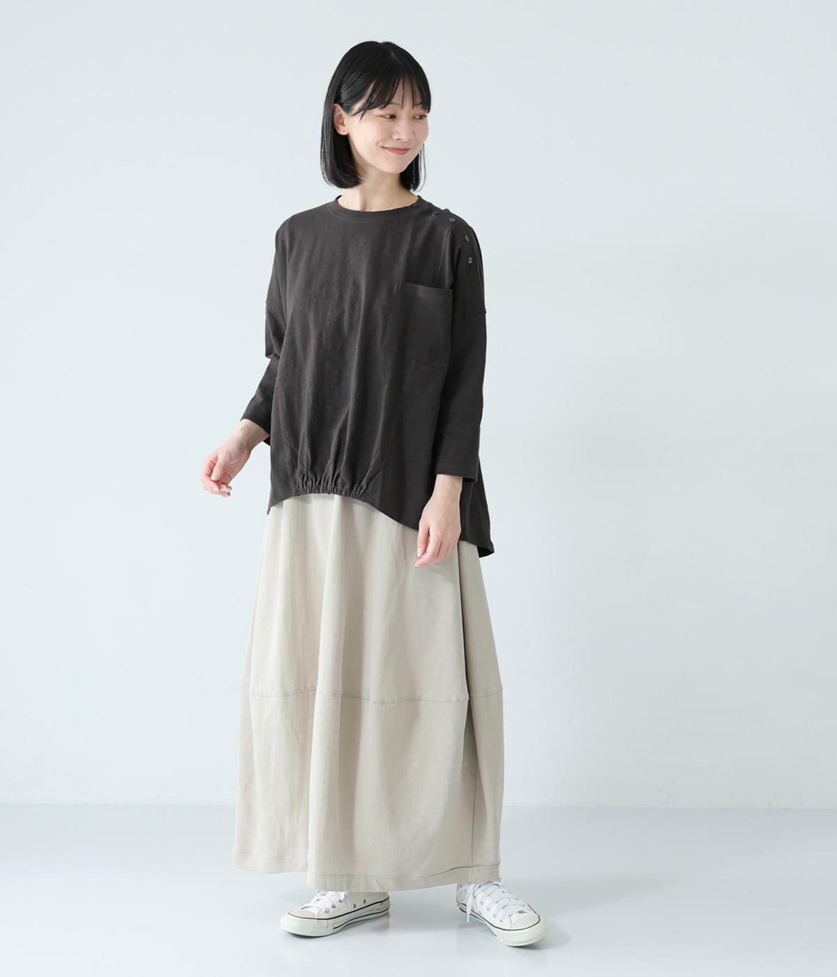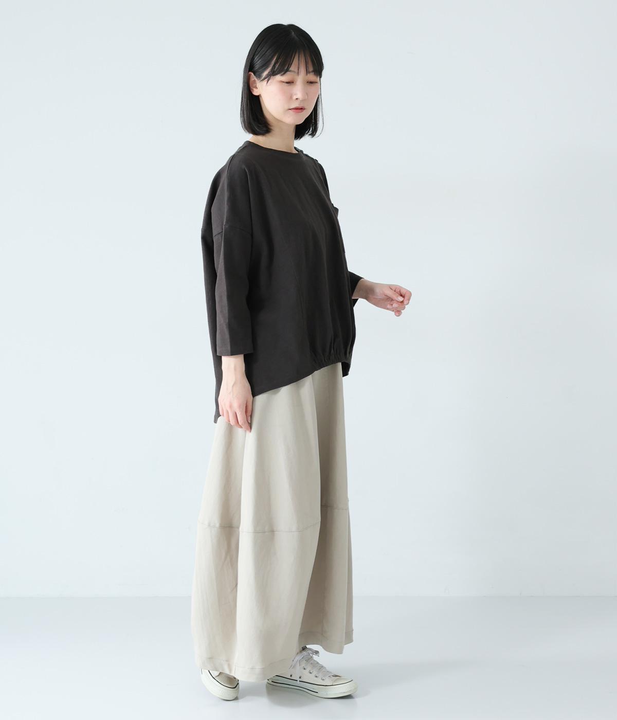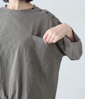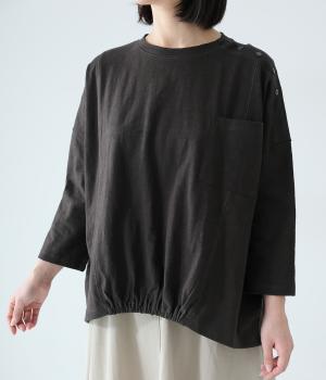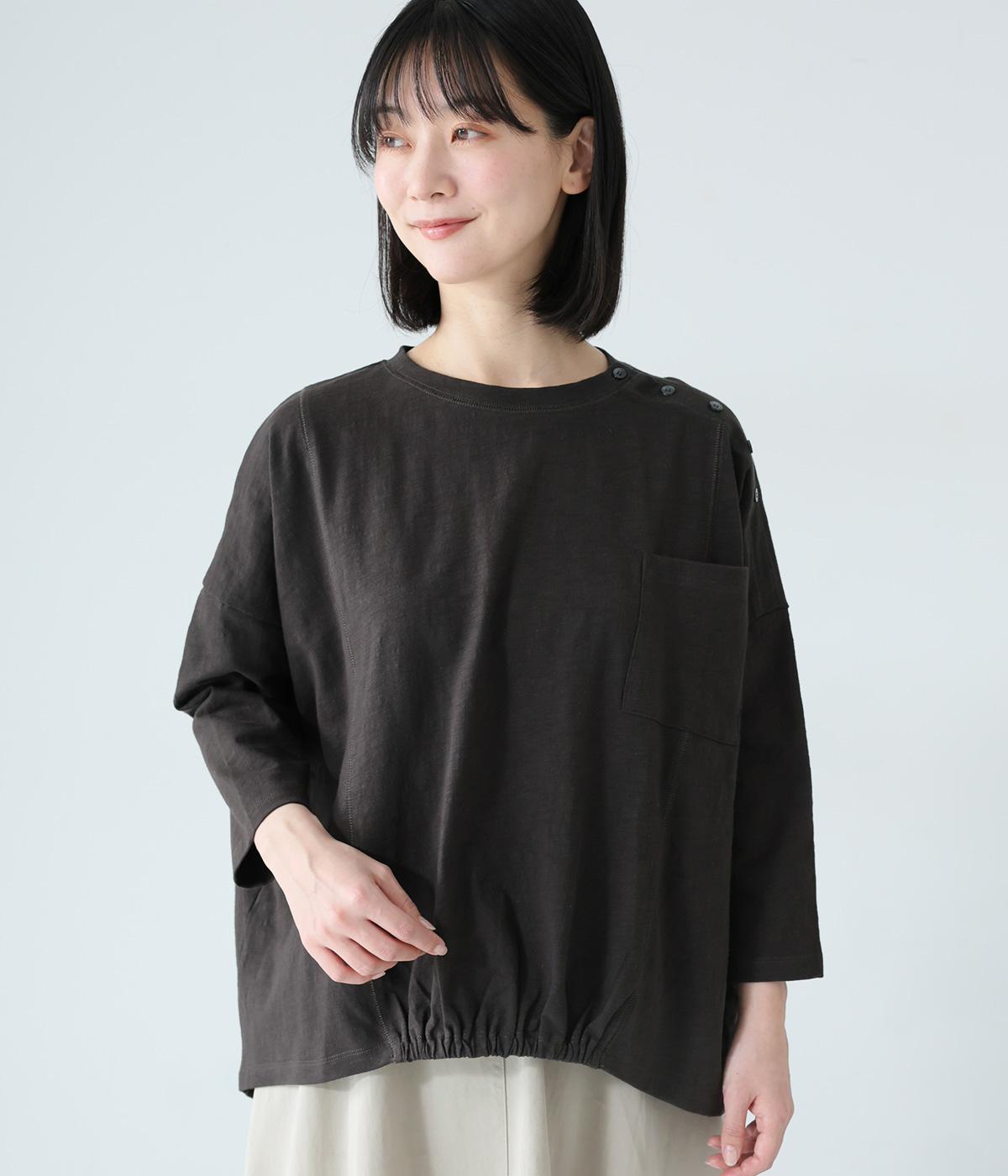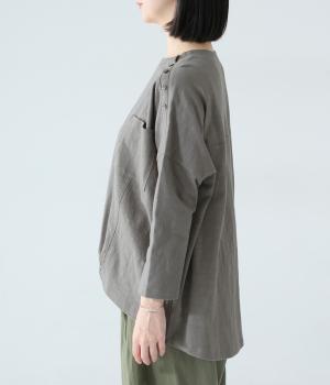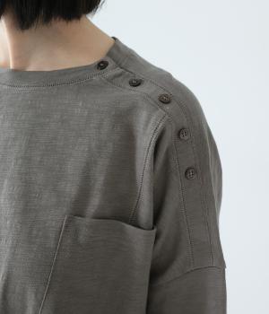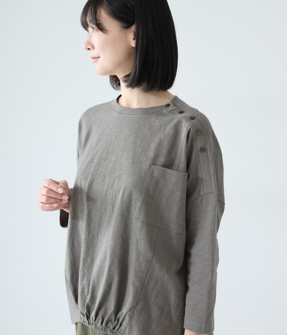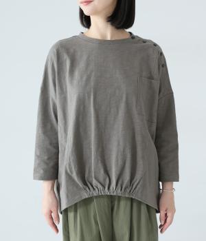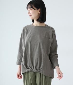 ゆったりとしたボックスシルエットに、前裾のゴムでやわらかな丸みをもたせたプルオーバーです。肩にあしらったボタンがさりげないアクセントを添え、シンプルながら細部にニュアンスを感じる一枚に仕上げています。