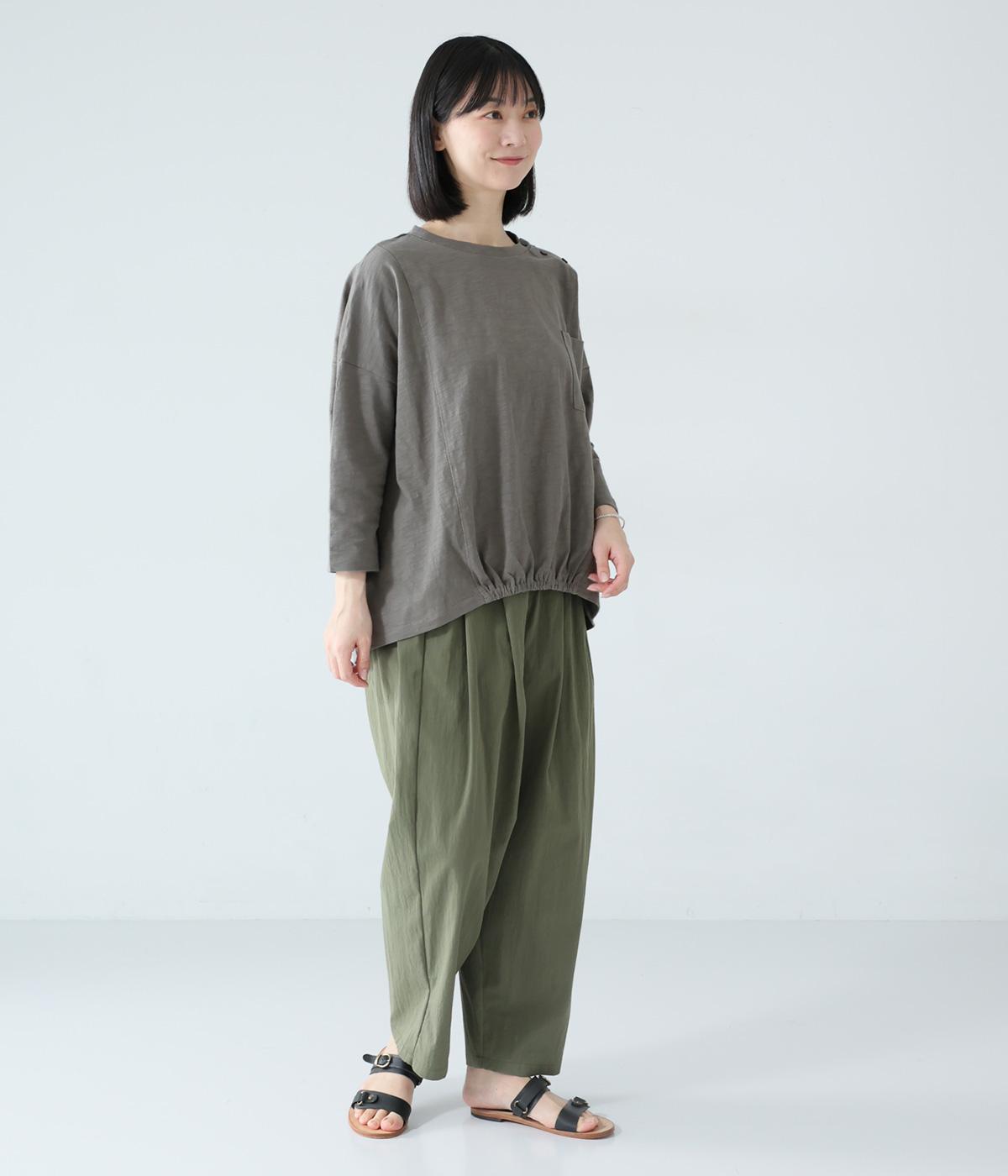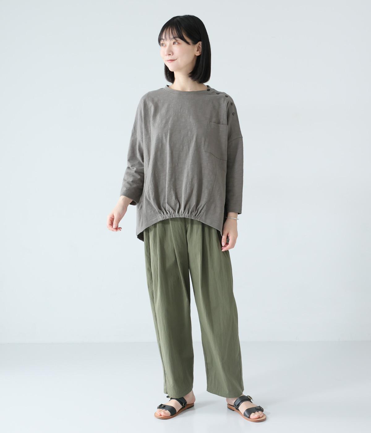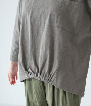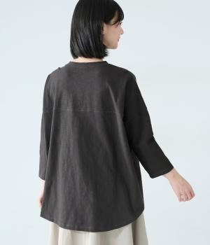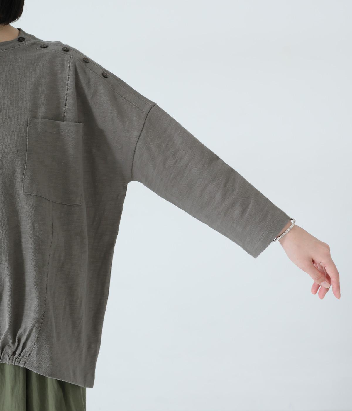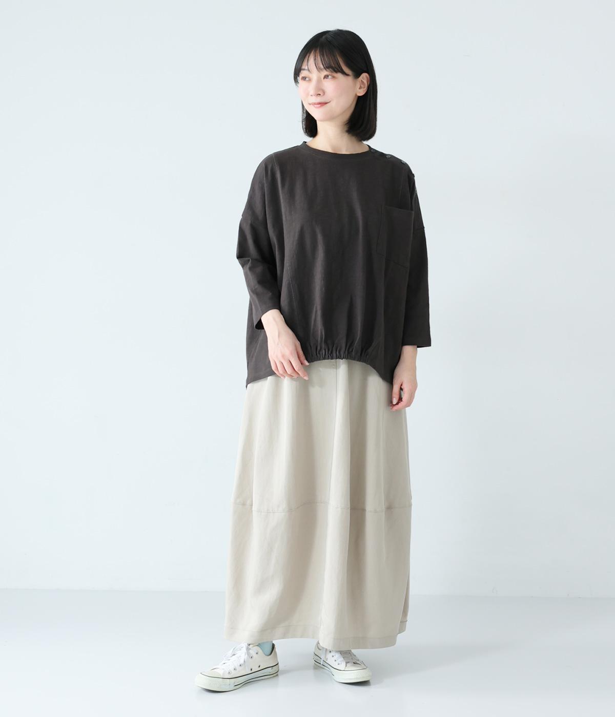 ゆったりとしたボックスシルエットに、前裾のゴムでやわらかな丸みをもたせたプルオーバーです。肩にあしらったボタンがさりげないアクセントを添え、シンプルながら細部にニュアンスを感じる一枚に仕上げています。