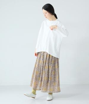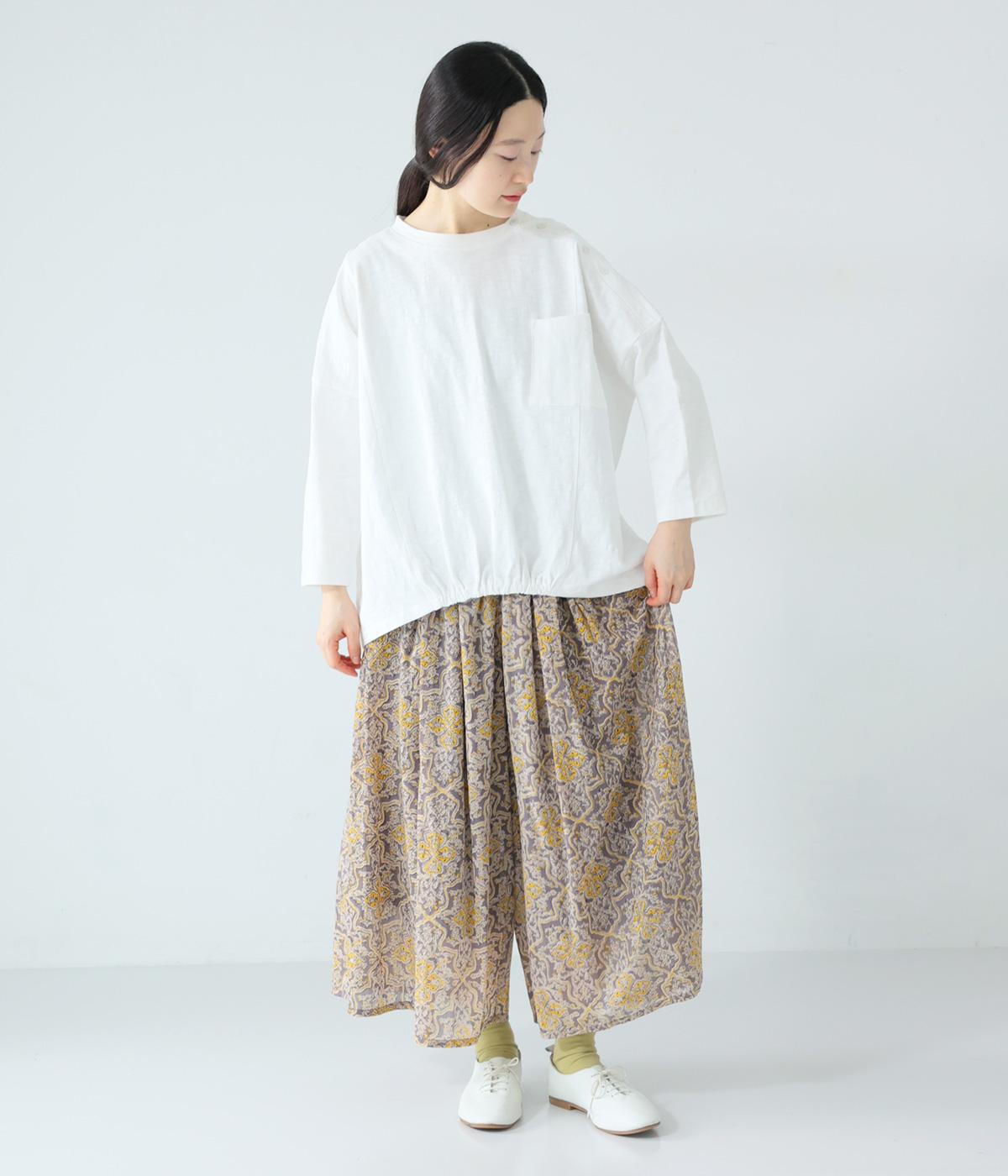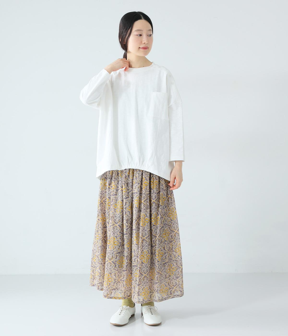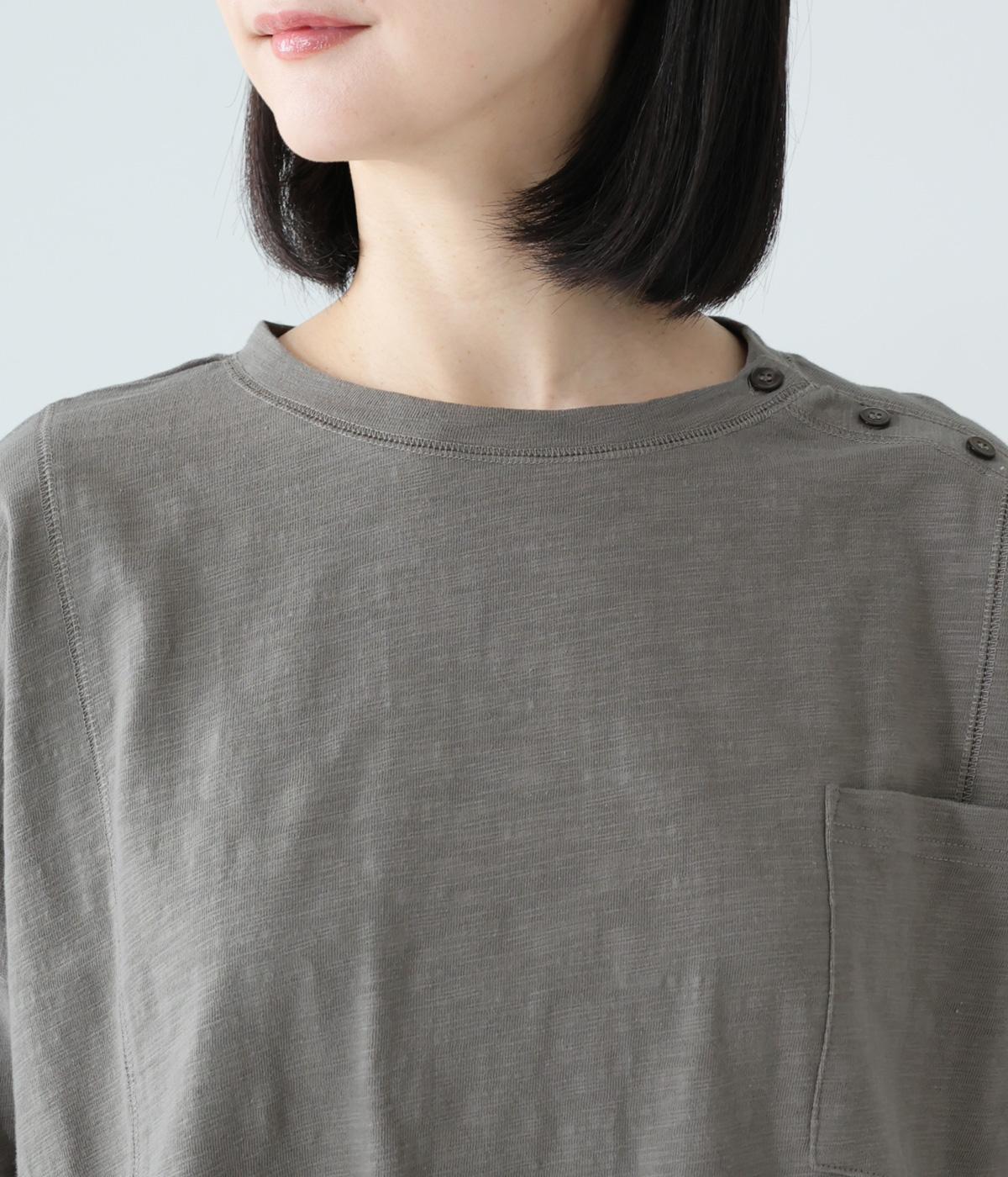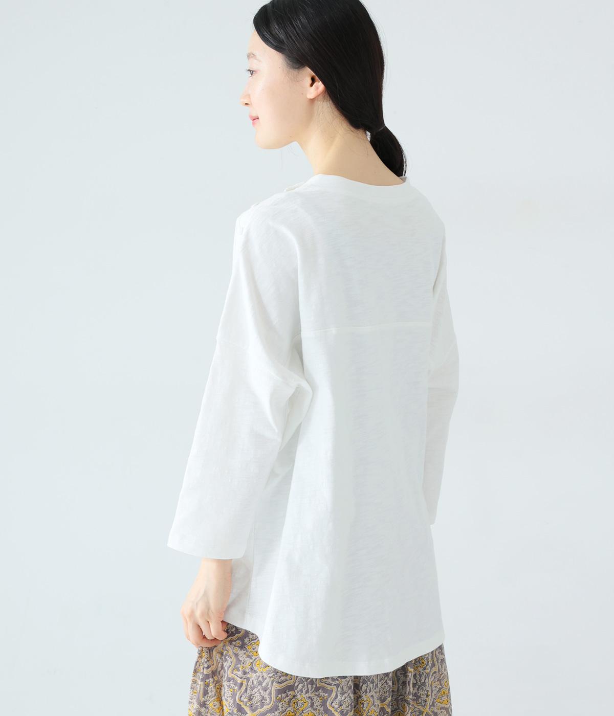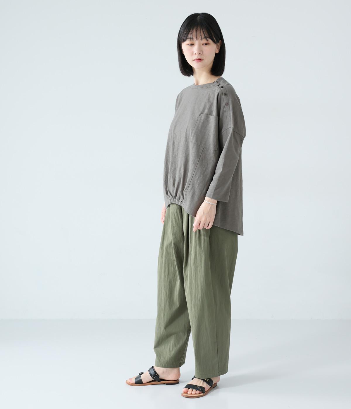 ゆったりとしたボックスシルエットに、前裾のゴムでやわらかな丸みをもたせたプルオーバーです。肩にあしらったボタンがさりげないアクセントを添え、シンプルながら細部にニュアンスを感じる一枚に仕上げています。