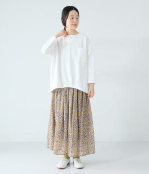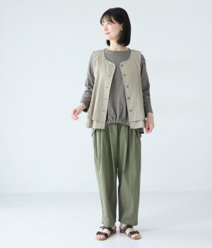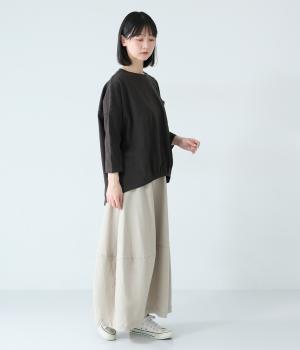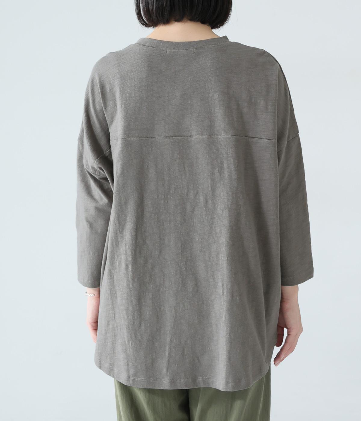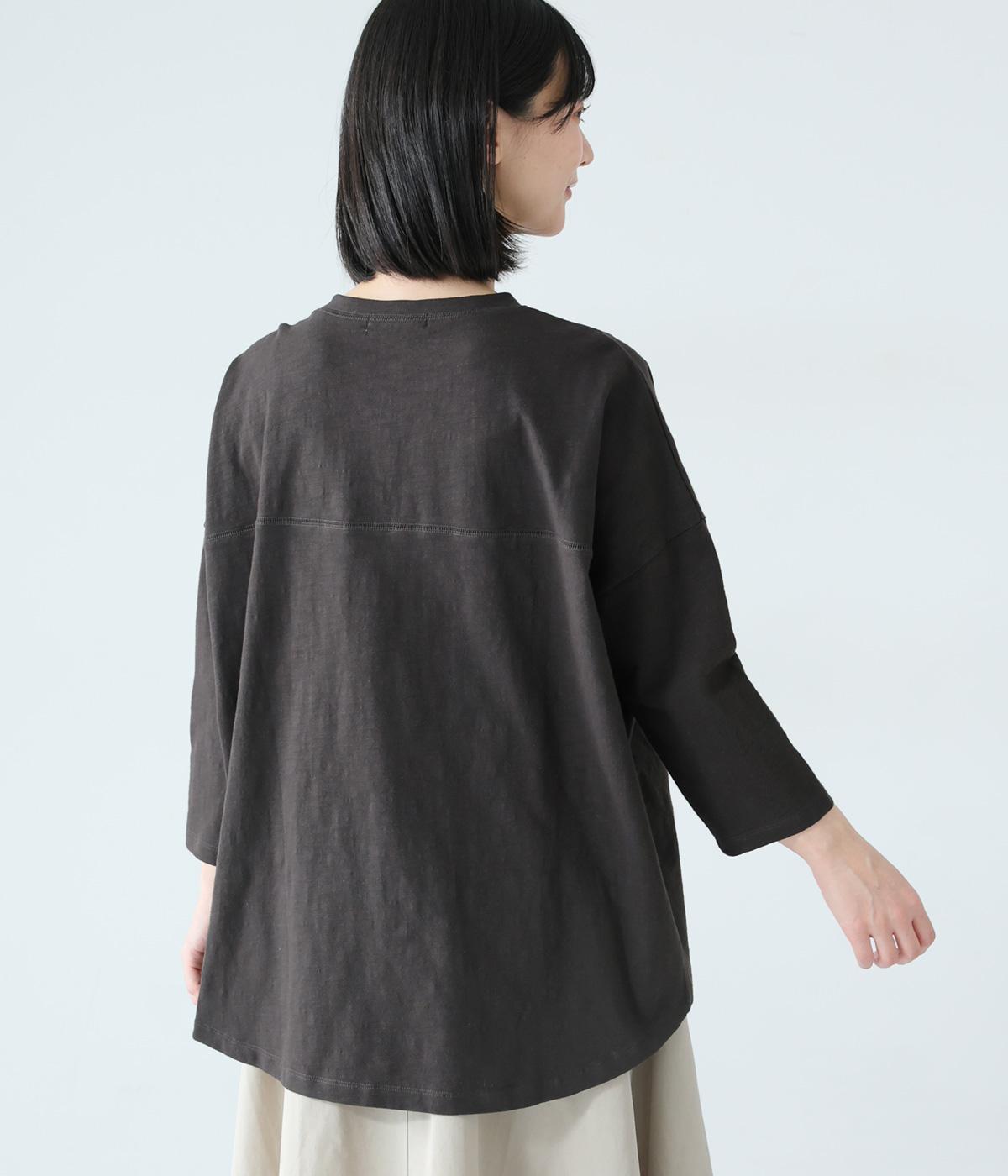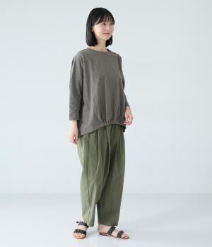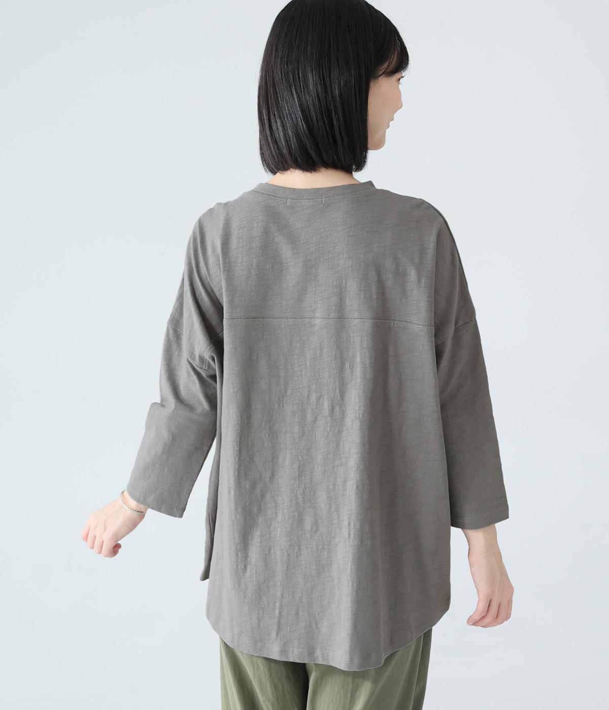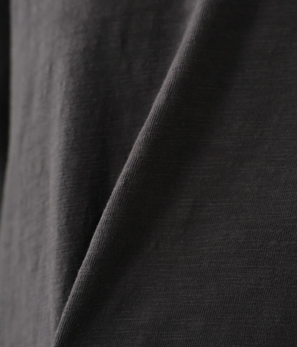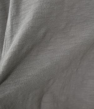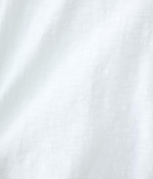 太さにムラのあるスラブ糸で編み立てたコットン天竺生地。ほどよい厚みがあり、編み目を詰めることで型崩れしにくく仕上げました。さらりとした肌ざわりで心地よく着られます。