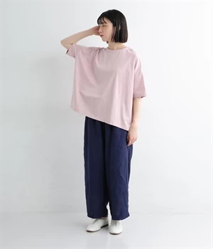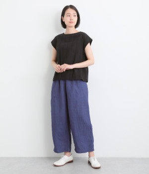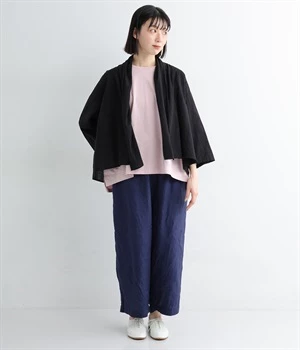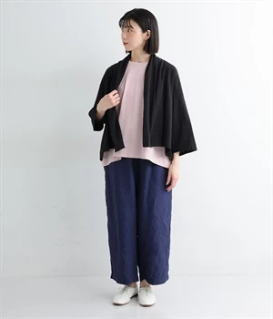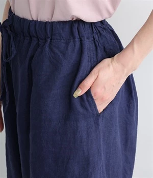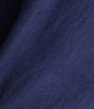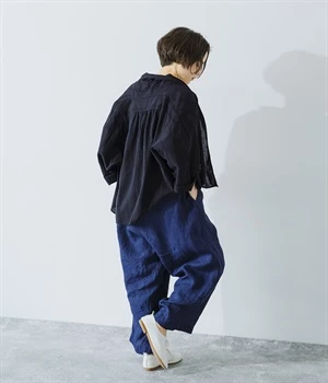 薄手ながらハリコシのあるしっかりとした手触りが特徴的なリネン生地を使用しています。インディゴ染め特有の深みのある表情が魅力的で、薄手の綿の裏地で透け感をおさえました。