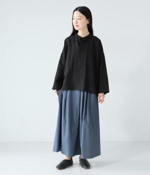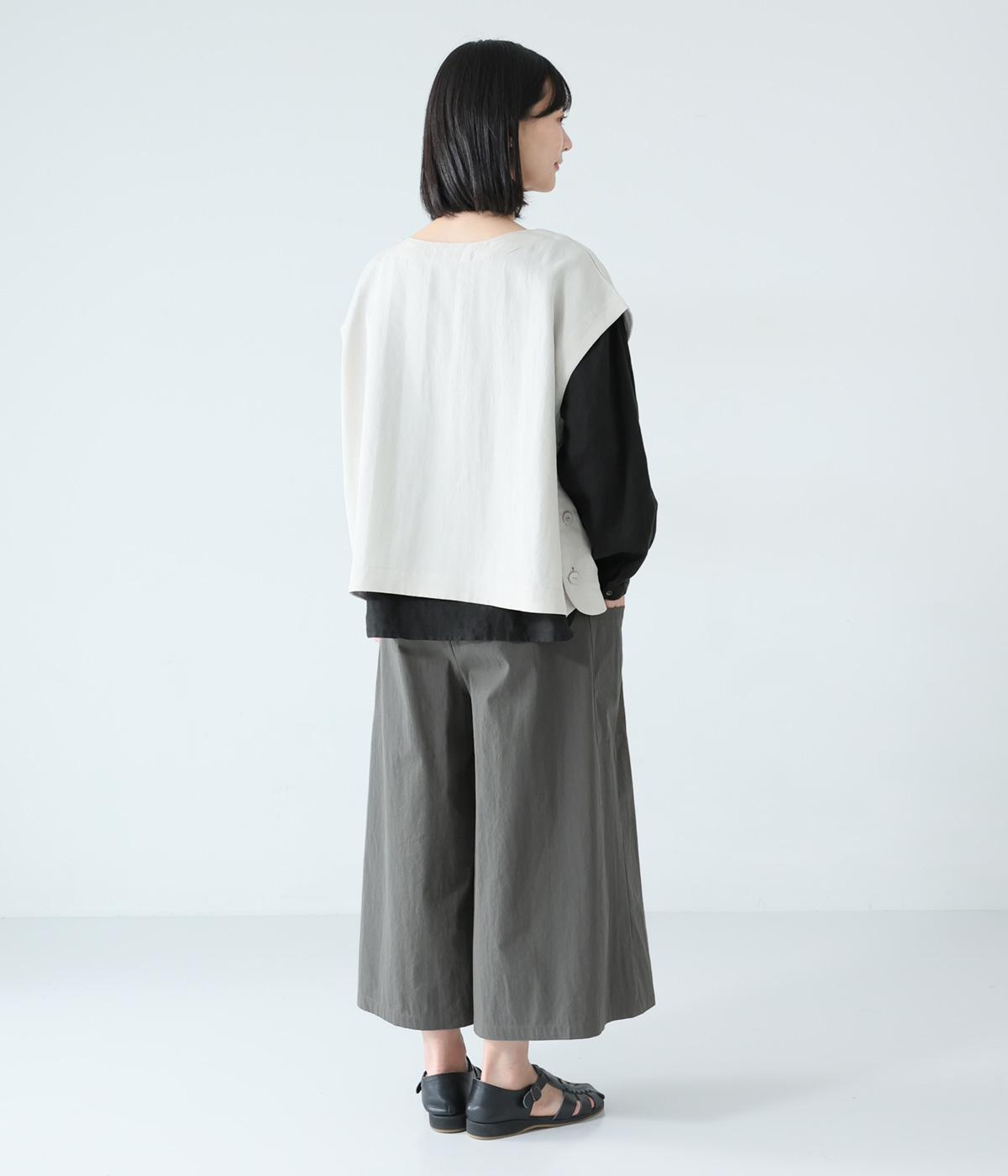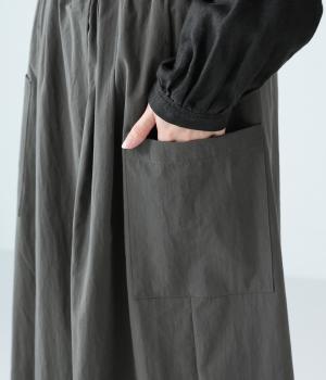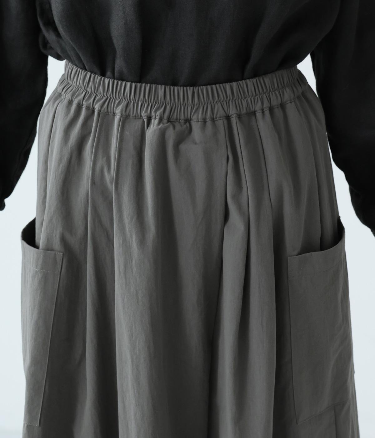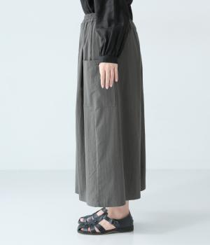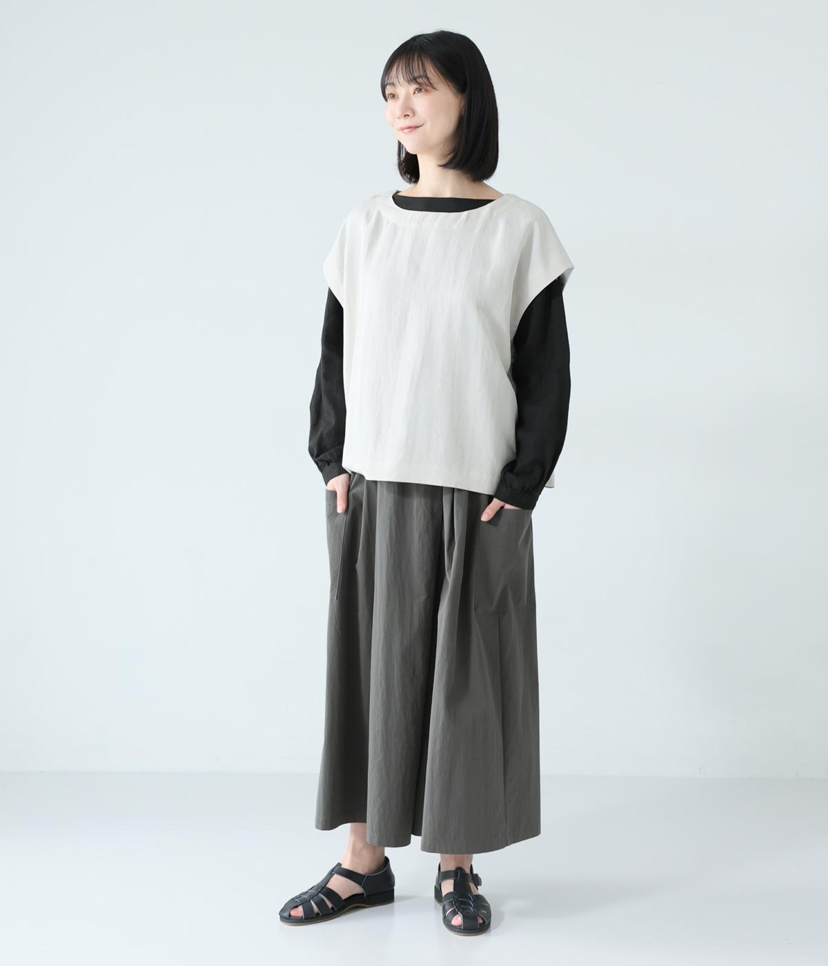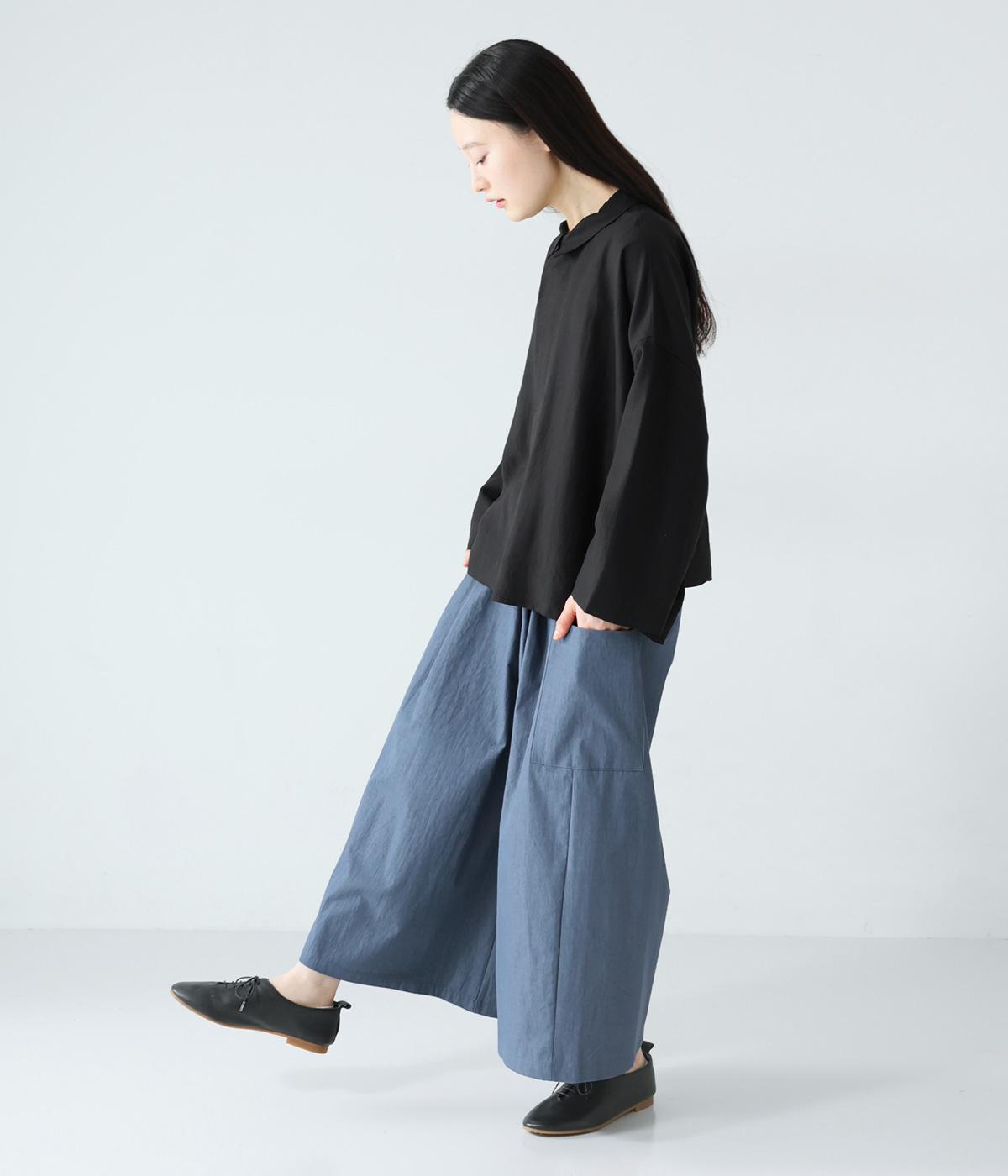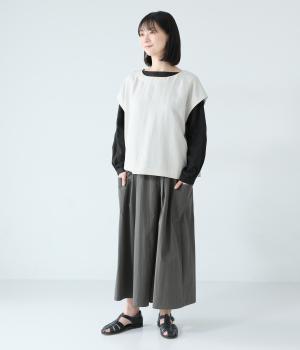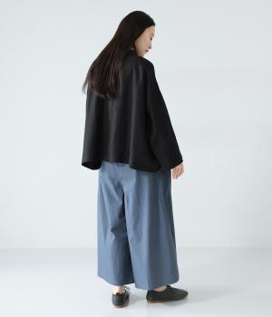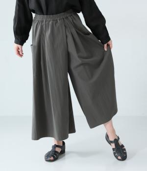 たっぷりとした生地にタックをほどこしたボリュームのあるパンツです。ゆるやかに広がるラインがやわらかな動きを生み、サイドポケットがシルエットにさりげないアクセントを添えています。ウエストは総ゴム仕様で、気負いなく穿ける一枚です。