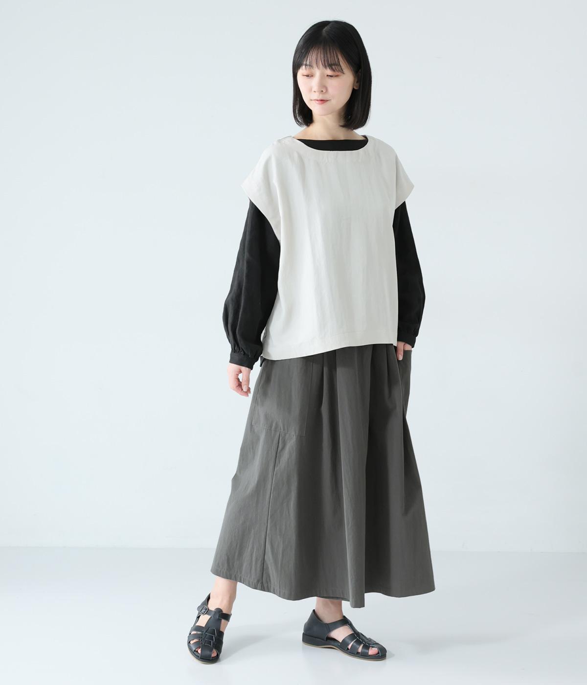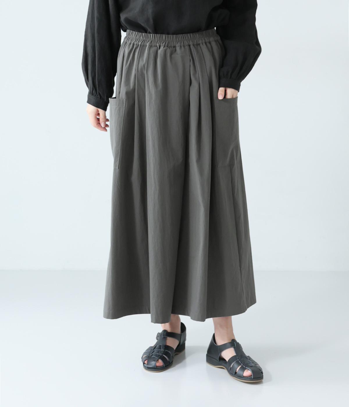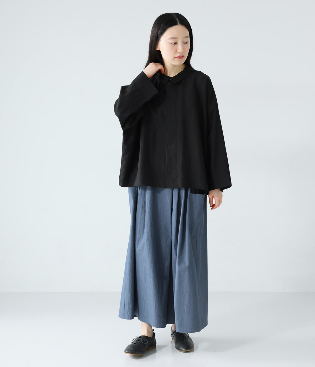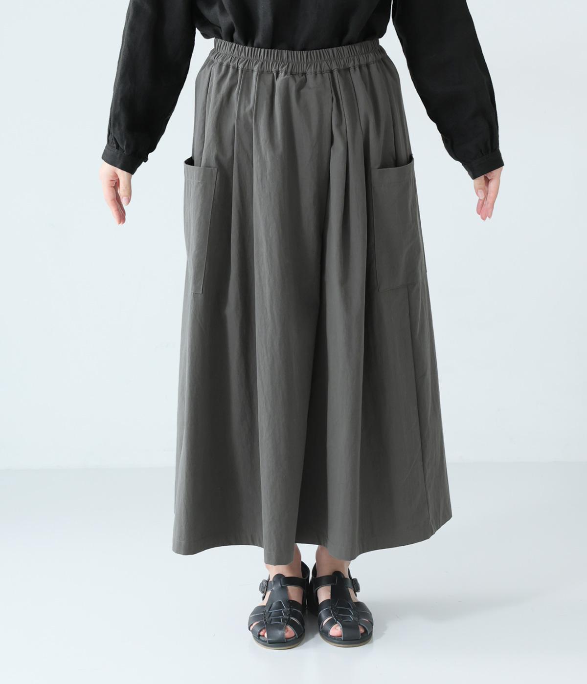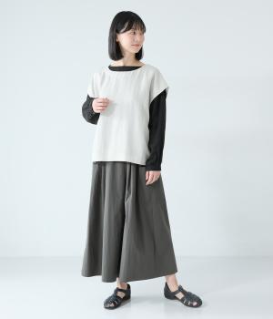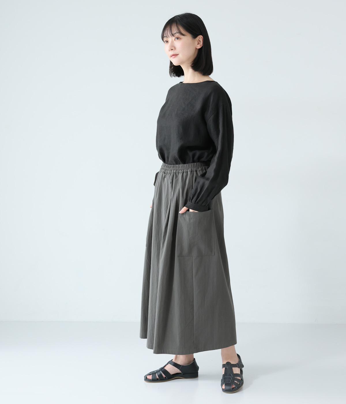 たっぷりとした生地にタックをほどこしたボリュームのあるパンツです。ゆるやかに広がるラインがやわらかな動きを生み、サイドポケットがシルエットにさりげないアクセントを添えています。ウエストは総ゴム仕様で、気負いなく穿ける一枚です。