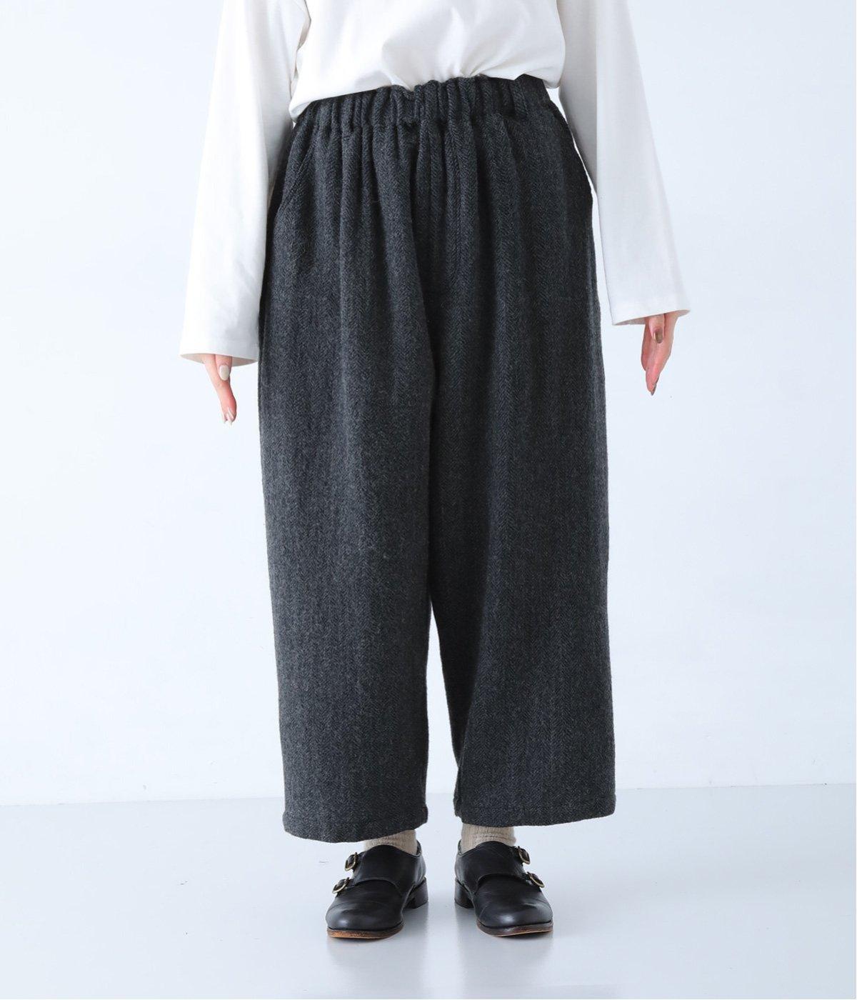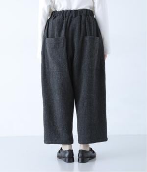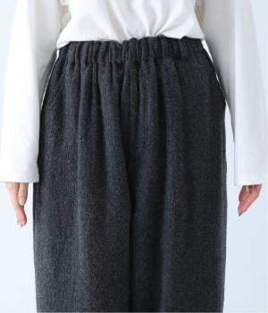 総ゴム仕様のウエストからたっぷりとギャザーを広げ、ワイドシルエットに仕上げました。イージーな着用感ながらも、品のよいヘリンボーン生地がラフな印象を軽減。後ろにつけた大きなポケットがお尻のラインをカモフラージュしてくれます。