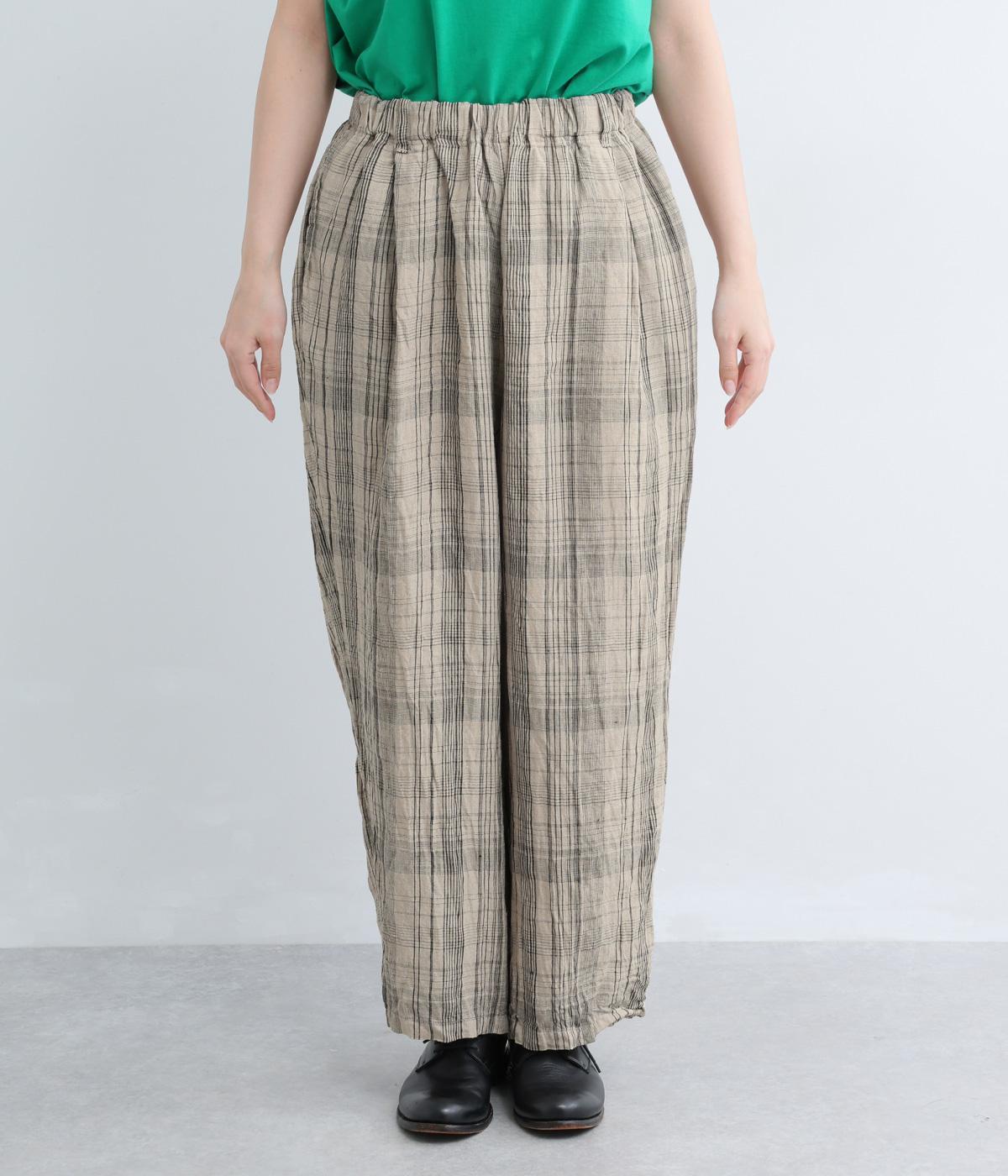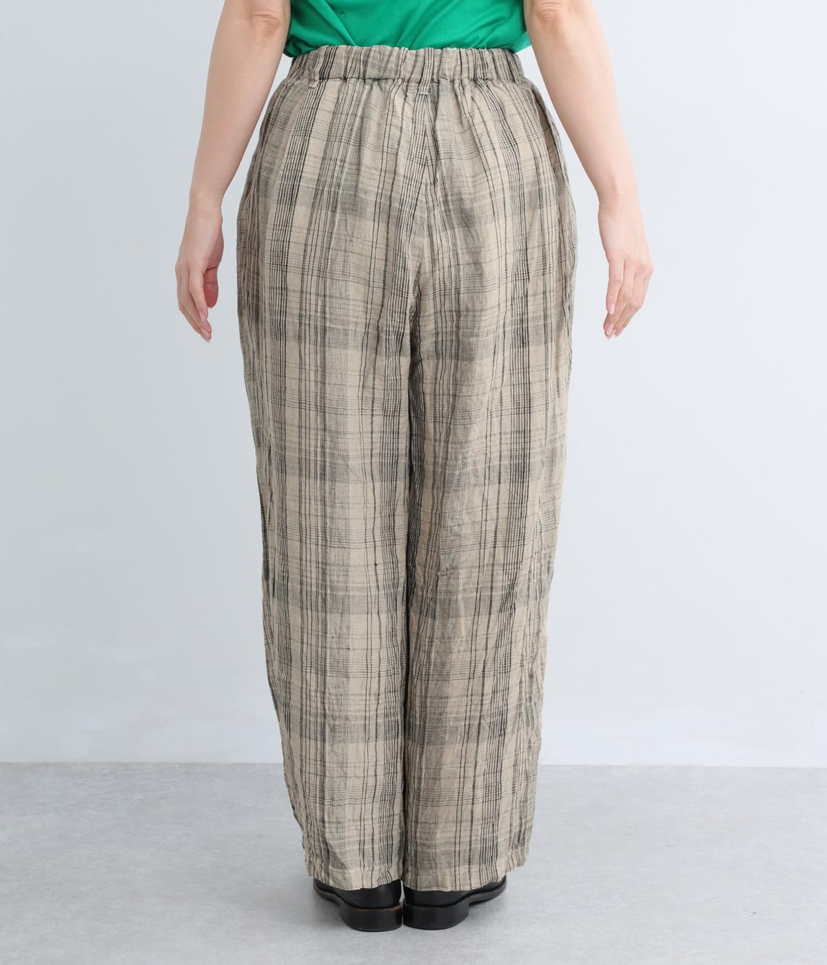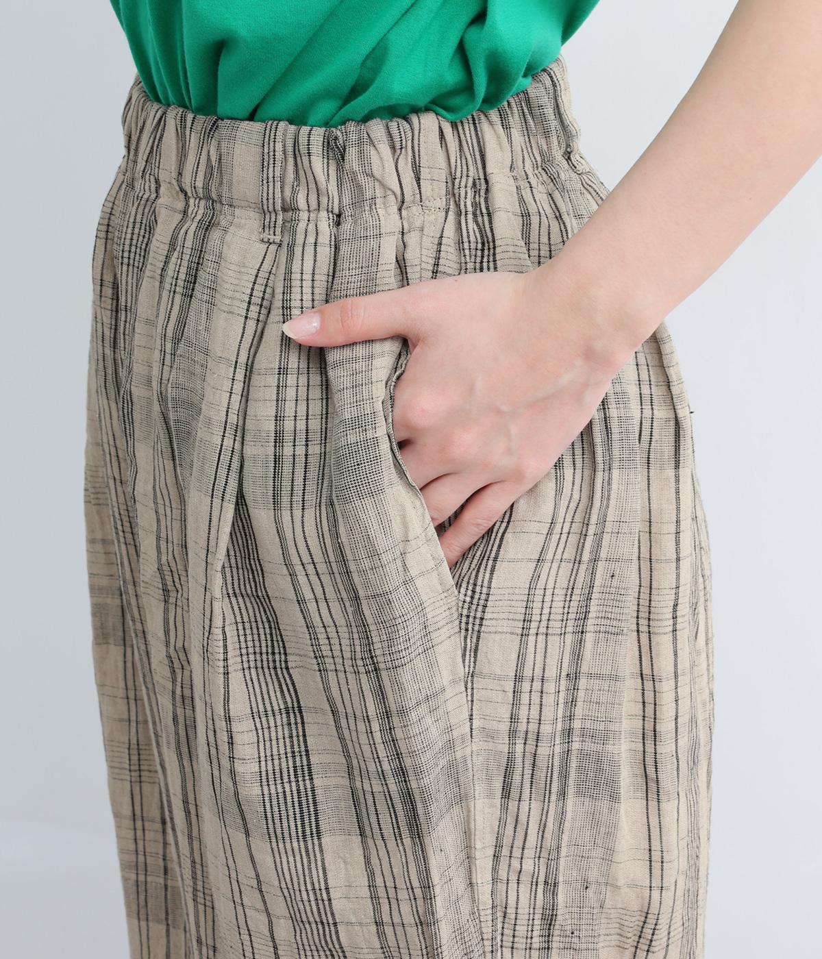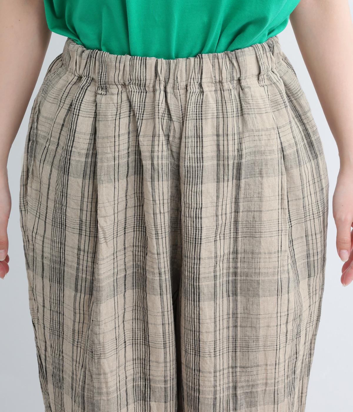 素材の風合いを生かしたナチュラルなチェック柄が、装いに自然体で柔らかな雰囲気をもたらします。コットンの裏地付きで肌あたりもよく、ウエストゴムと内紐の仕様でリラックスした安心の穿き心地です。