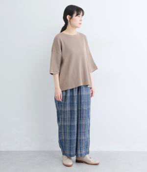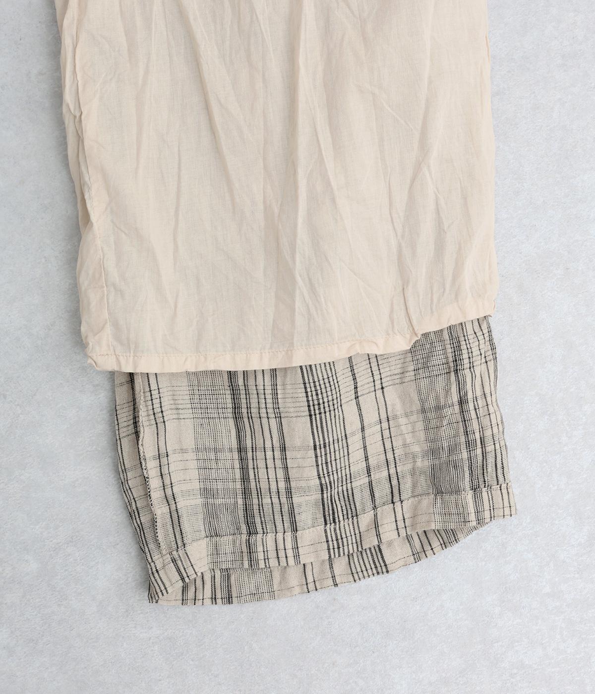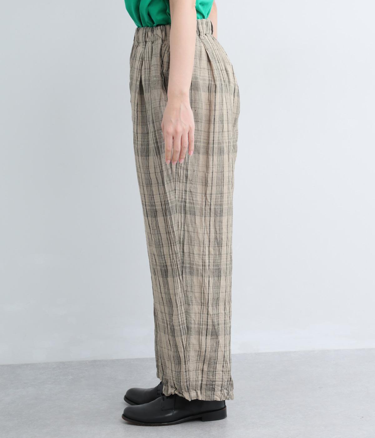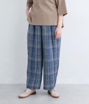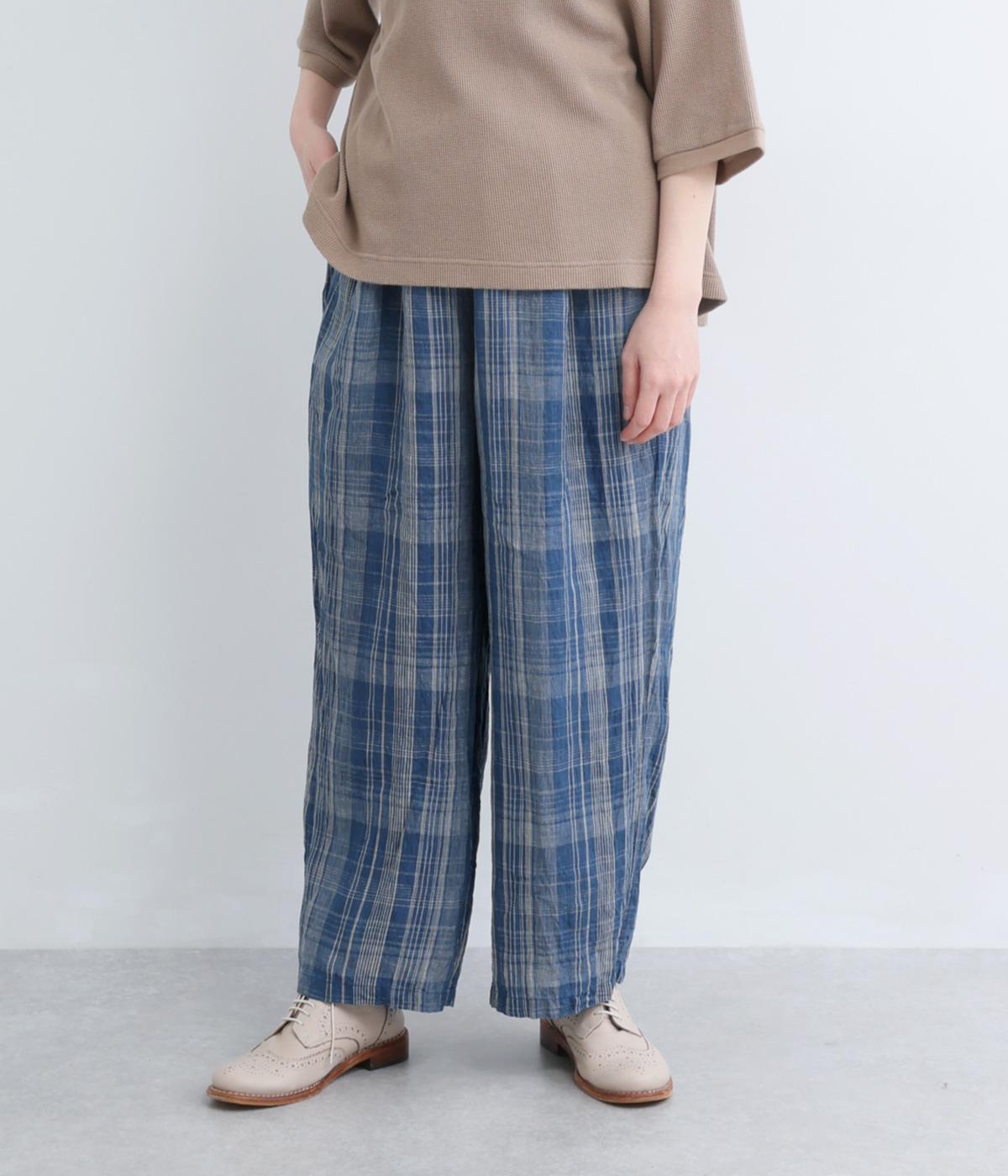 素材の風合いを生かしたナチュラルなチェック柄が、装いに自然体で柔らかな雰囲気をもたらします。コットンの裏地付きで肌あたりもよく、ウエストゴムと内紐の仕様でリラックスした安心の穿き心地です。