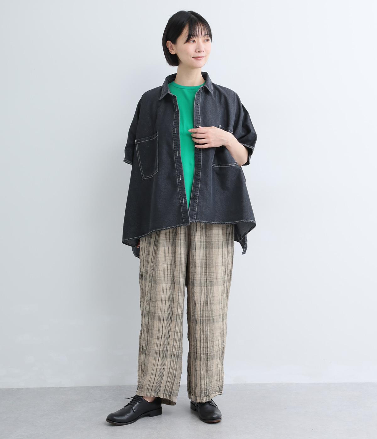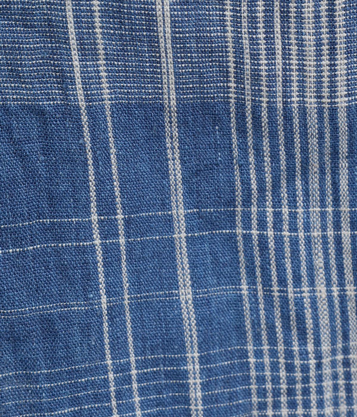やや薄手でシャリ感のあるリネン生地を使用しています。コシがありながらも、着込むほどにやさしく肌になじみます。インディゴ染めによる深みとネップの表情が、味わい深い素材感です。