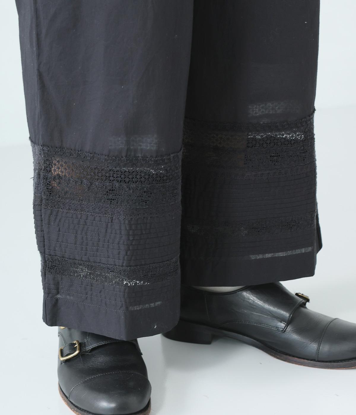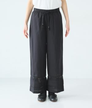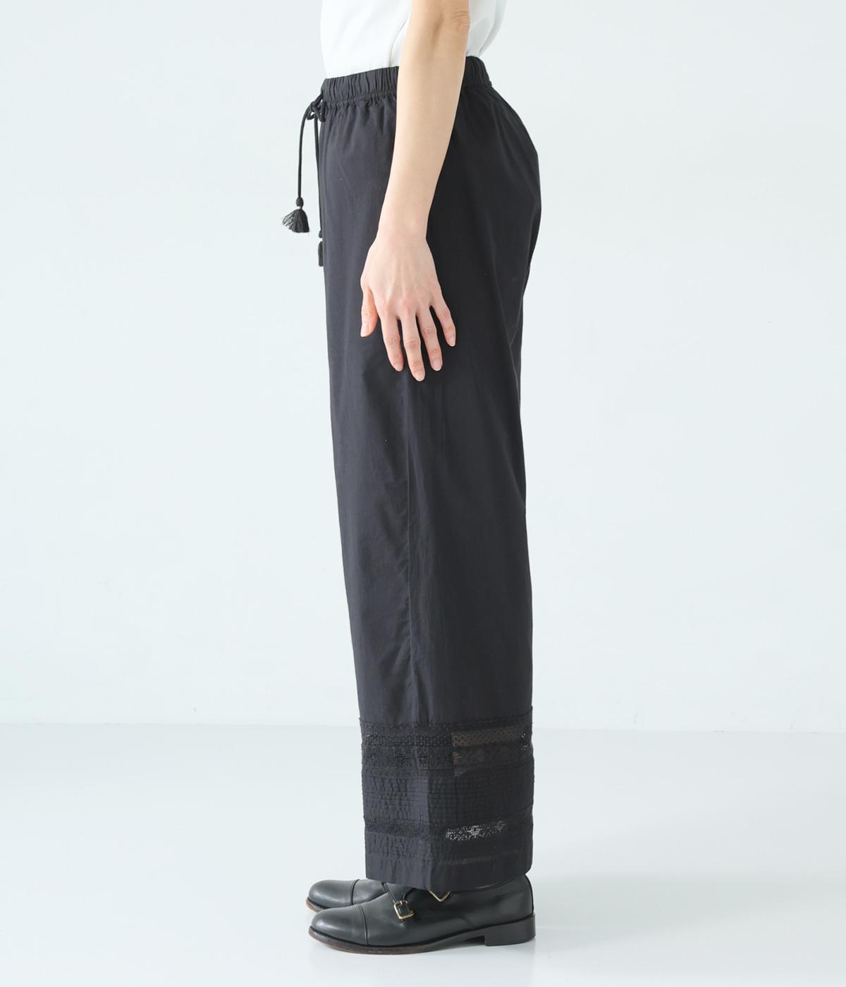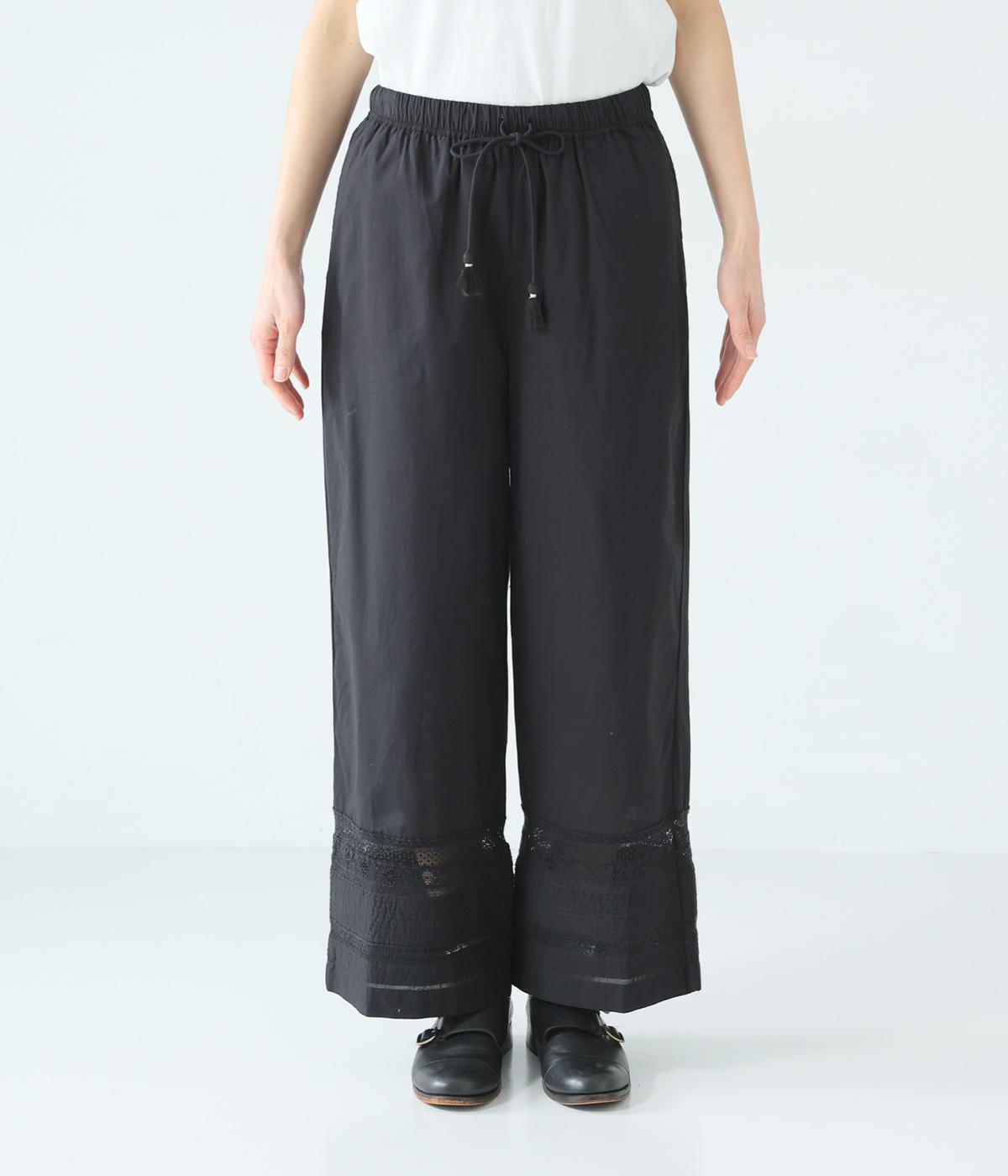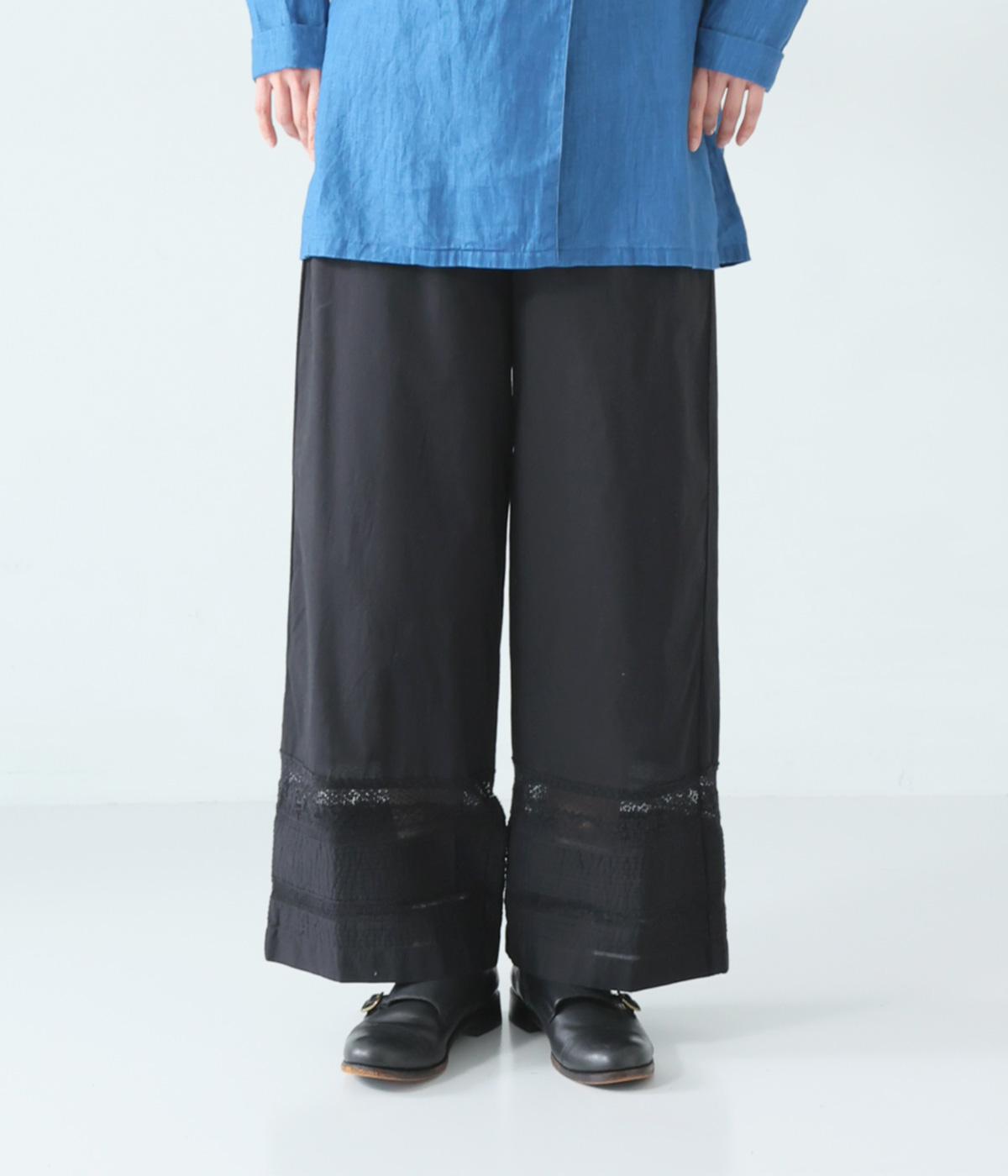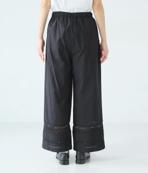 ゆったりとしたシルエットに裾のレースが足元に抜け感を添えます。ワンピースのインナーとしてレースをちらりとのぞかせる着こなしもおすすめです。裏地付きで透け感を気にせず穿け、ウエストはゴム仕様でリラックス感のある着心地です。