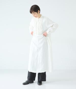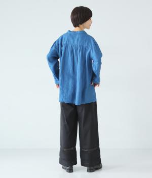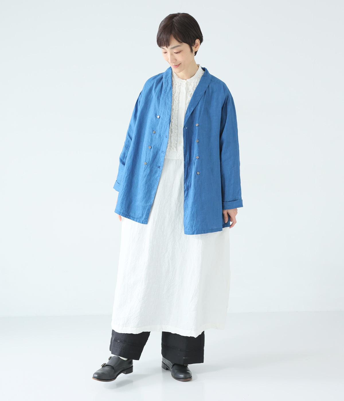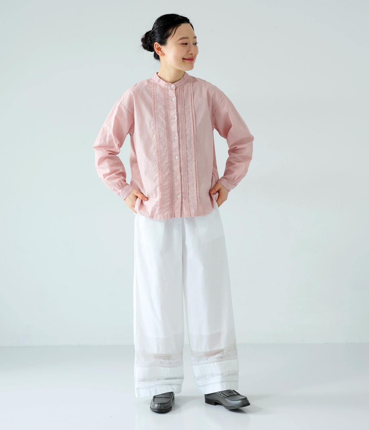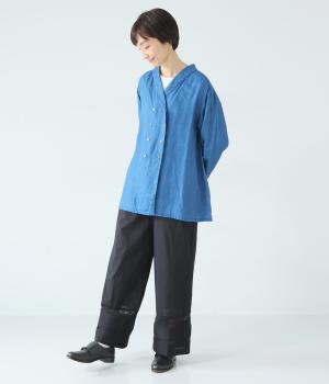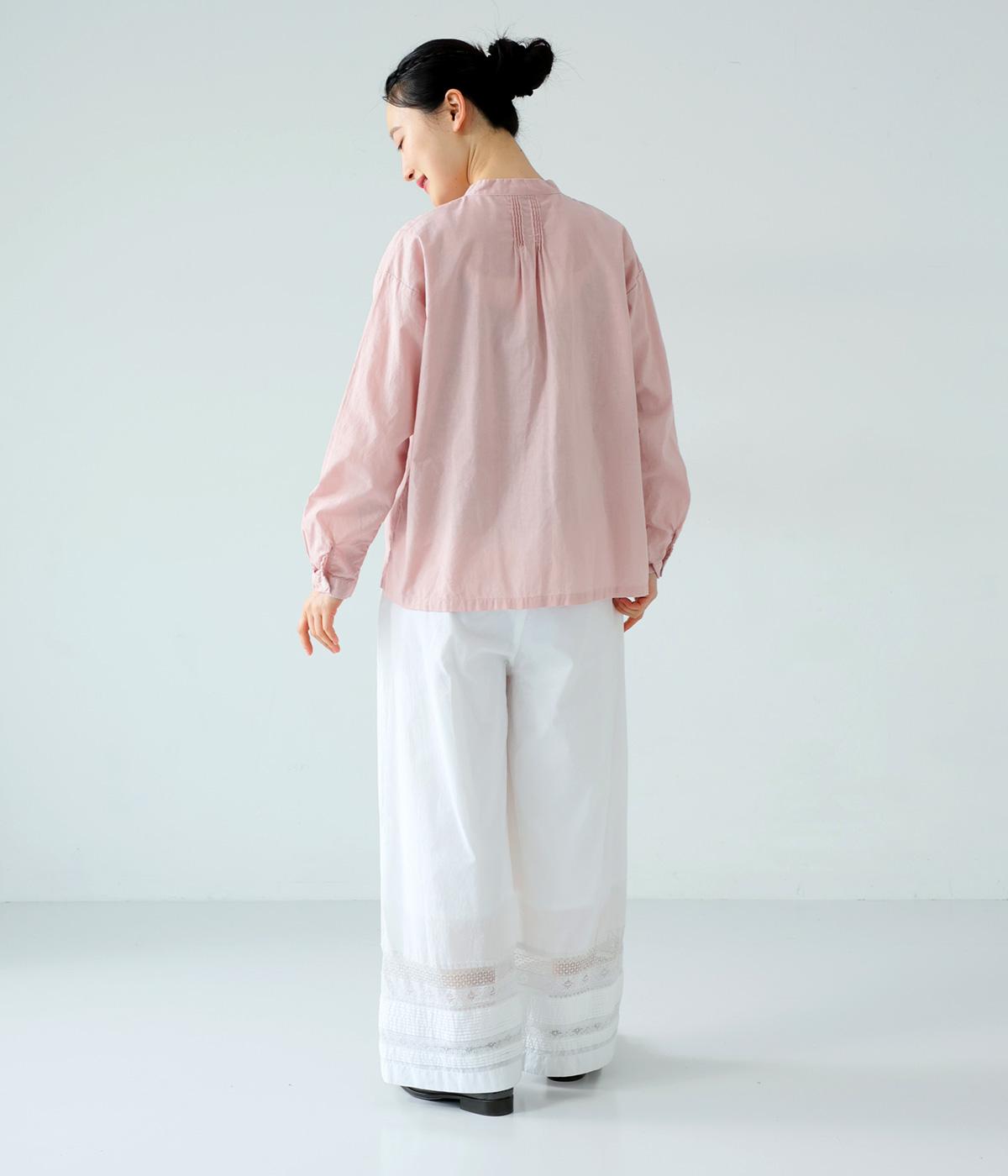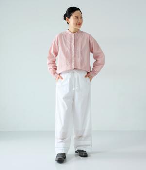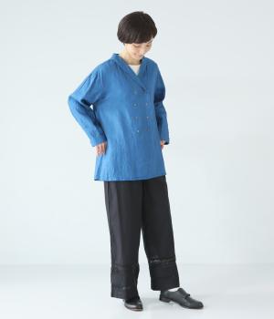 インドコットンならではの自然な色ムラが奥行きを生む生地。通気性が高く、さらりとした肌ざわりで心地よく着用できます。素朴さの中にやわらかさを感じる、風合い豊かな素材感です。