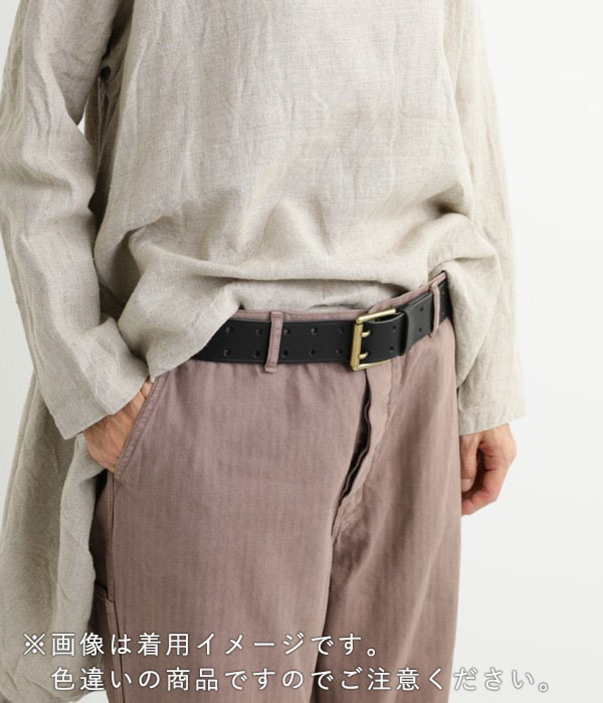 上質な本革を使用した2つ穴ベルトです。やや太めのデザインで、スタイリングにさりげない存在感をプラス。ワイドパンツに合わせたり、ゆったりとしたワンピースのブラウジングに使ったり、一つあるとアレンジの幅が広がります。マットな風合いのレザーで、ナチュラルな着こなしになじみやすいのがうれしいところ。使い込むほどにやわらかく味わいが増す、レザーの経年変化も楽しめます。
