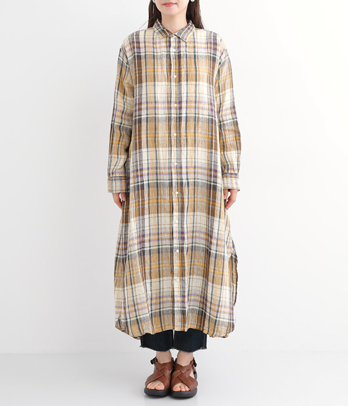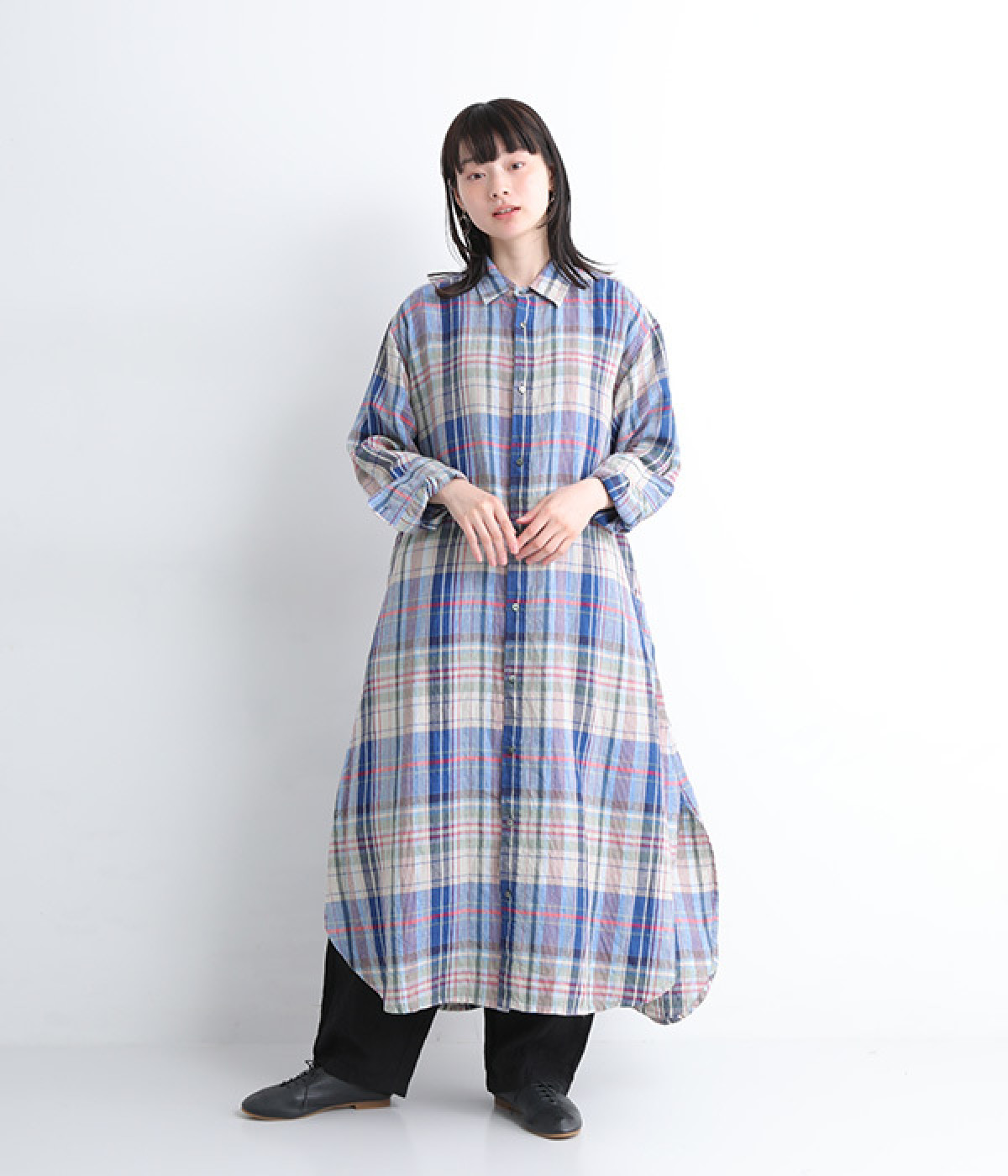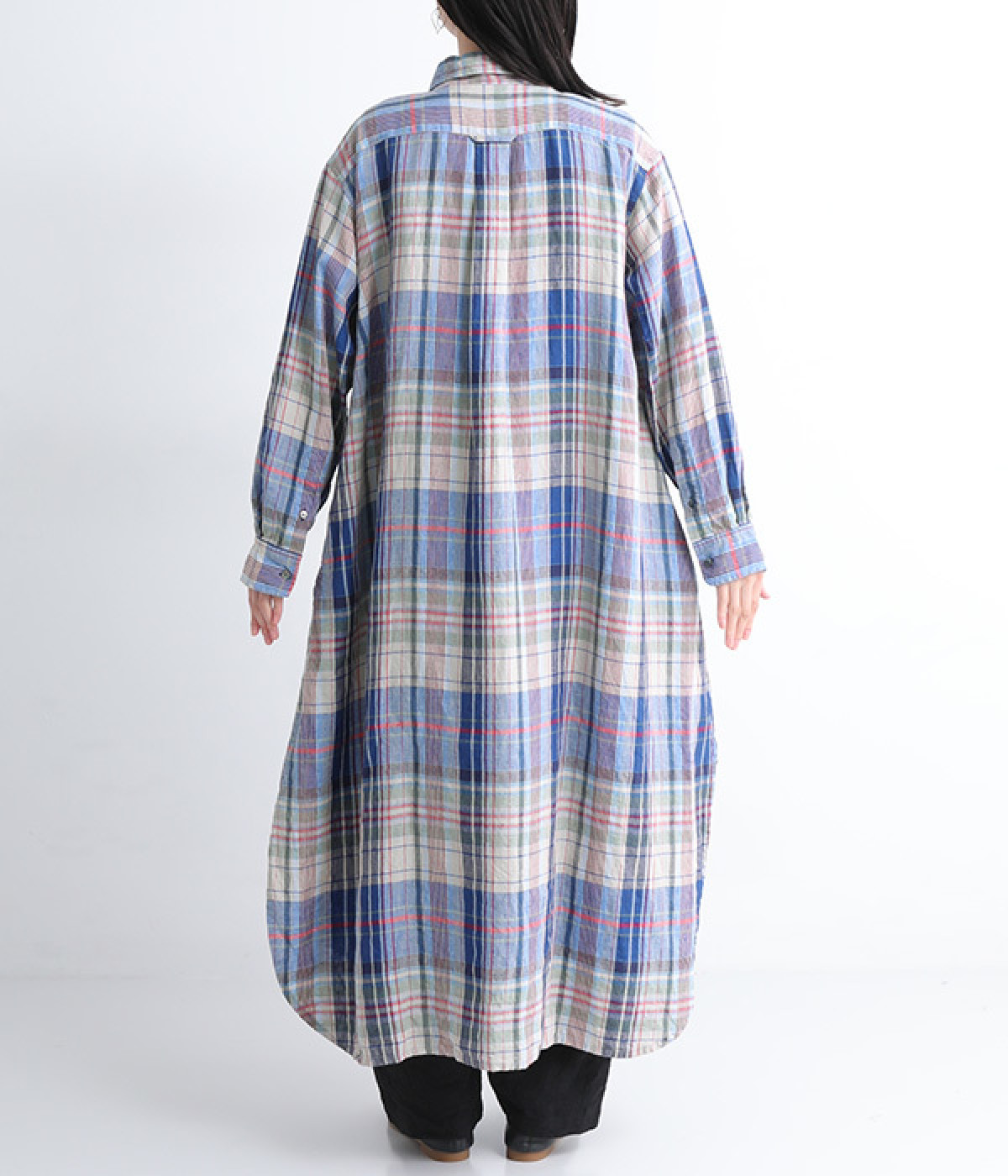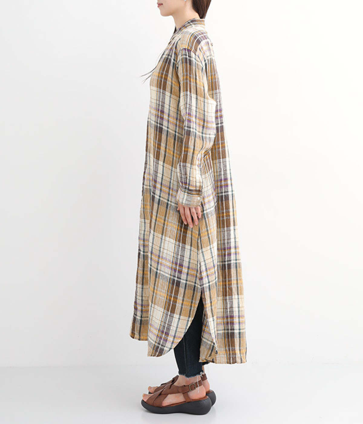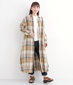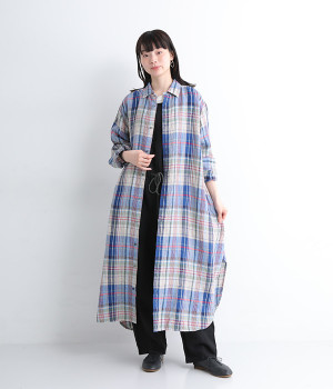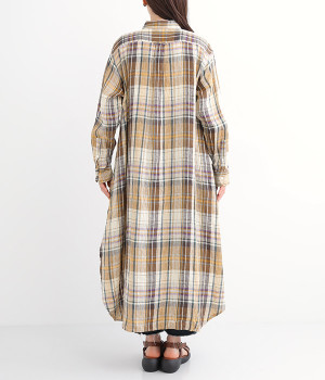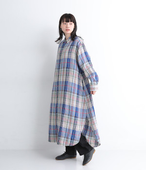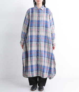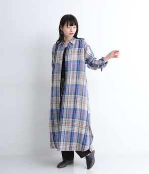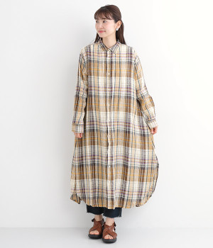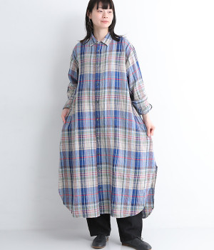 多色を使用して自然と目を惹くチェックを描いたシャツドレス。洗いざらしそのままのような、たっぷりのシワとリネンのナチュラルな手ざわりを味わえる一枚です。サイド裾の大胆なラウンドカットは、重ねたボトムをしっかりとのぞかせて開放感たっぷり。インナーを重ねるゆとりのあるビッグシルエットは、羽織りとしての着用にも向いています。一枚で着るだけでなく、ニットベストやトレーナーと合わせればシーズンをまたいでのスタイリングも可能です。