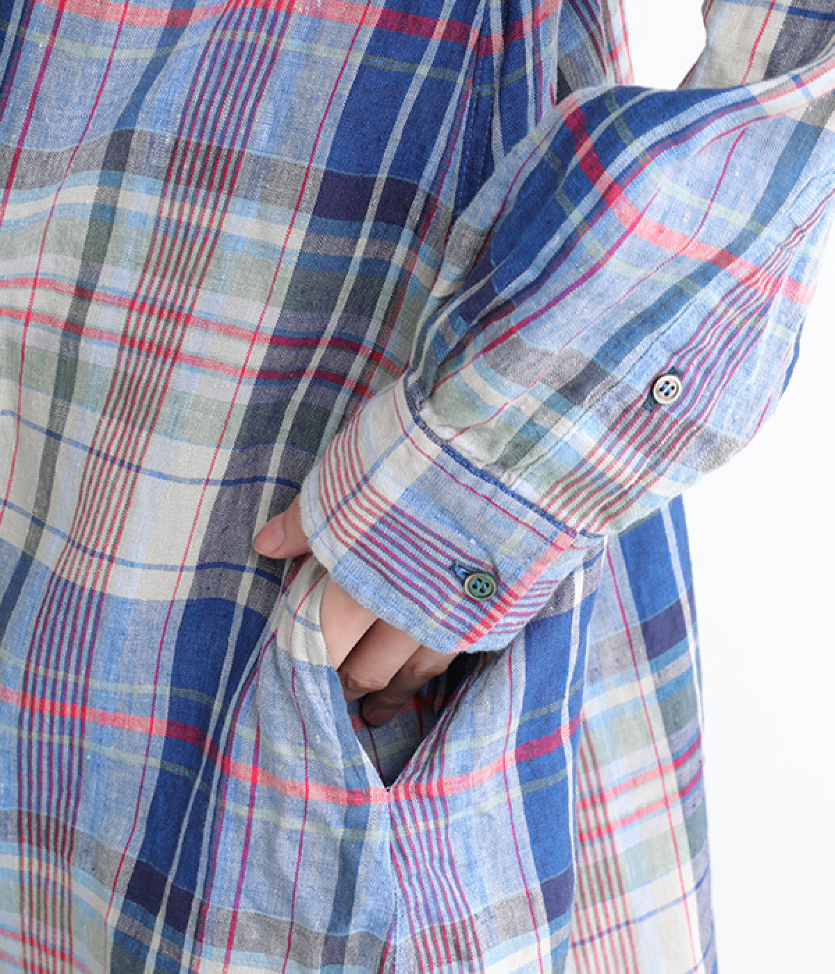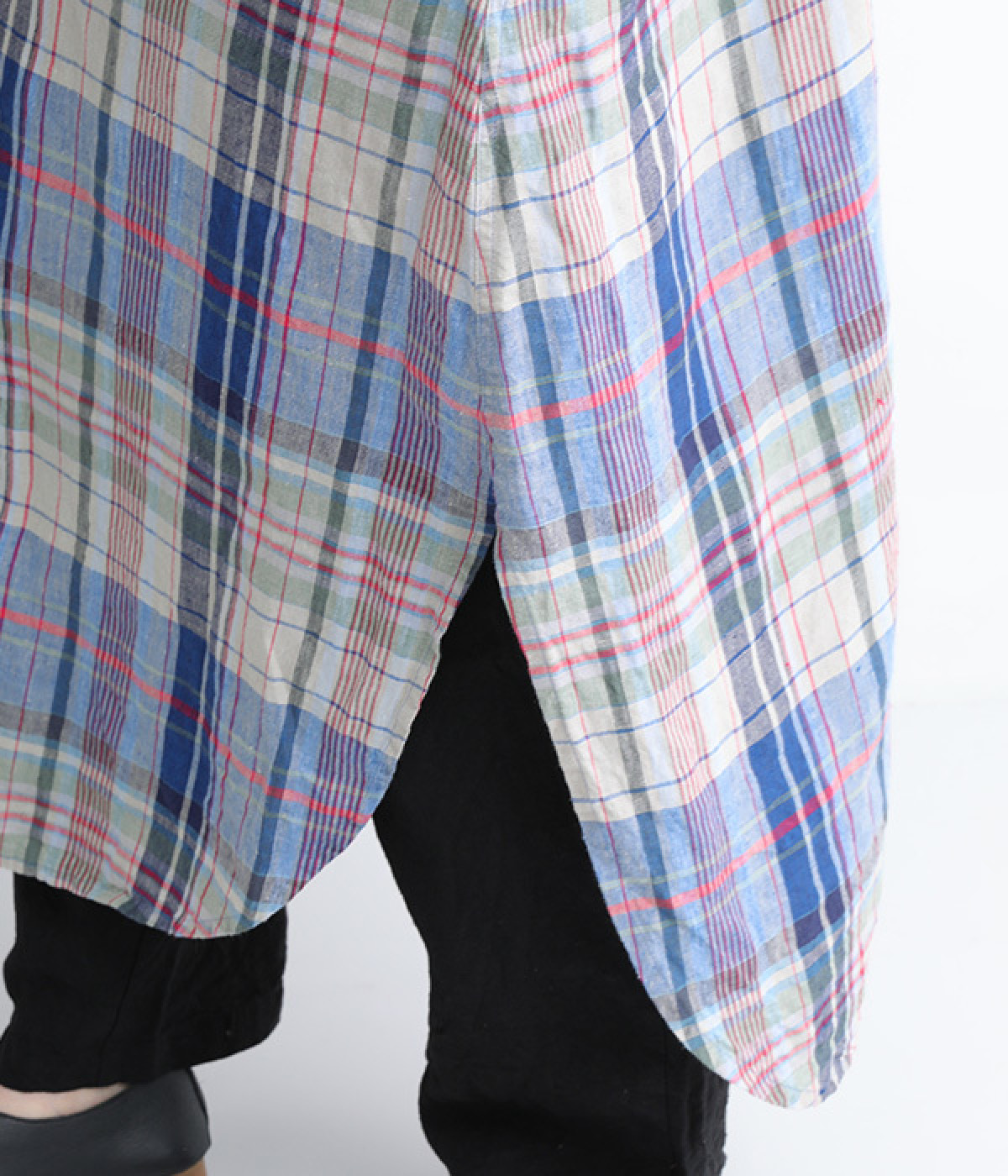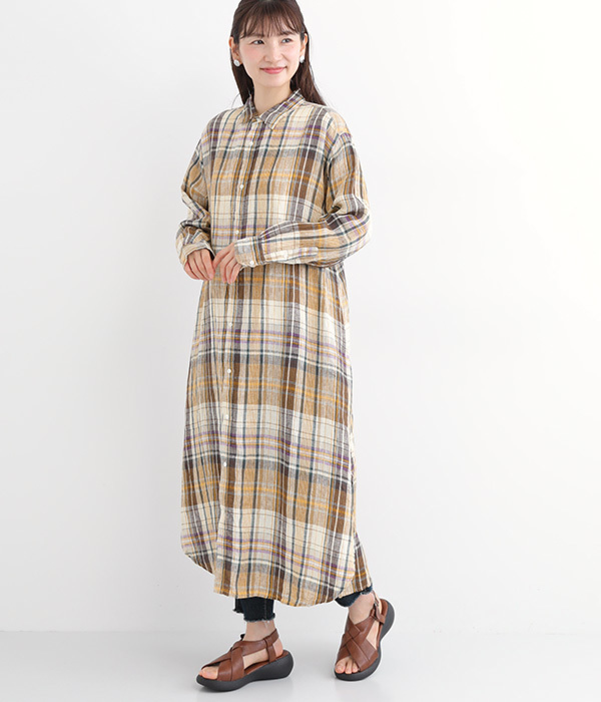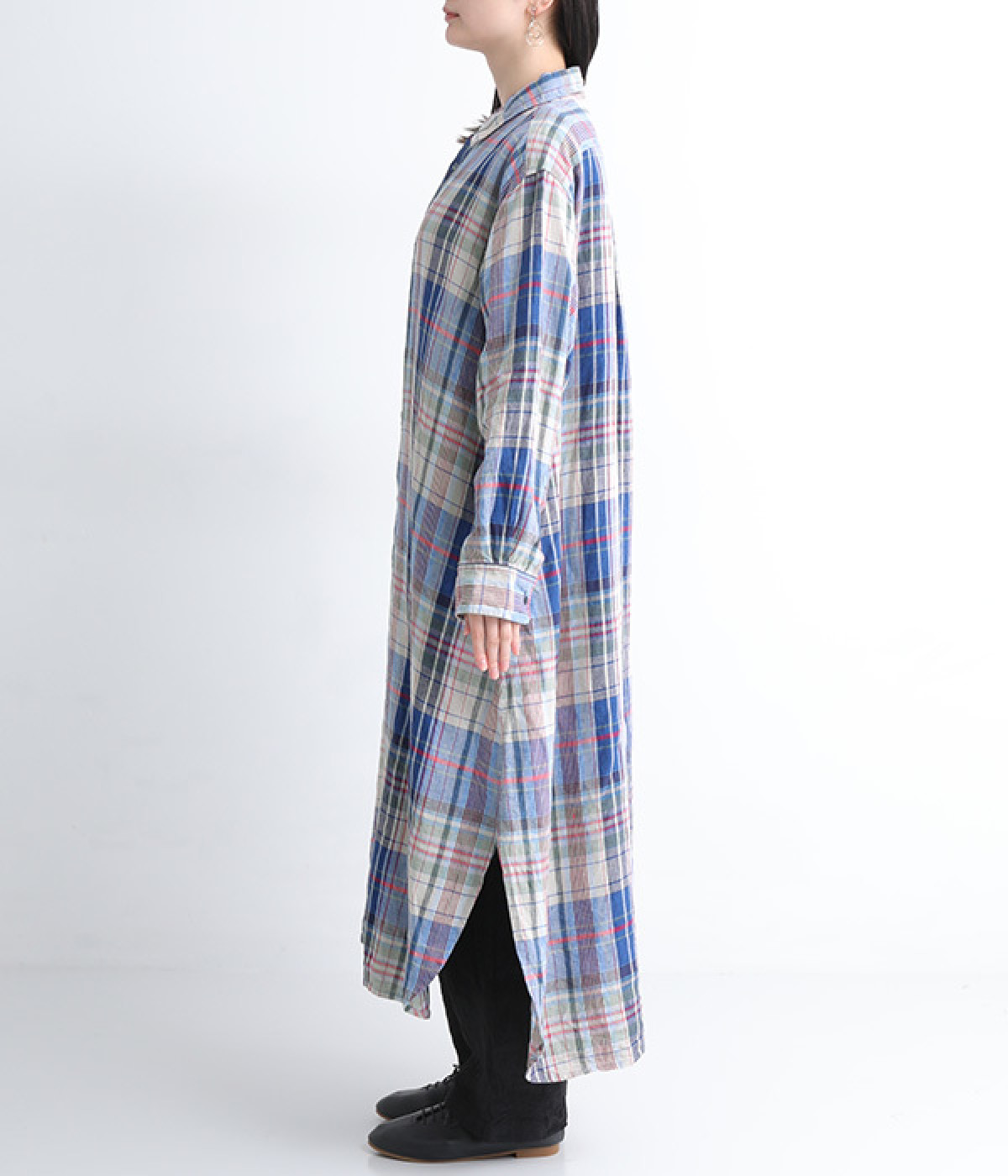 多色を使用して自然と目を惹くチェックを描いたシャツドレス。洗いざらしそのままのような、たっぷりのシワとリネンのナチュラルな手ざわりを味わえる一枚です。サイド裾の大胆なラウンドカットは、重ねたボトムをしっかりとのぞかせて開放感たっぷり。インナーを重ねるゆとりのあるビッグシルエットは、羽織りとしての着用にも向いています。一枚で着るだけでなく、ニットベストやトレーナーと合わせればシーズンをまたいでのスタイリングも可能です。