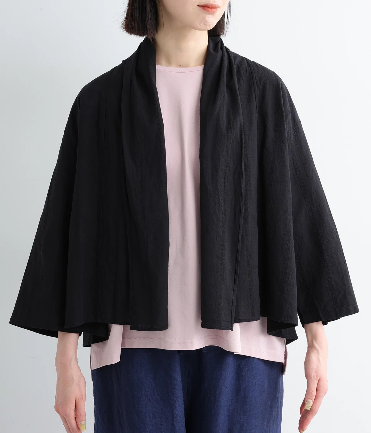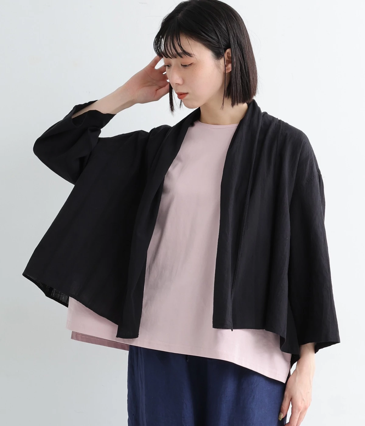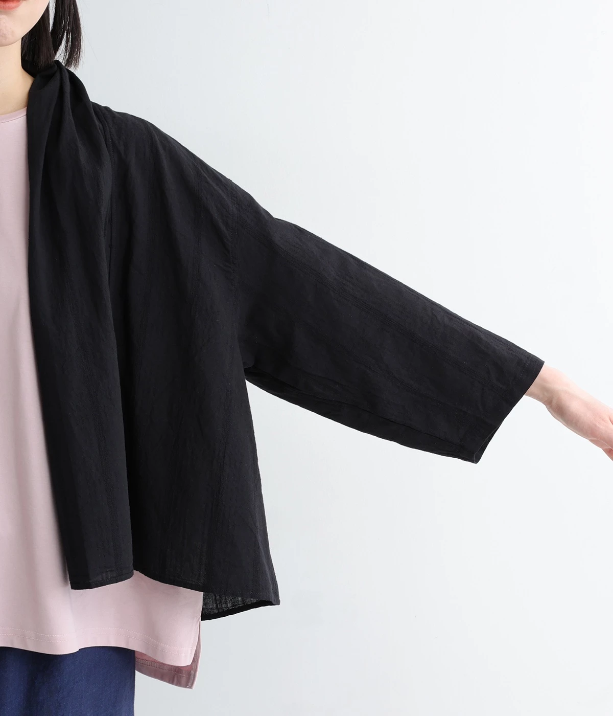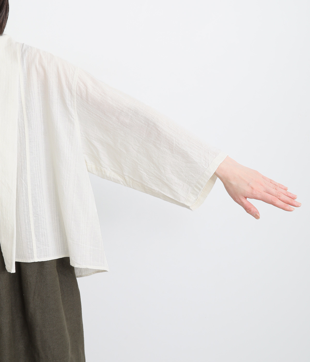 シンプルながらこなれ感あるニュアンスを与えてくれる、ローブタイプの羽織りです。ゆったりとしたつくりで、ワンピースなどボリュームのあるアイテム合わせもスムーズ。汗ばむ季節の冷房対策としても重宝します。