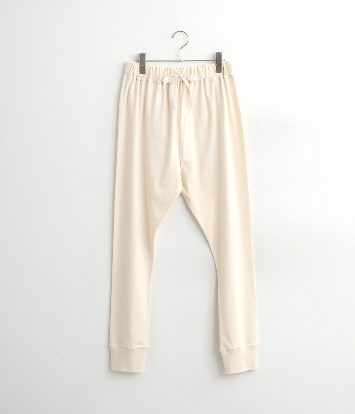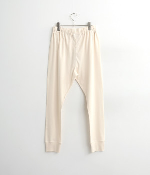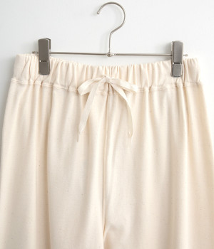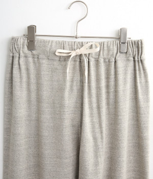 リラックスシーンやワンピースのインナーとして活躍するイージーパンツ。ウエストは幅広めのゴムを採用して、ソフトなフィット感とすっきりとした見え方を両立しています。裾はリブ切り替えで、バランスのいい着こなしに。