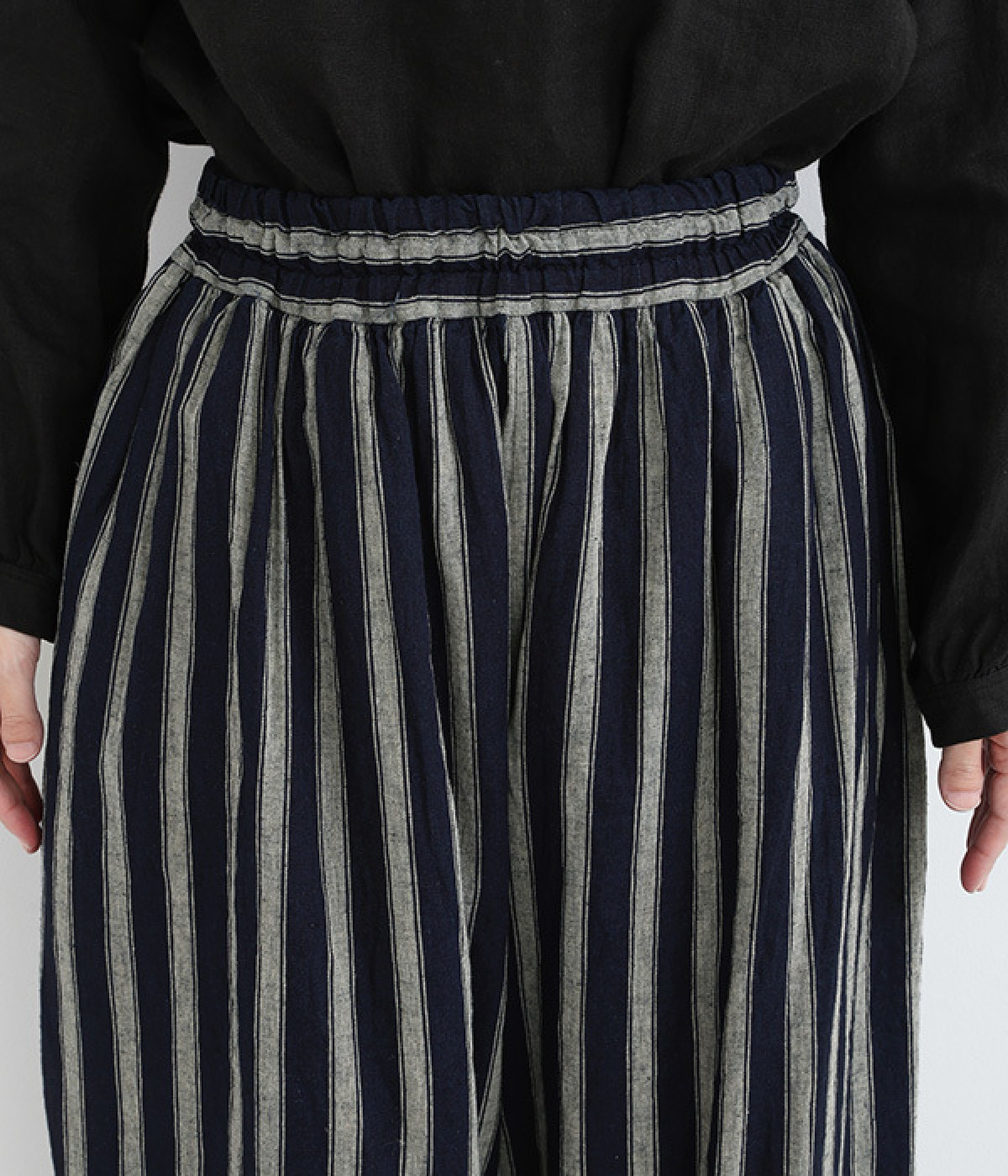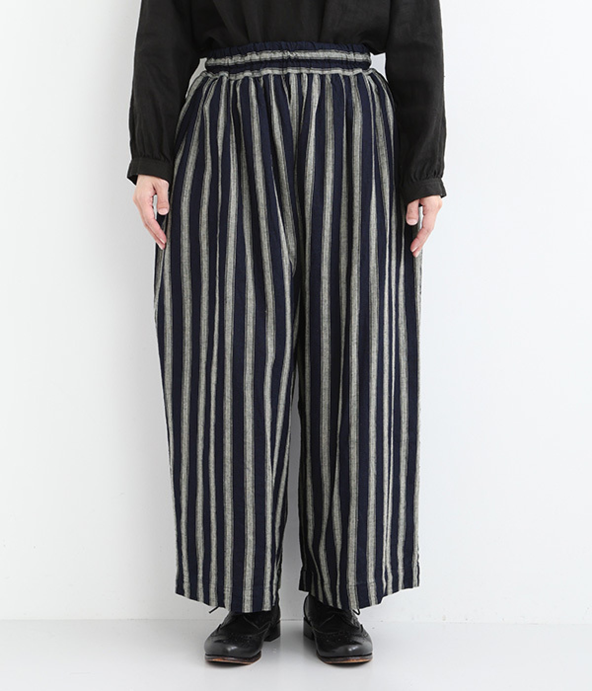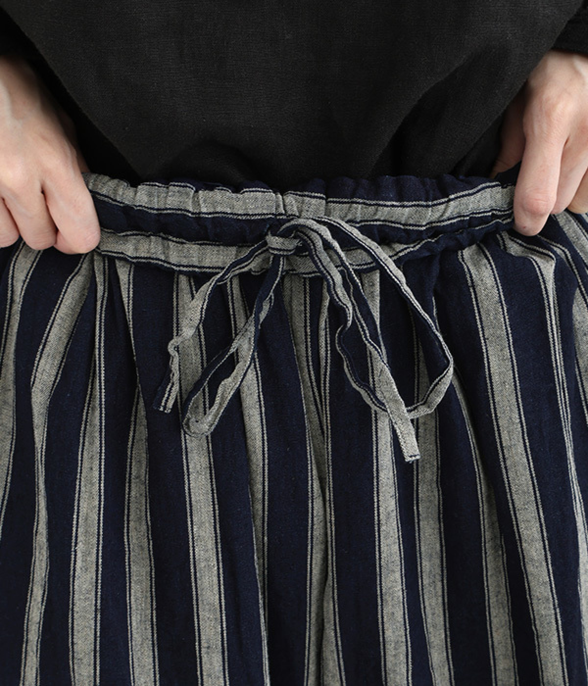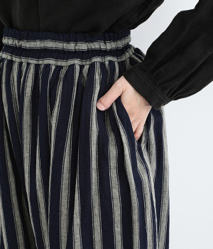 スカートのように広がるフレアシルエットのパンツ。薄手のコットン裏地が透けを軽減しつつ、内側からふんわりとボリュームを加えます。総ゴム仕様のウエストはぐんと伸びて着脱もスムーズ。内ひもでフィット感の調節が可能です。