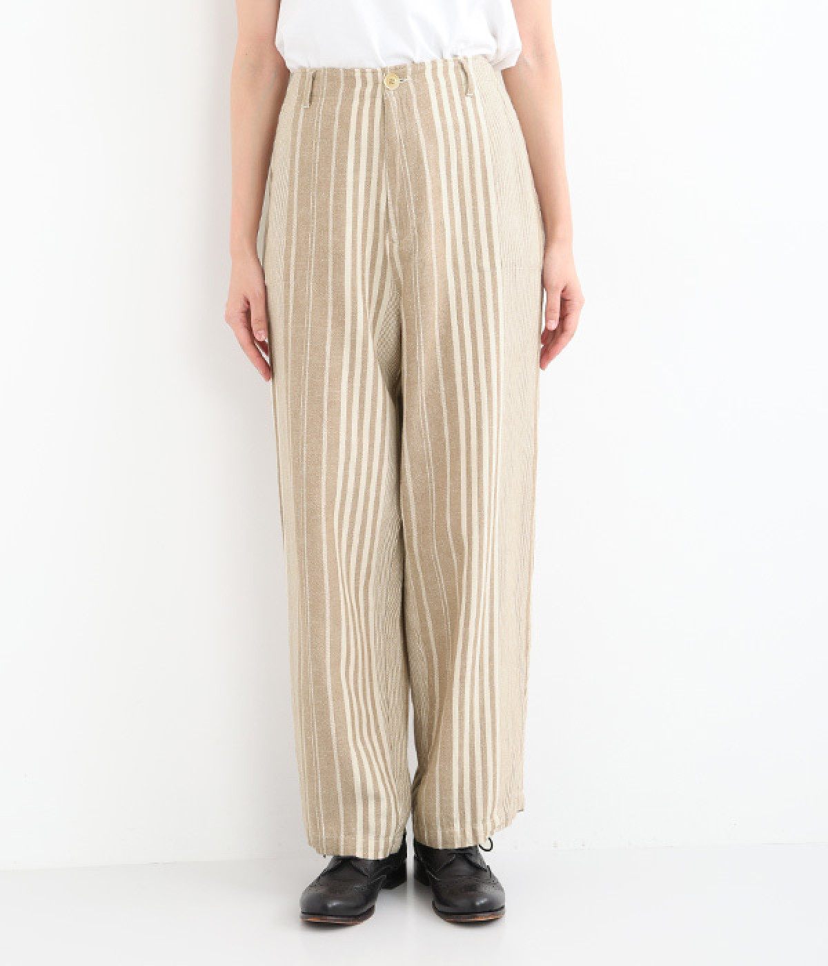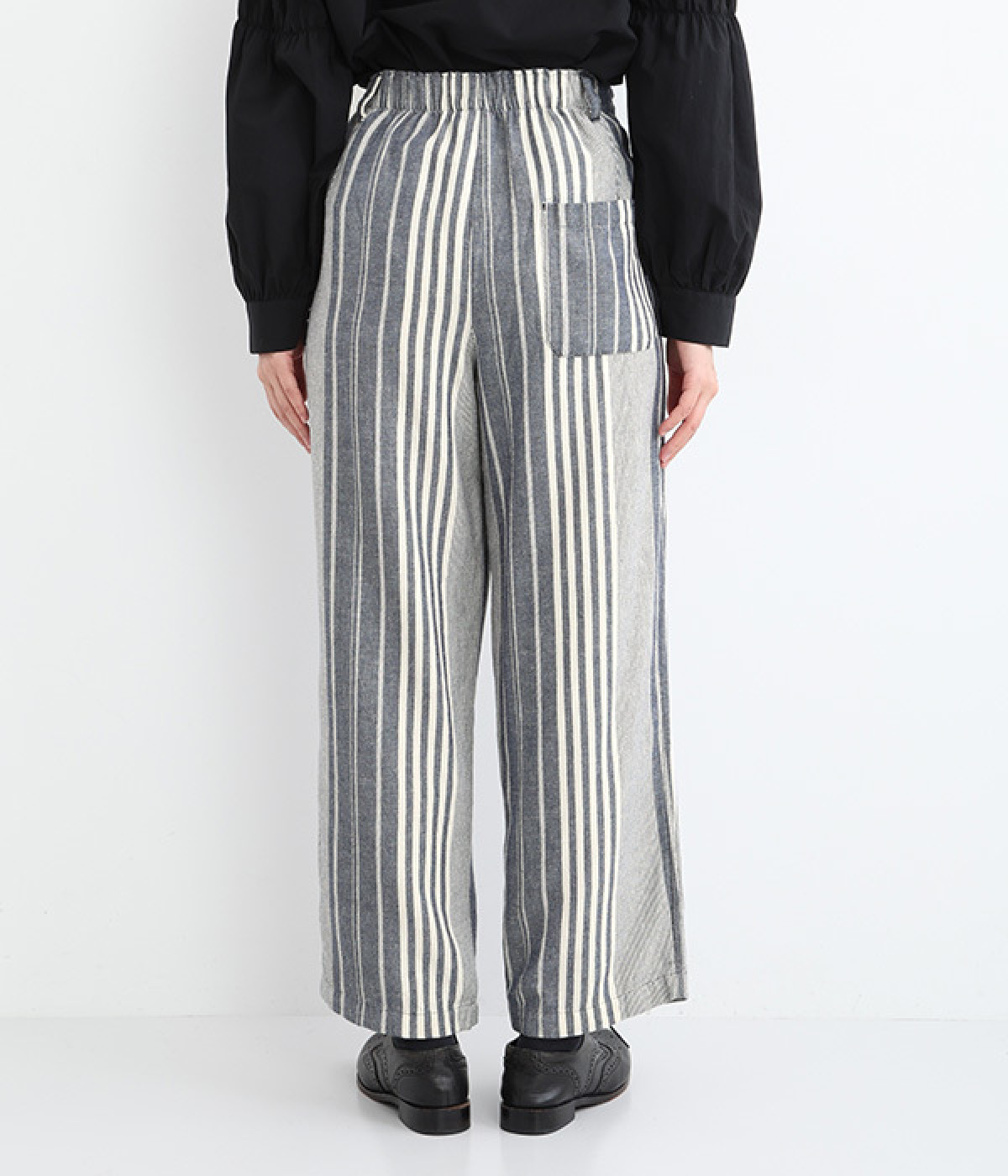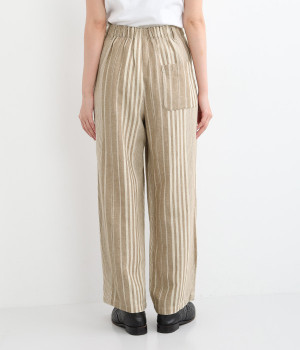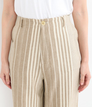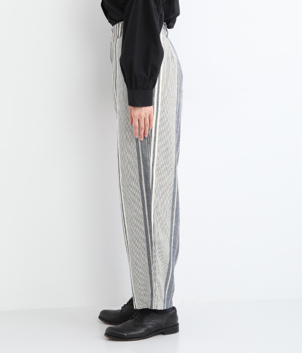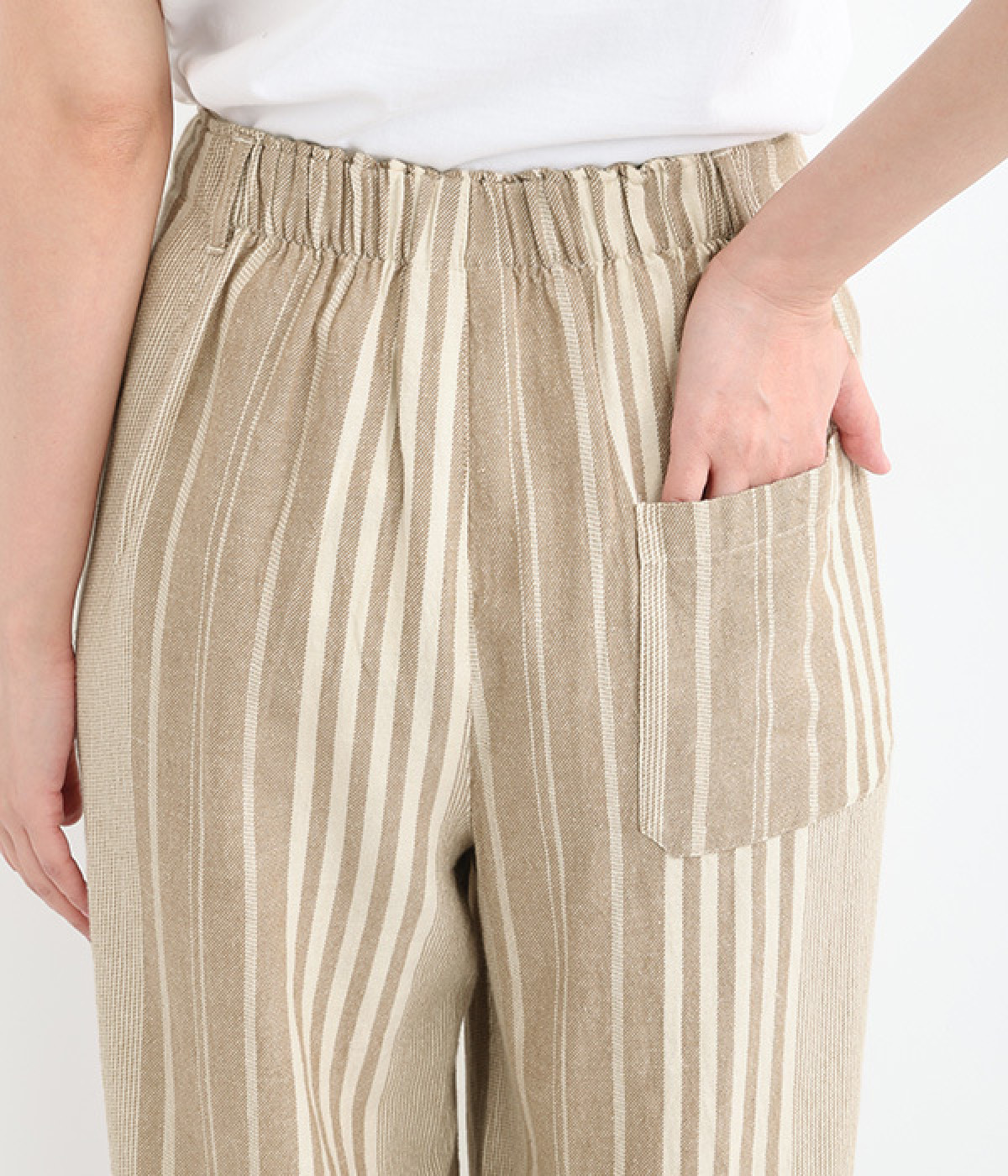 縦のラインを強調するストライプ柄が着こなしをすっきり見せてくれるパンツ。リラックス感漂うほどよいワイドシルエットが、大人のカジュアルスタイルを演出します。ウエストは後ろゴム仕様で、ストレスフリーな穿き心地に仕上げました。