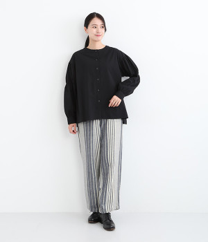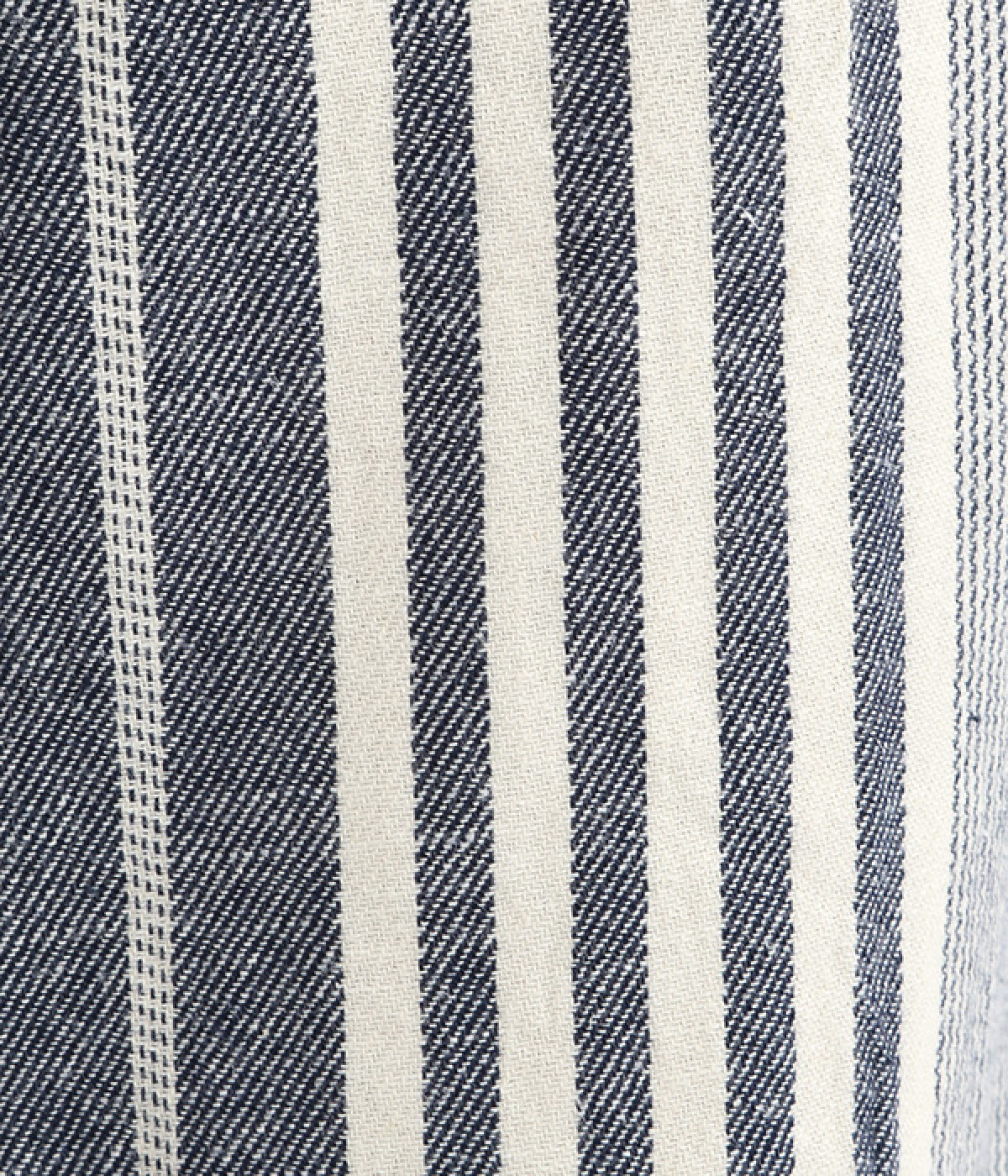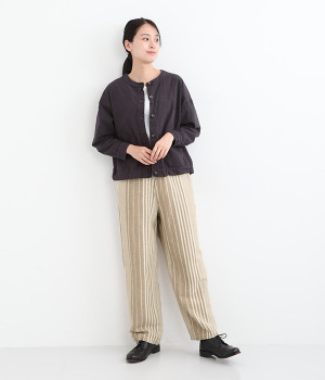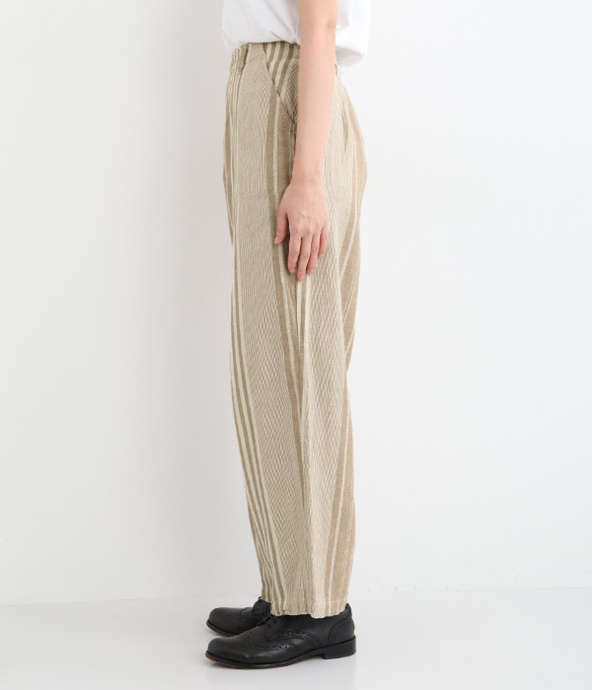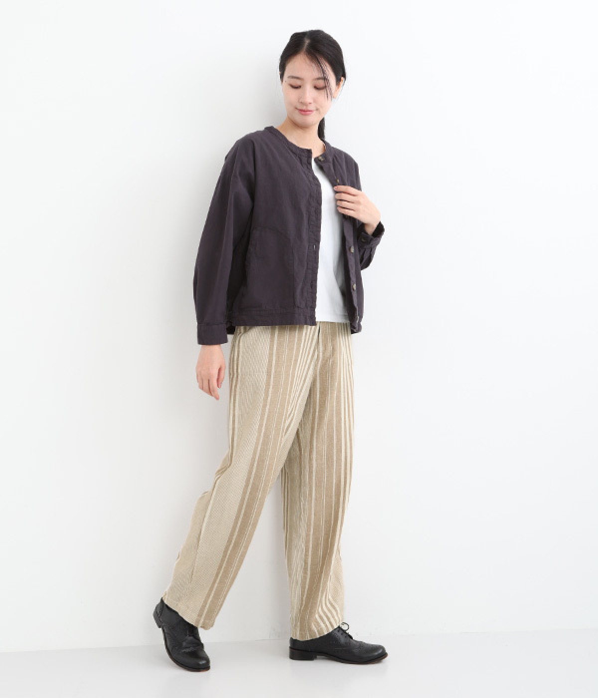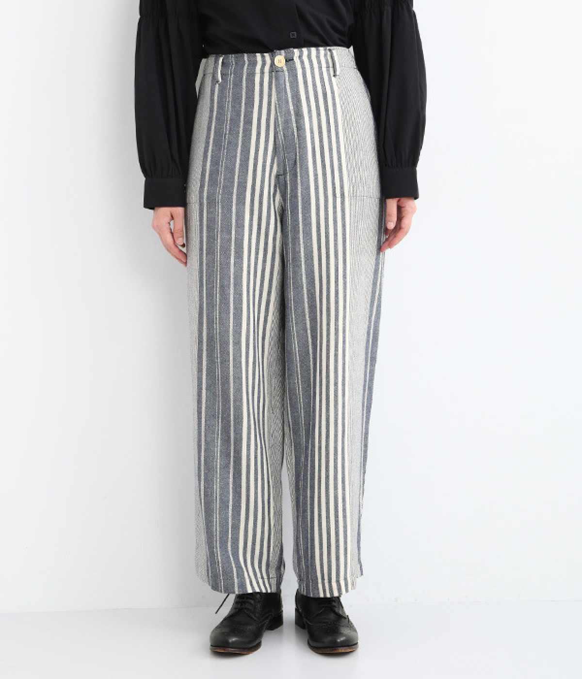 縦のラインを強調するストライプ柄が着こなしをすっきり見せてくれるパンツ。リラックス感漂うほどよいワイドシルエットが、大人のカジュアルスタイルを演出します。ウエストは後ろゴム仕様で、ストレスフリーな穿き心地に仕上げました。