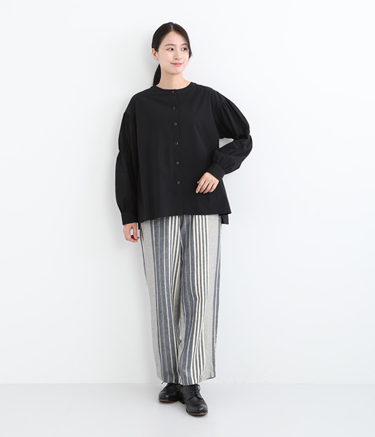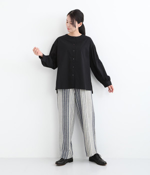 やわらかな風合いが肌に心地よい、コットンにリネンをブレンドした生地を使用。表面のネップや織りムラが、天然素材らしい味のある表情を見せます。