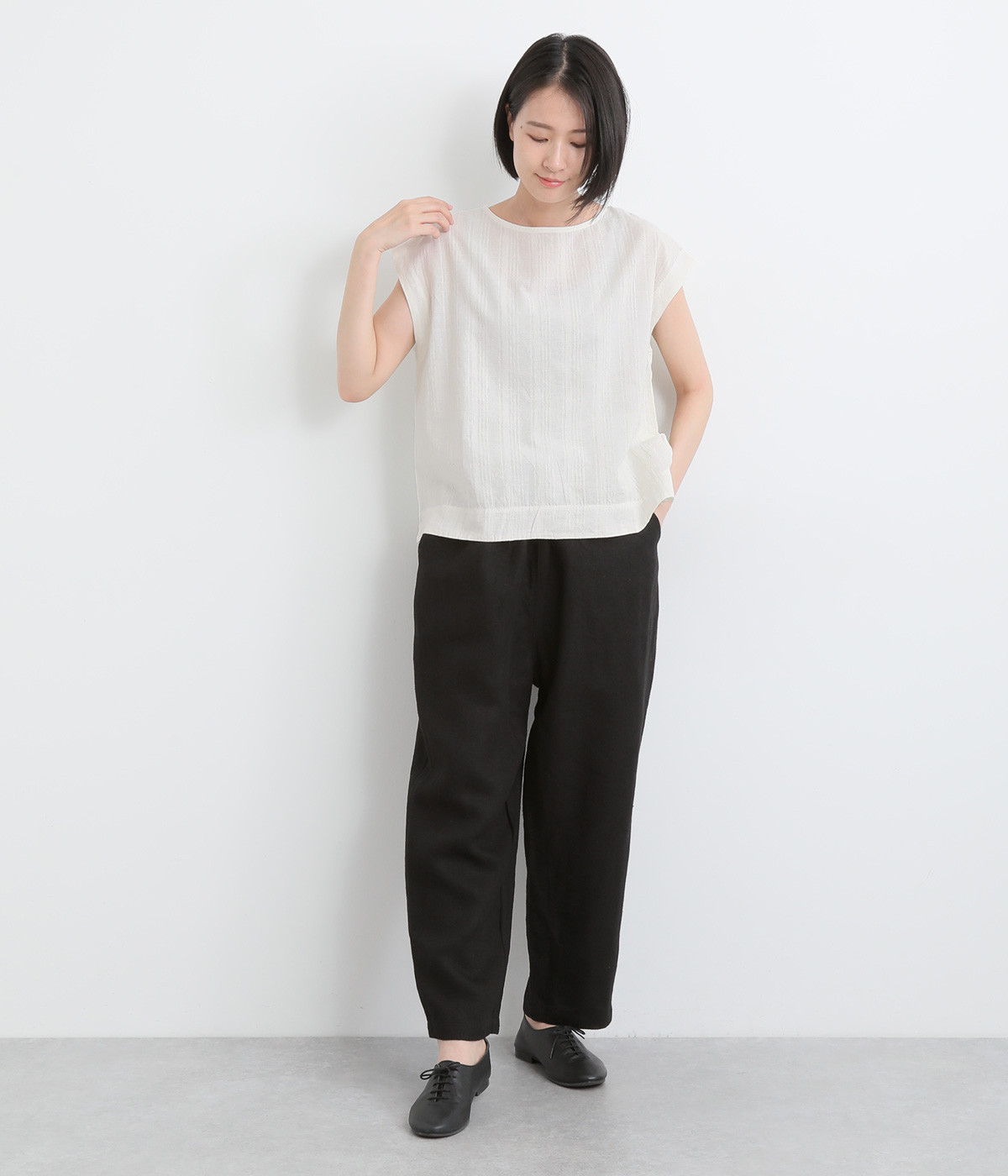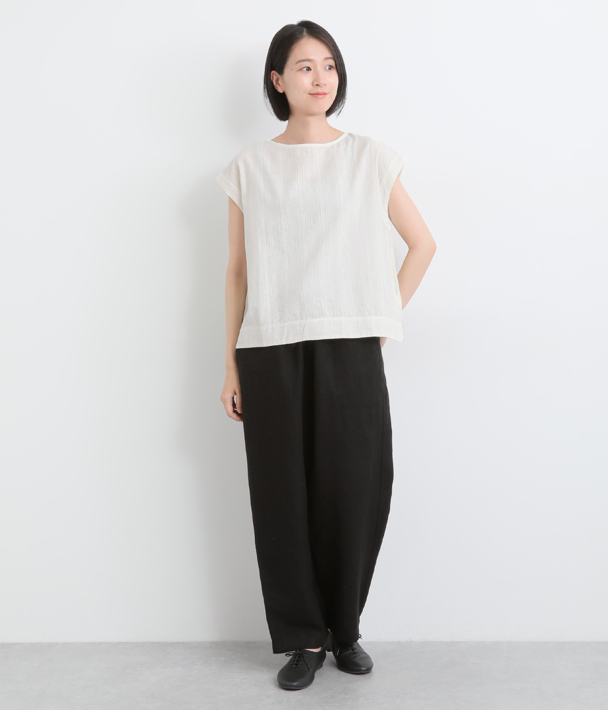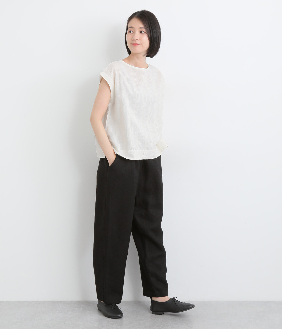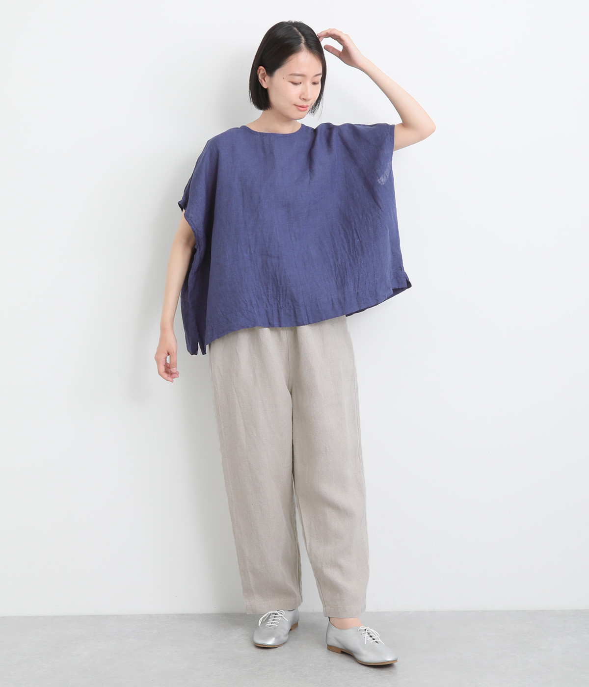 しっかりとした厚手のツイル生地を採用しています。リネン特有のナチュラルな風合いも豊かで、はくほどにやわらかくなじんでいくエイジングが楽しみになる仕上がりです。