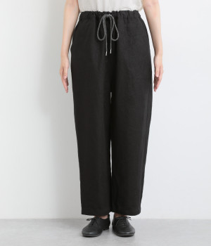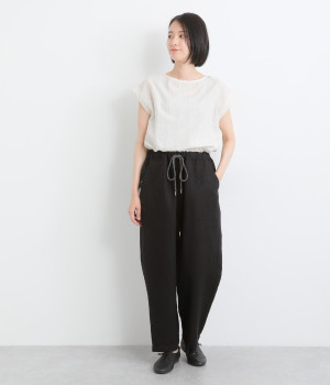 ワタリや股上をたっぷり取ったリラックス感のあるパンツです。総ゴムウエストでストレスなくデイリーに穿けて、フィット感を調整できるアジャスターには、ロープ紐を用いてデザインポイントにもしています。