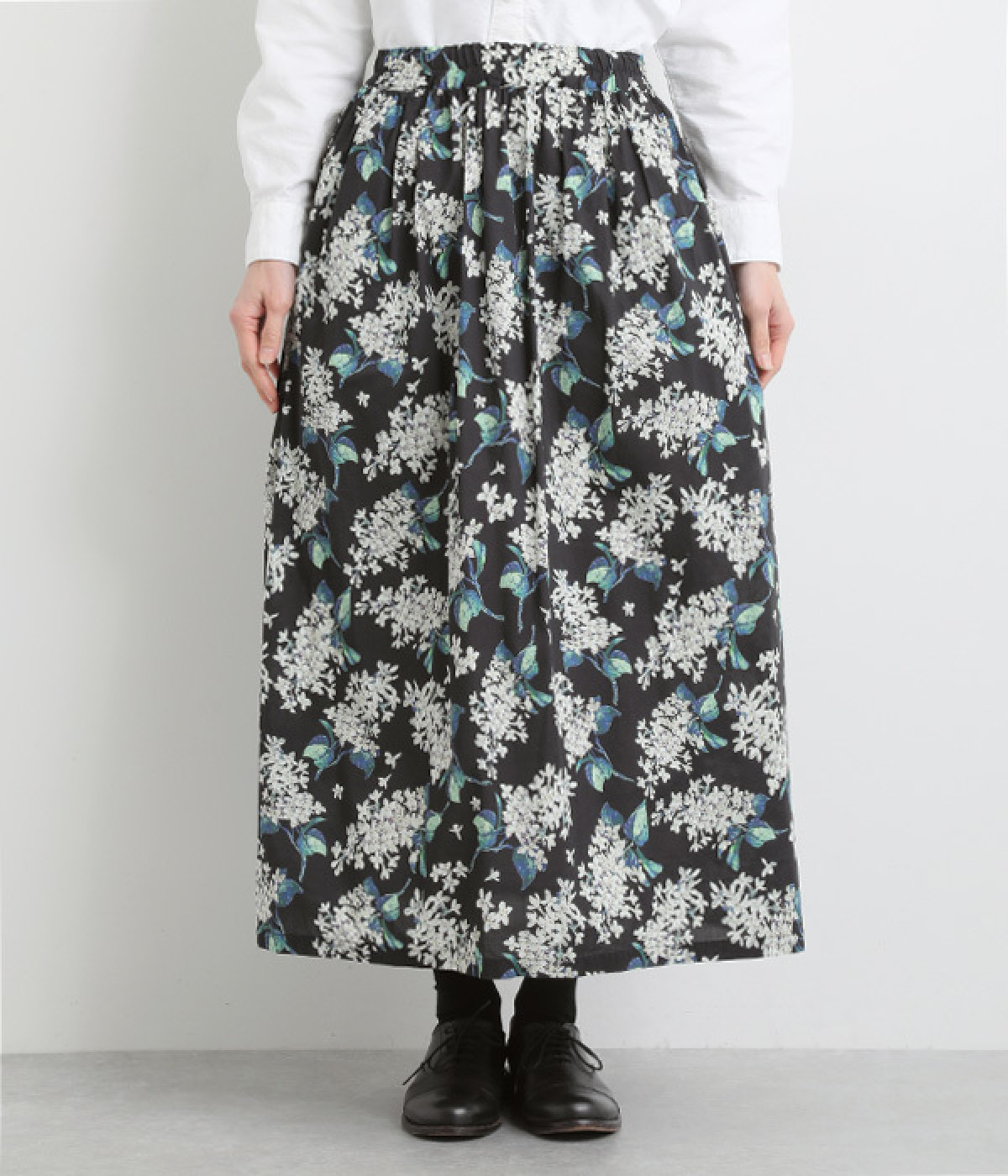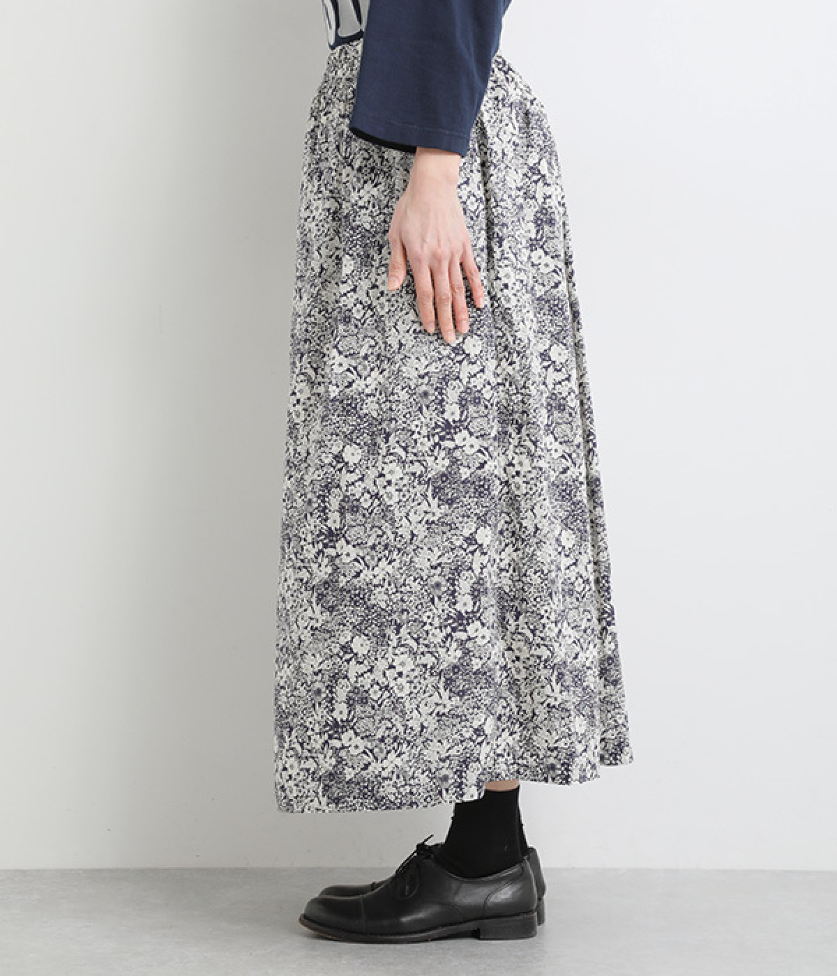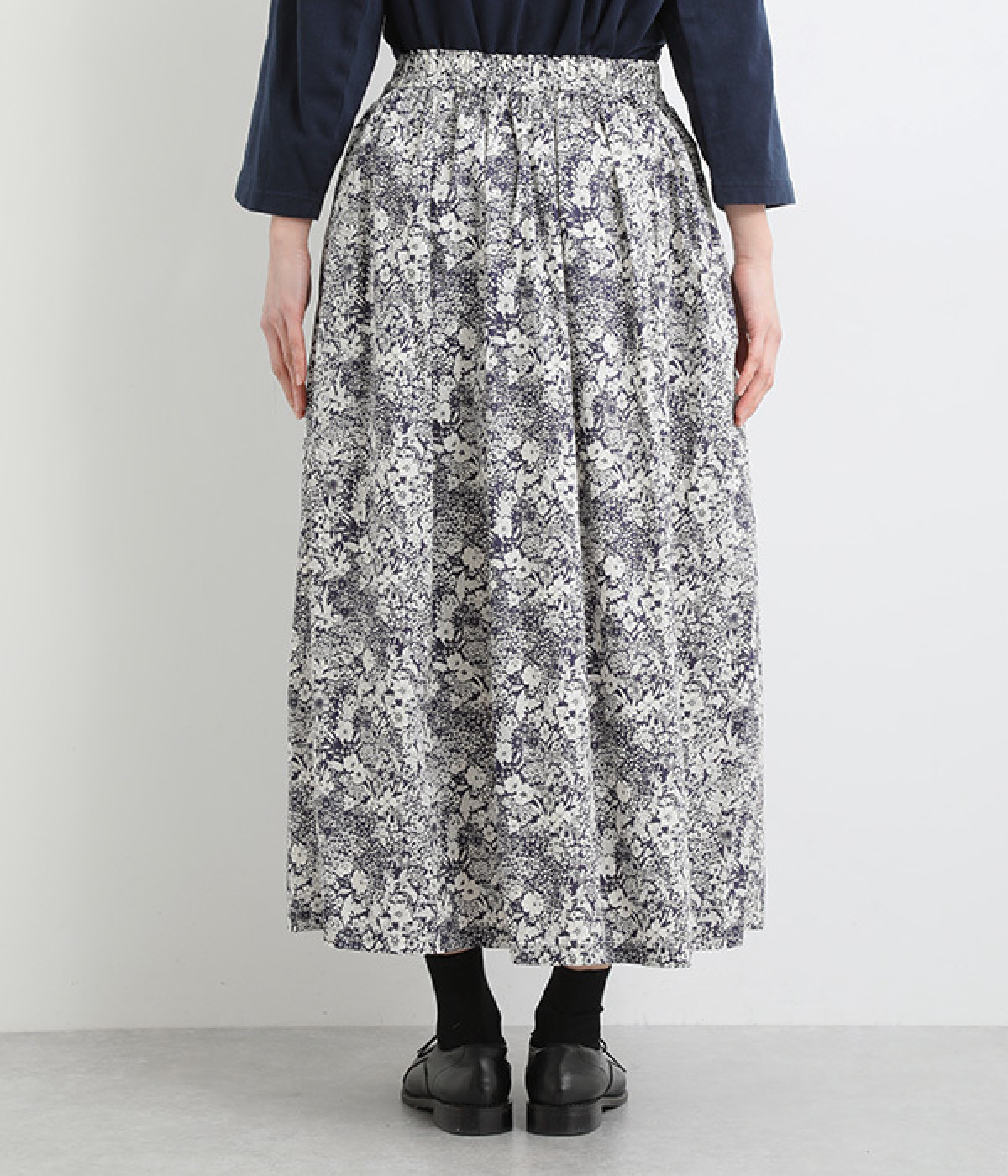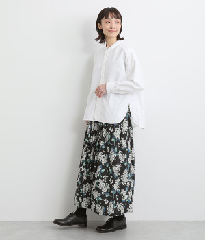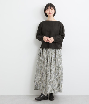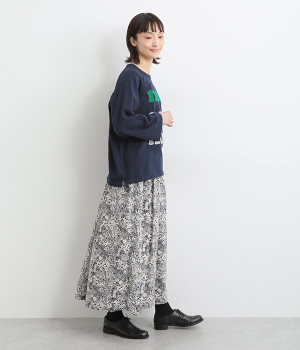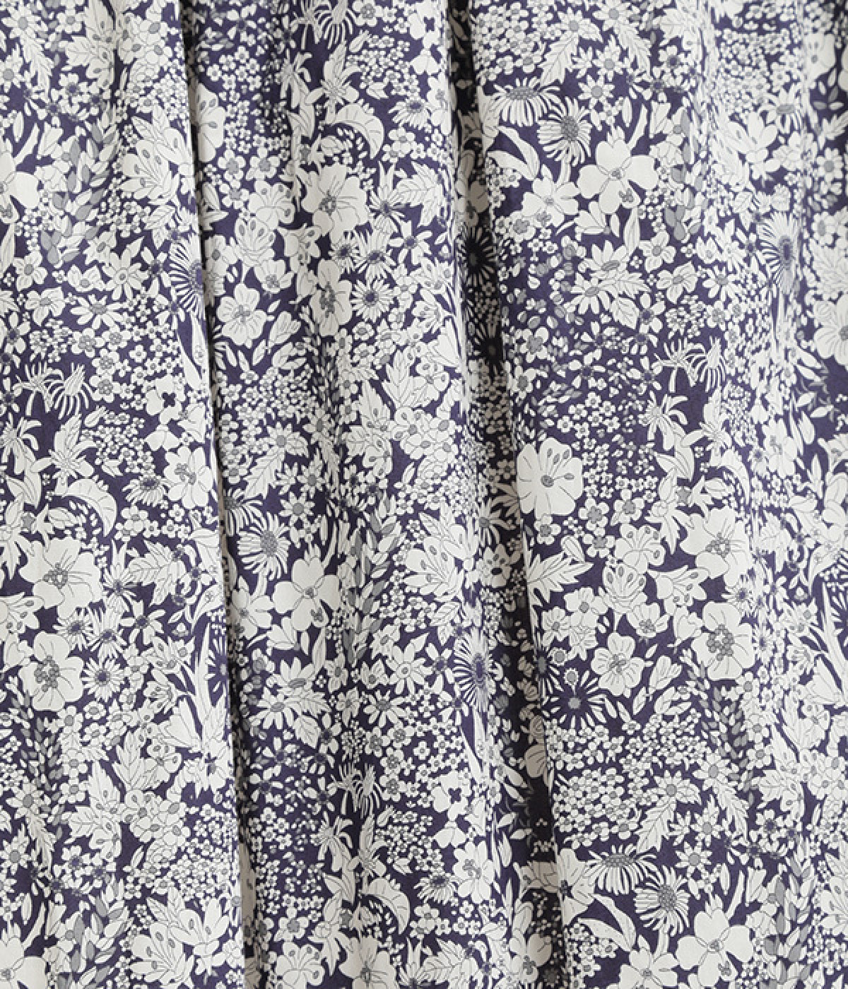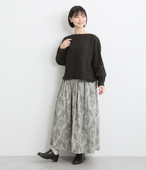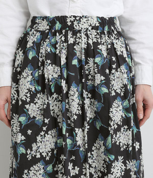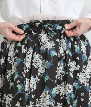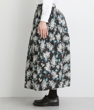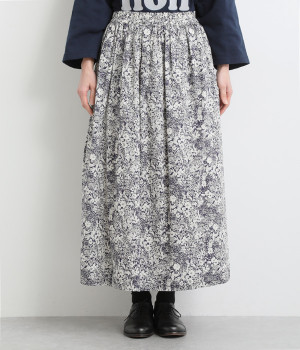 美しい柄が一際目を惹くリバティプリントのスカート。ウエストまわりはすっきりと、裾に向かってゆったりと広がるフレアシルエットが品のよさを引き立たせます。ウエストはオールゴム仕様なのでストレスがなく、内紐によって調整も可能です。