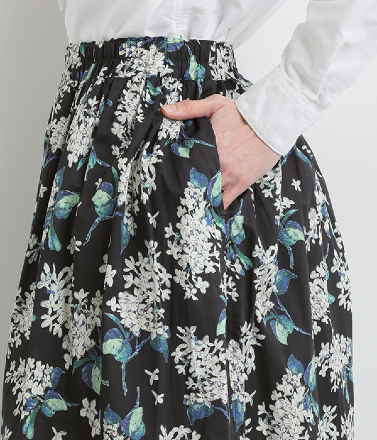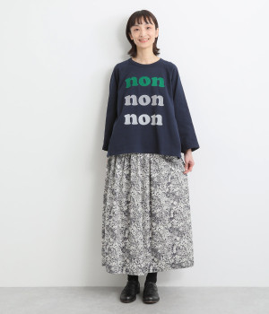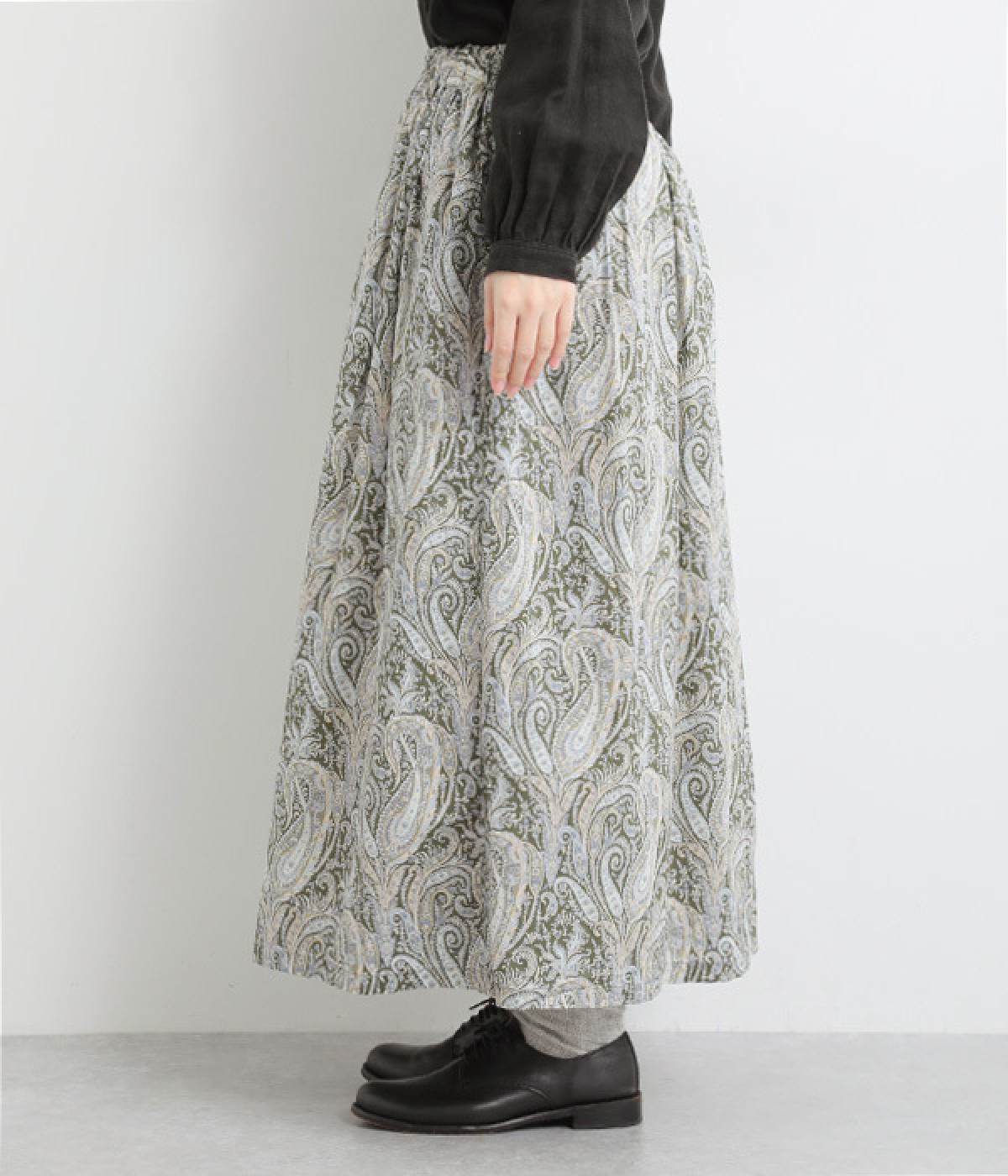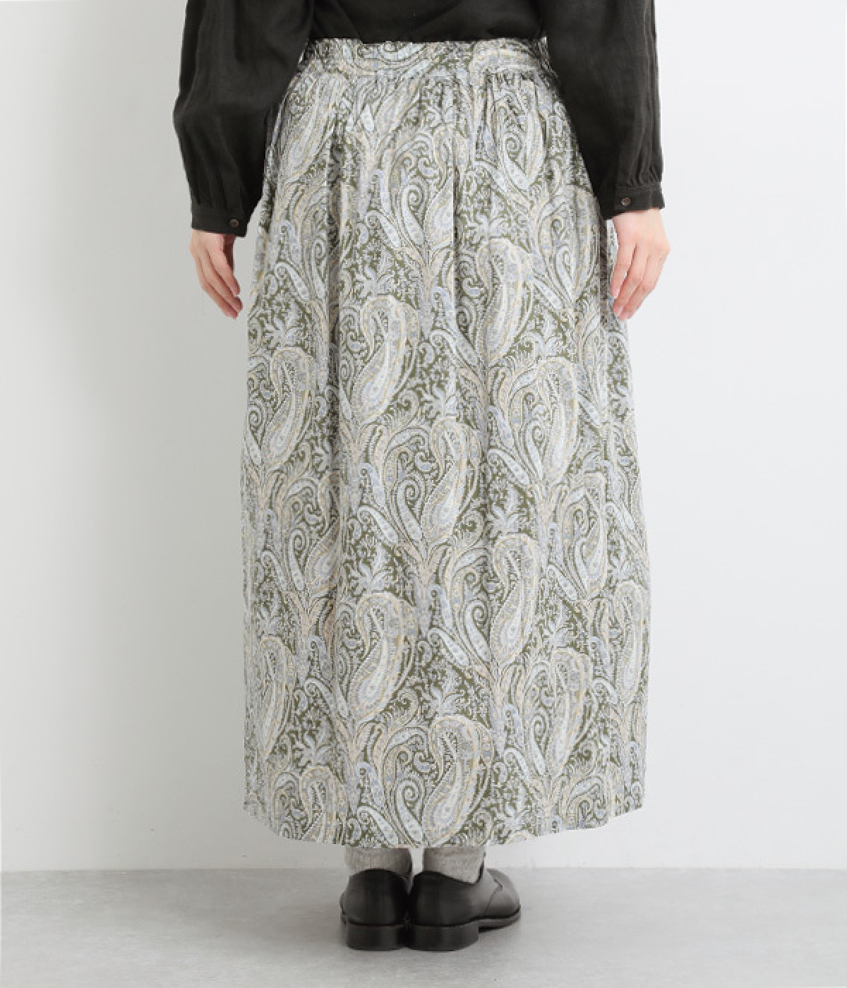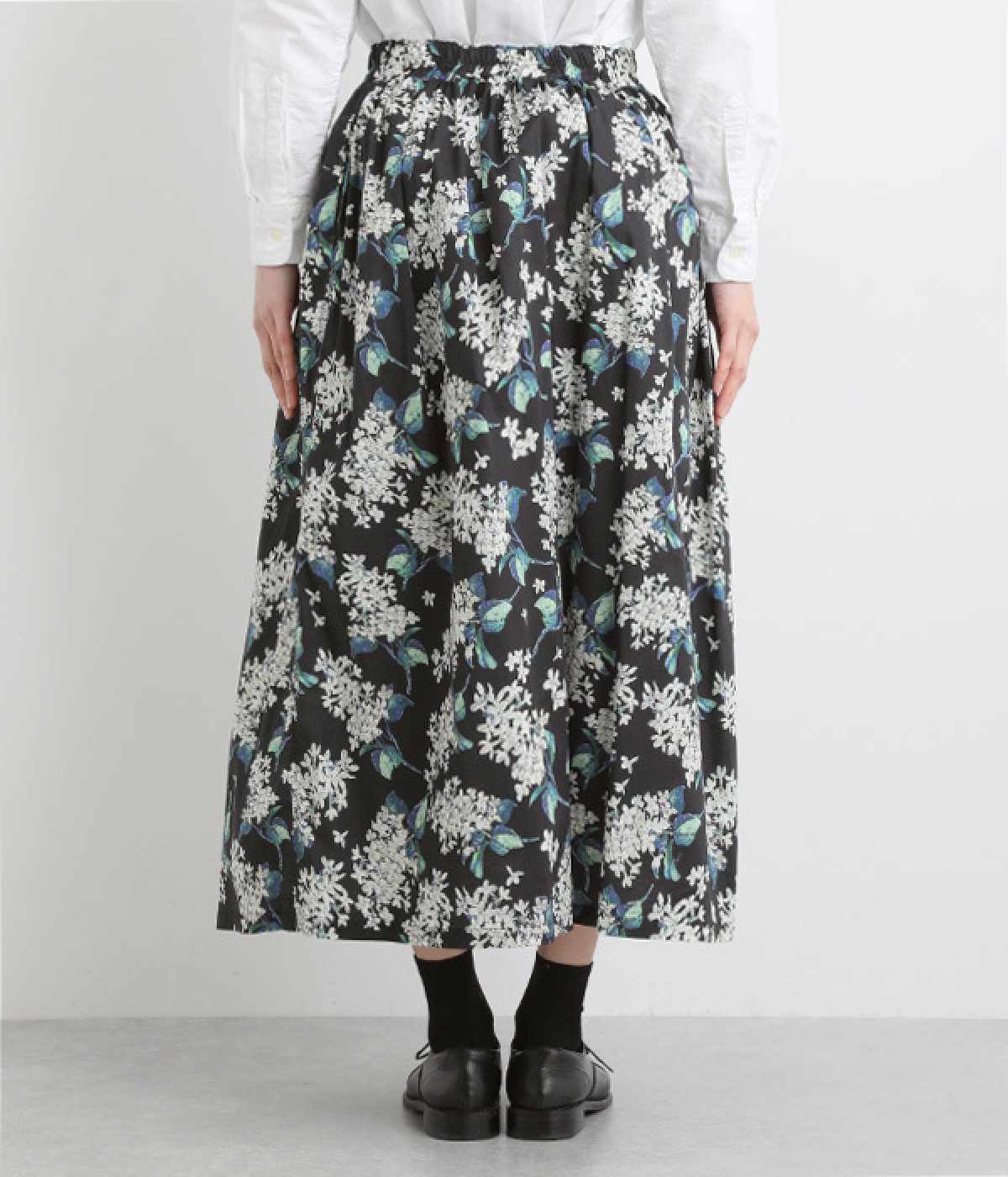 美しい柄が一際目を惹くリバティプリントのスカート。ウエストまわりはすっきりと、裾に向かってゆったりと広がるフレアシルエットが品のよさを引き立たせます。ウエストはオールゴム仕様なのでストレスがなく、内紐によって調整も可能です。