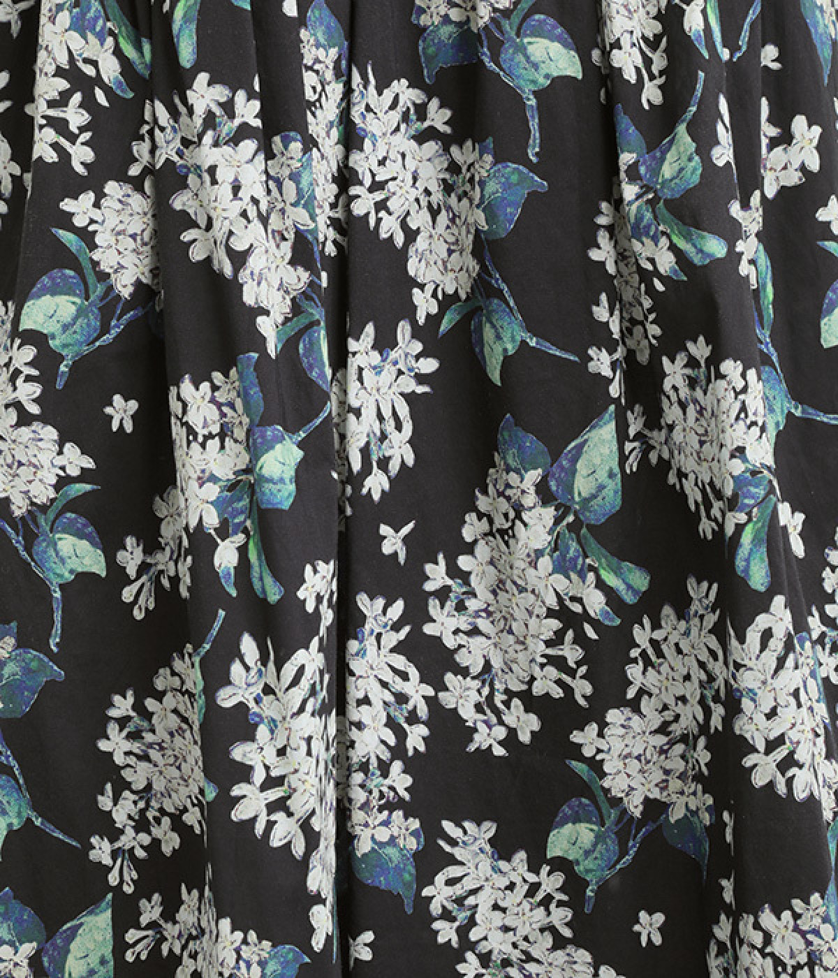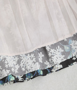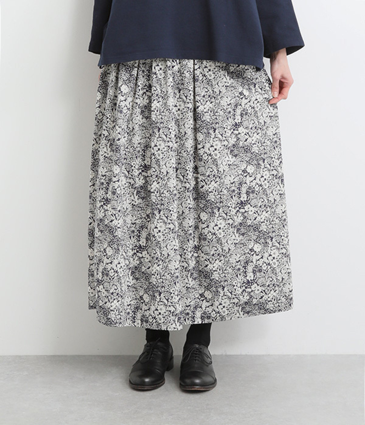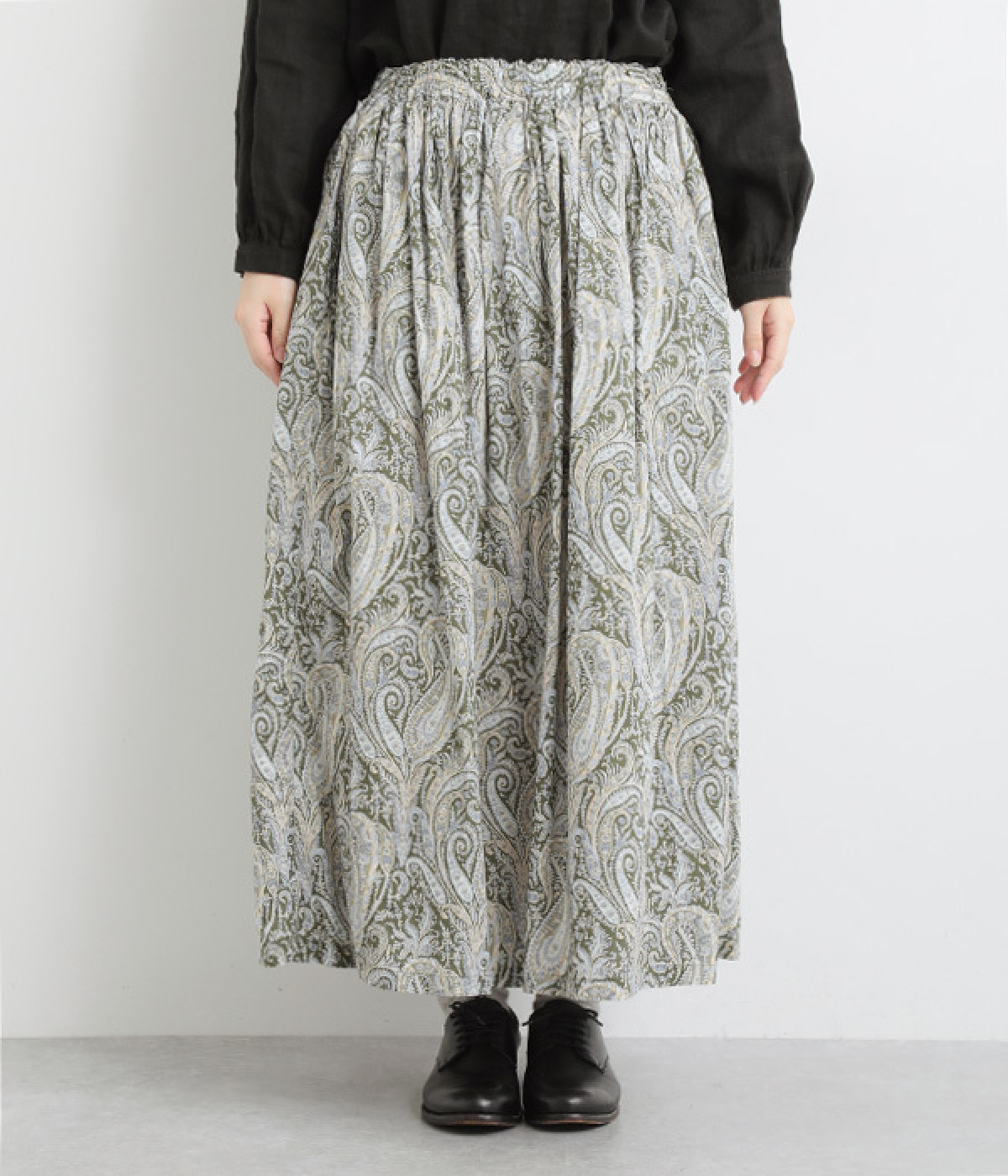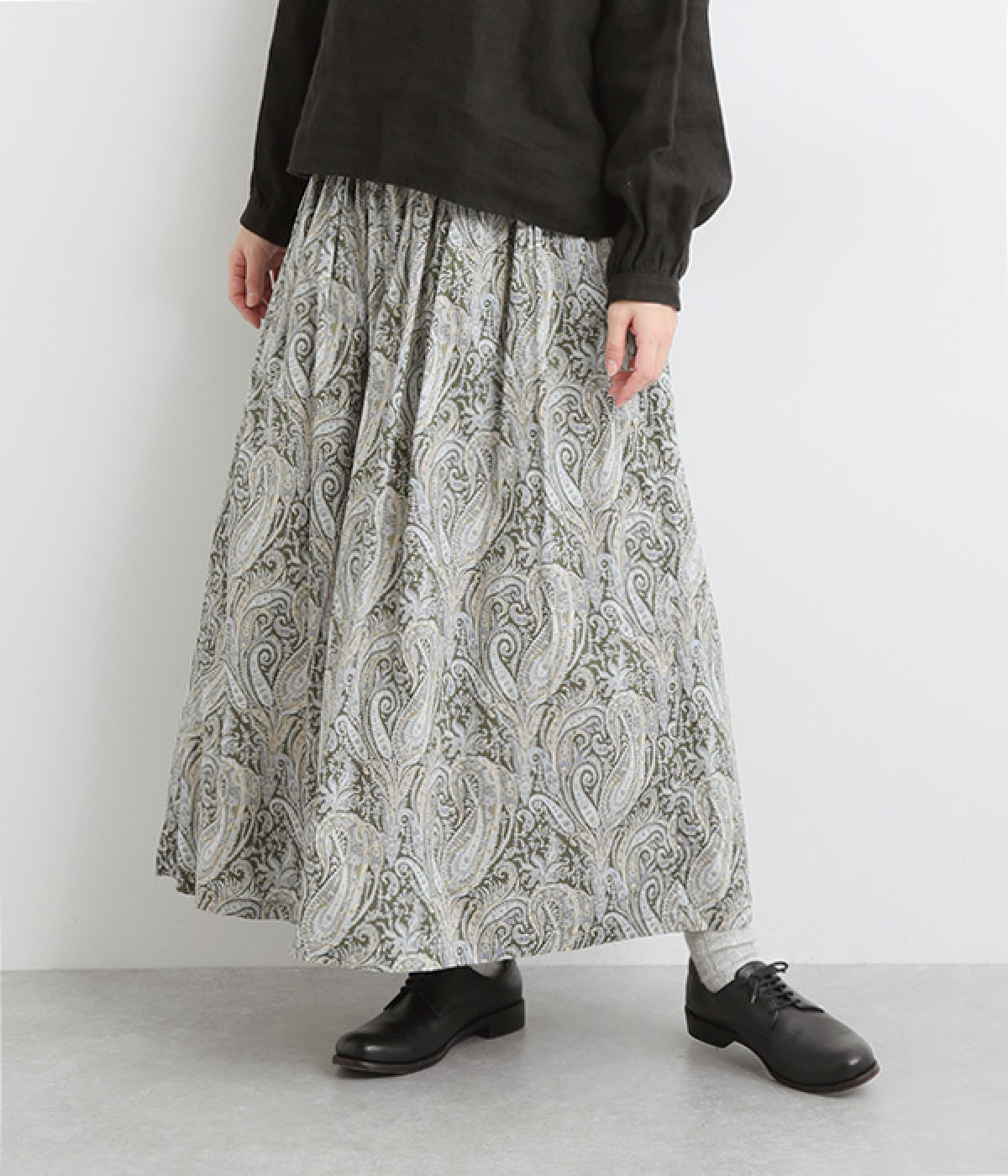 美しい柄が一際目を惹くリバティプリントのスカート。ウエストまわりはすっきりと、裾に向かってゆったりと広がるフレアシルエットが品のよさを引き立たせます。ウエストはオールゴム仕様なのでストレスがなく、内紐によって調整も可能です。