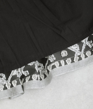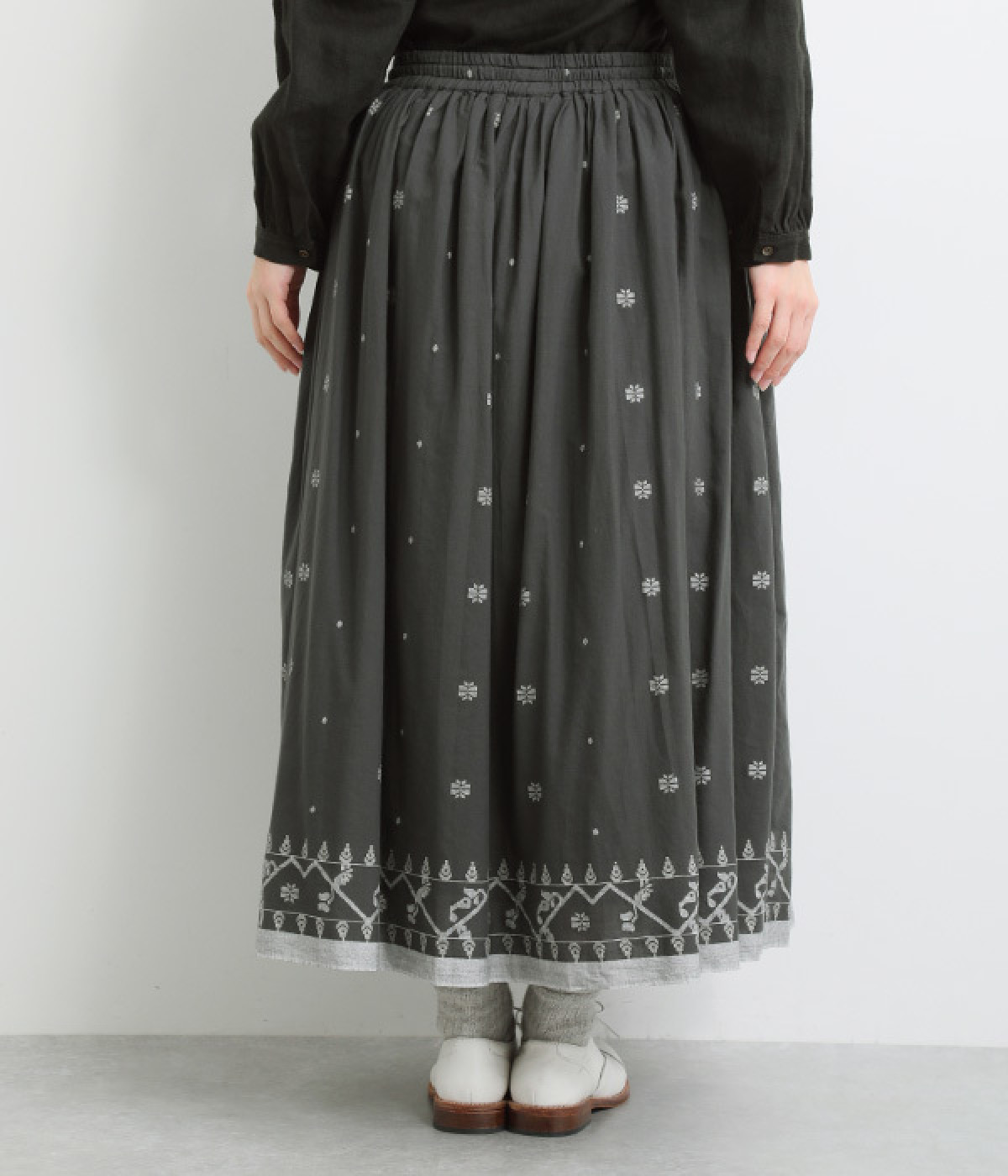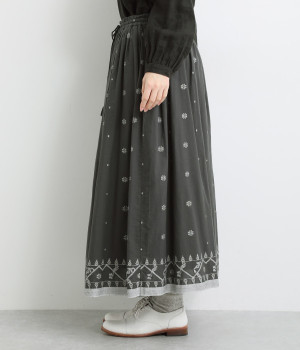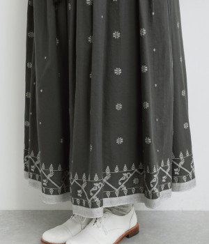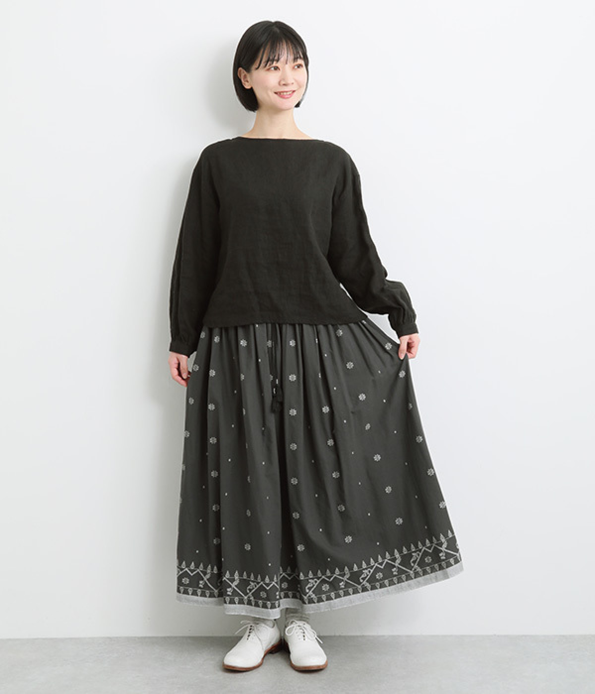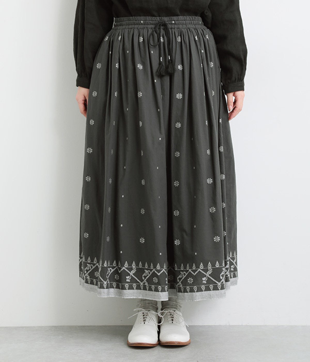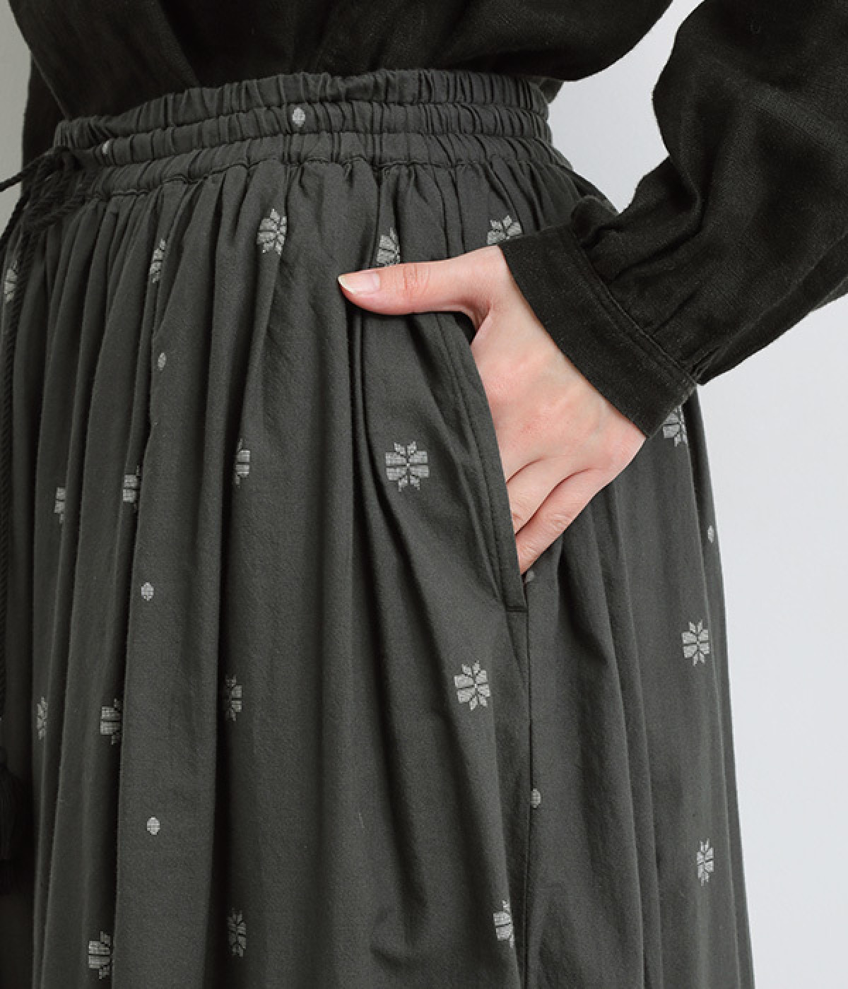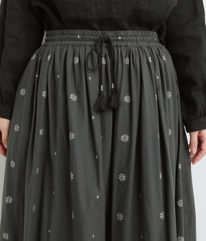 ギャザーから生まれる、ドレープたっぷりの美しいフレアシルエット。さりげないタッセルデザインのウエストマークがポイントに。ウエストはゴム仕様なので、おなかまわりを締めつけず楽なはき心地です。