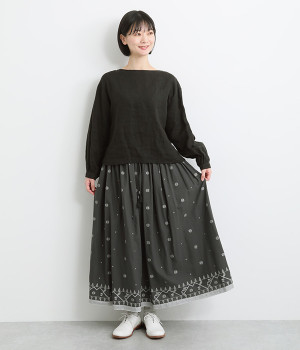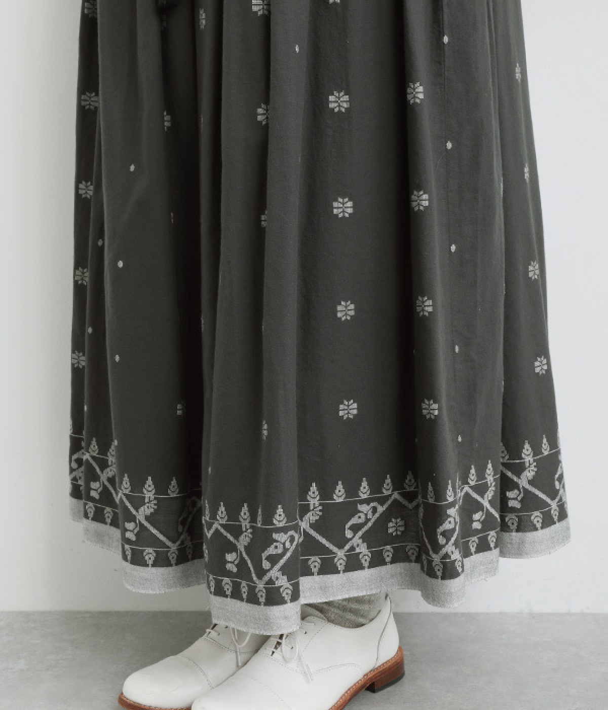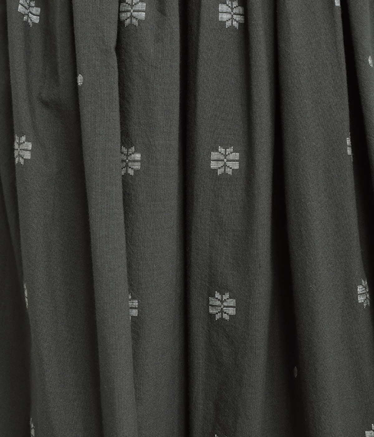 さらりとした軽やかなタッチのインドコットンを使用。身頃全体に広がる繊細な柄は、奥行きの出るジャカード織りで表現しています。