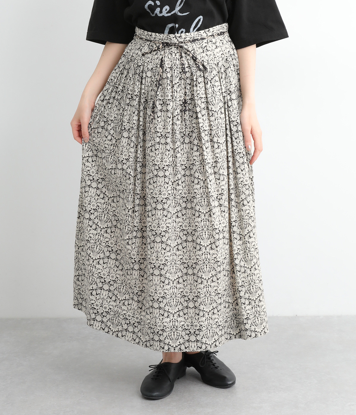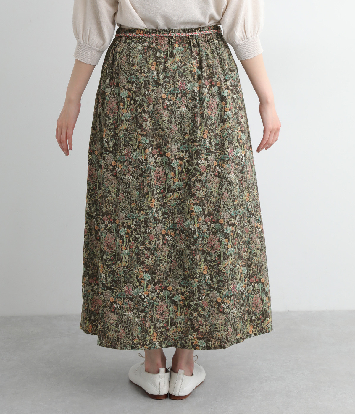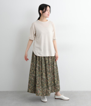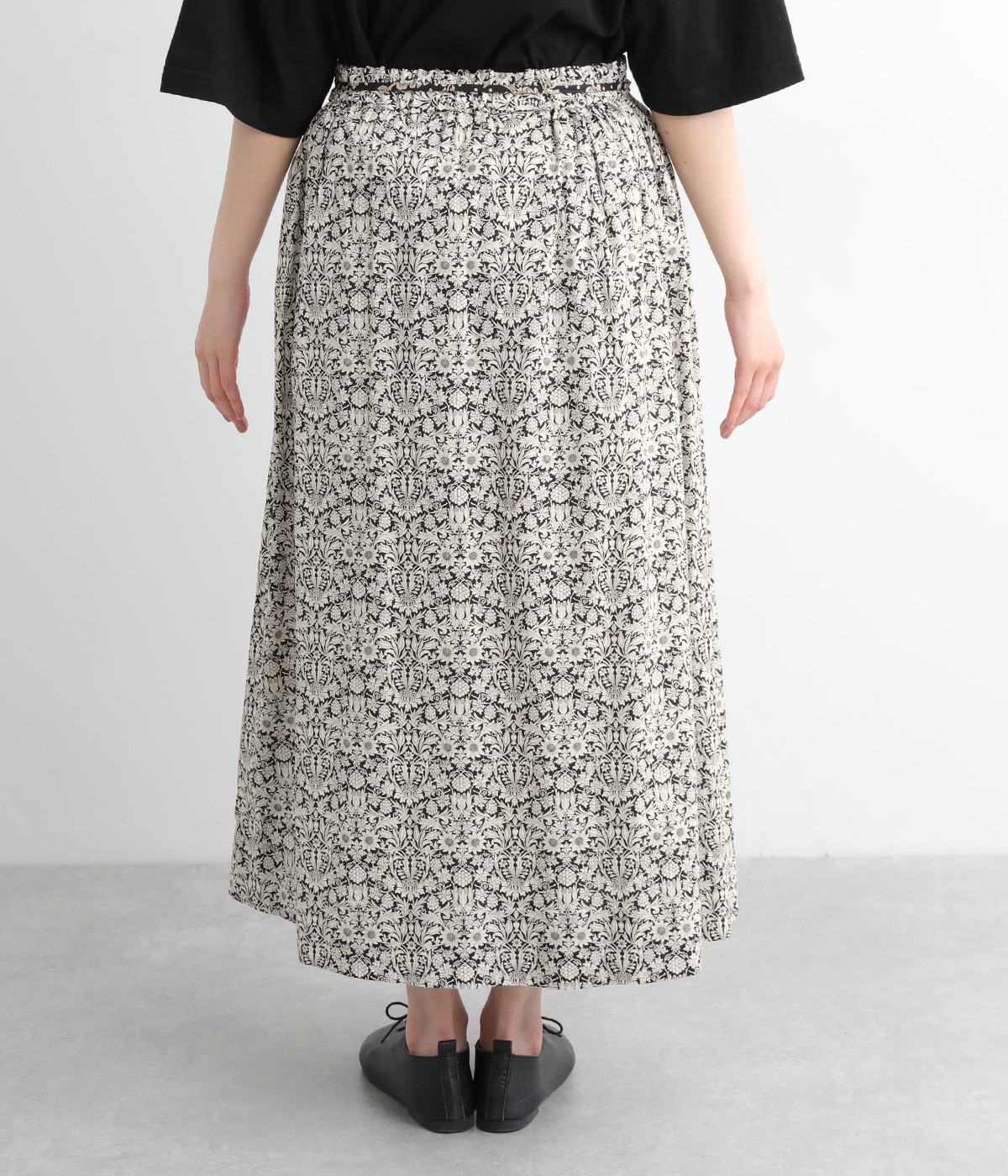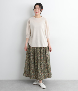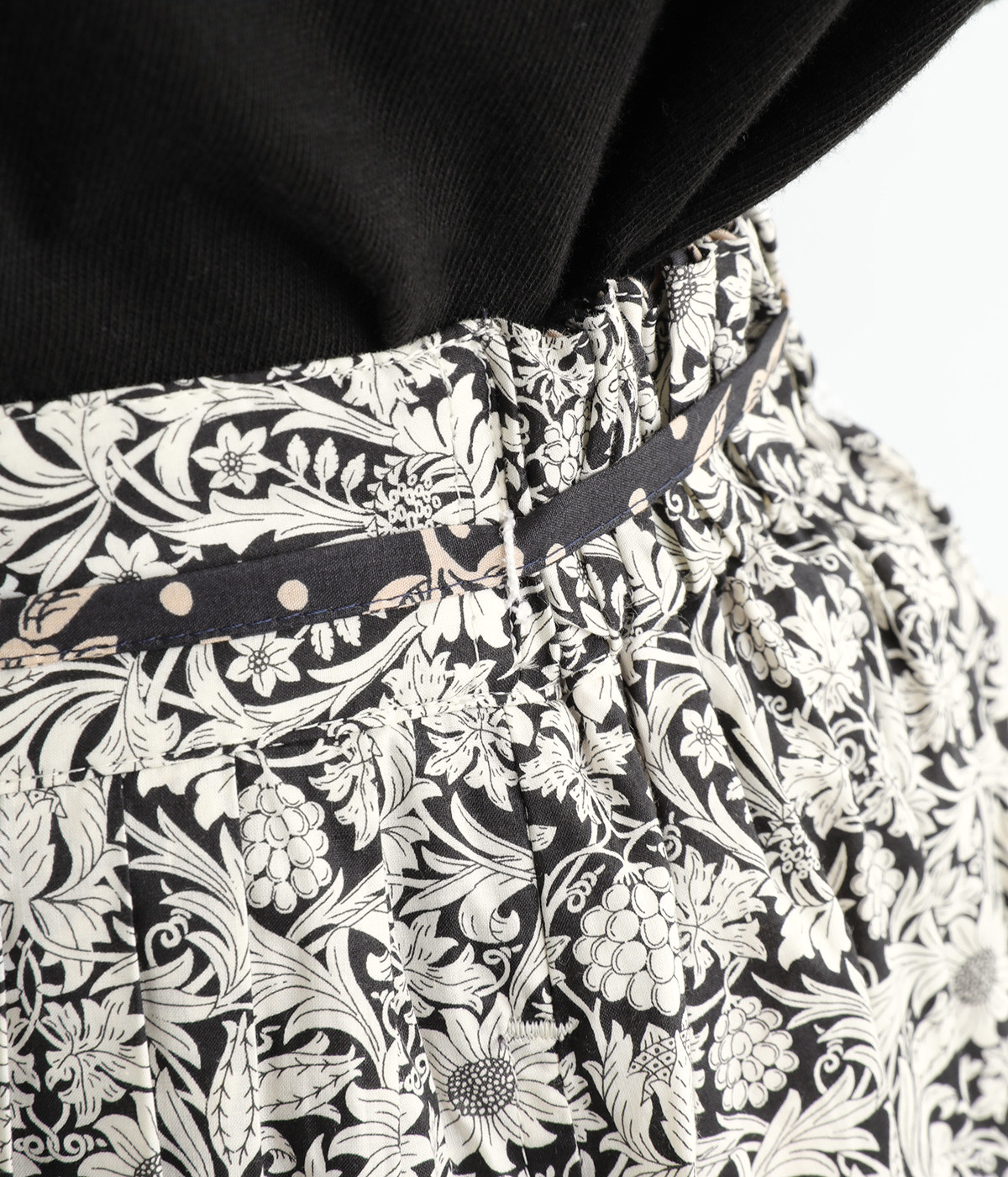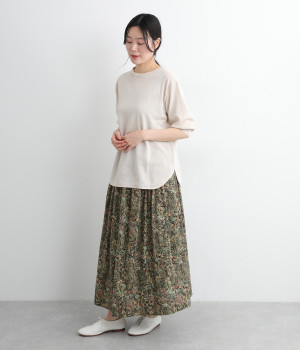 タックやギャザーを入れて贅沢にたっぷりと生地を使用したスカートです。リバティプリントを存分に味わえる一枚で、シンプルなスタイリングでもおしゃれ見えが叶います。ウエストは後ろにゴムを入れてフィット感を高め、細い柄生地リボンでマークできます。