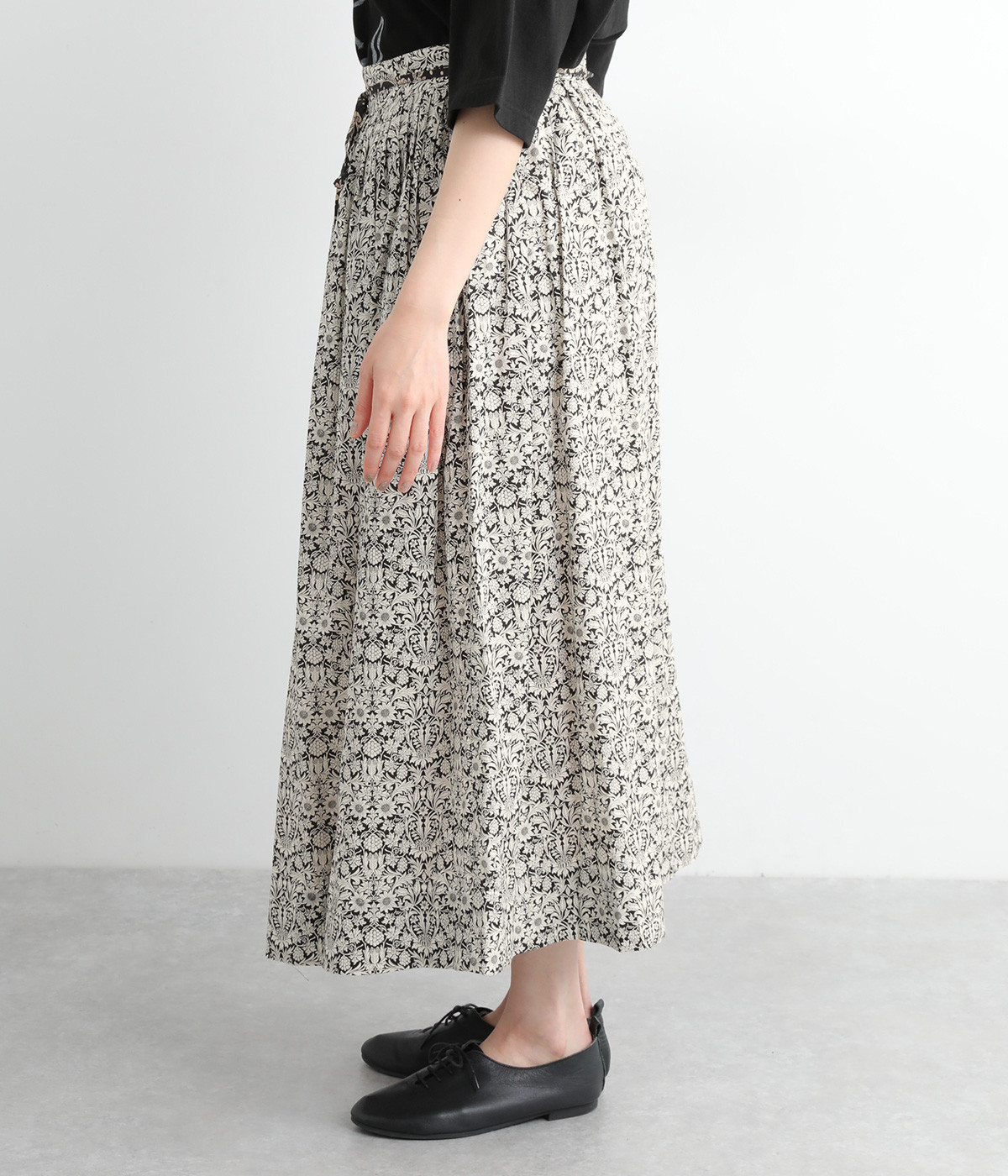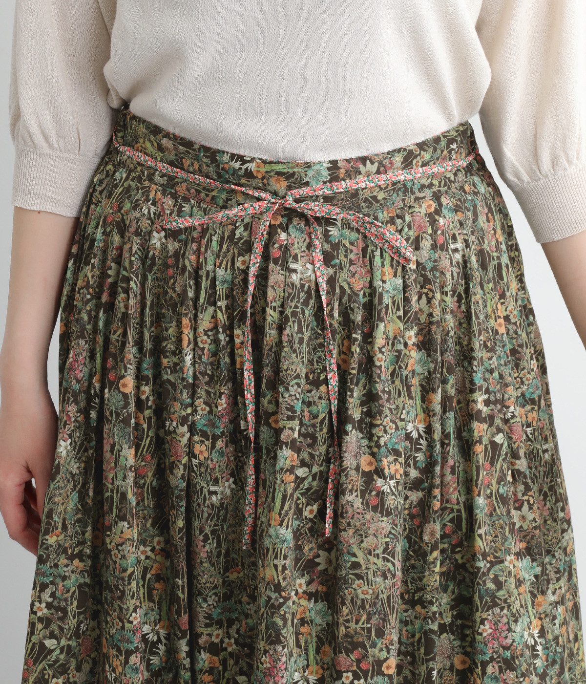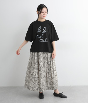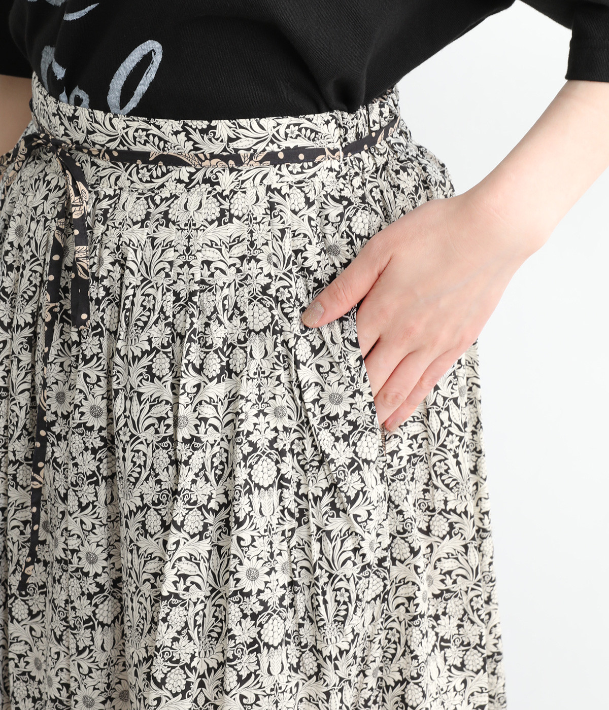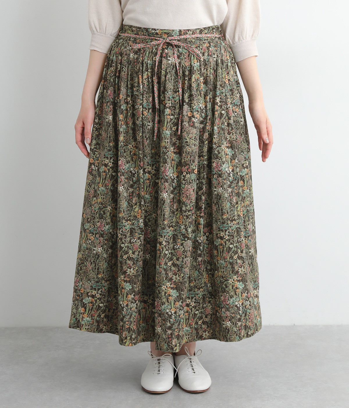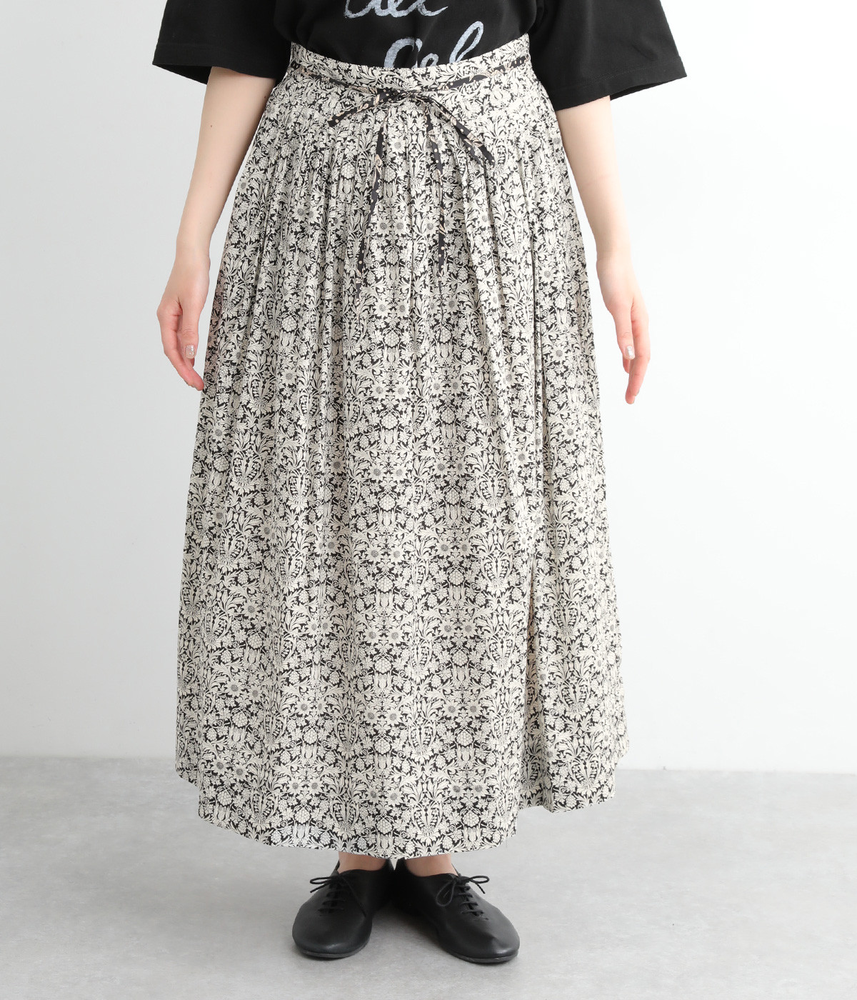 タックやギャザーを入れて贅沢にたっぷりと生地を使用したスカートです。リバティプリントを存分に味わえる一枚で、シンプルなスタイリングでもおしゃれ見えが叶います。ウエストは後ろにゴムを入れてフィット感を高め、細い柄生地リボンでマークできます。