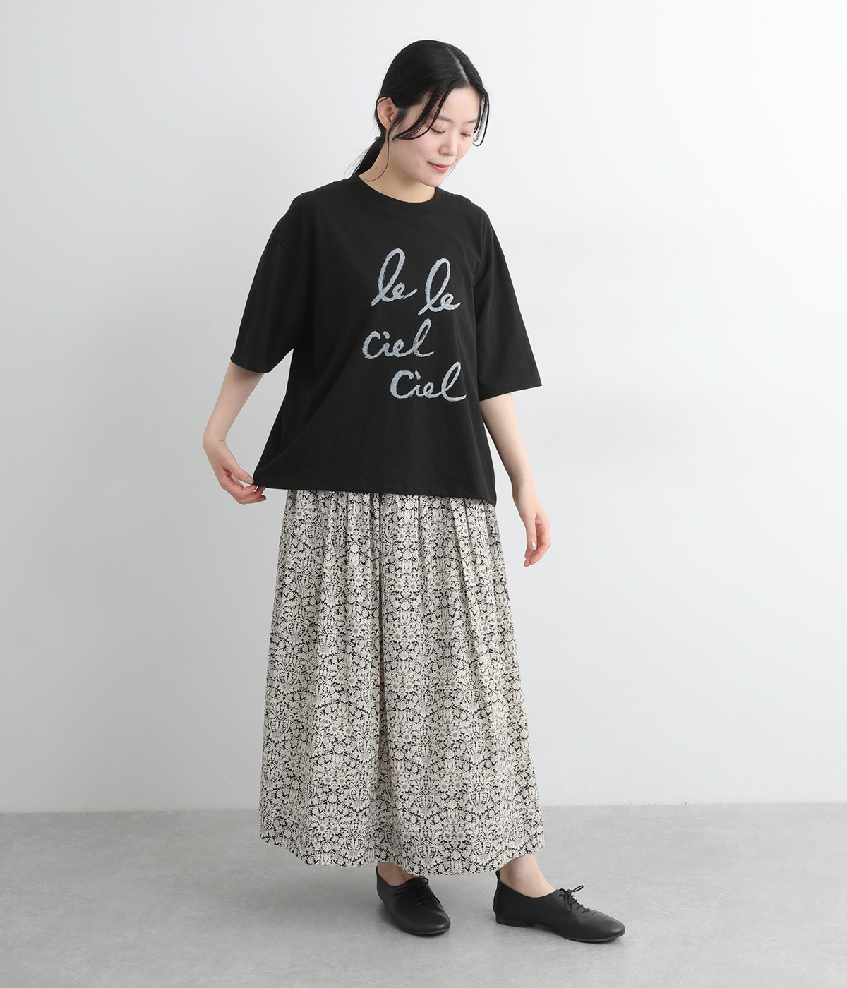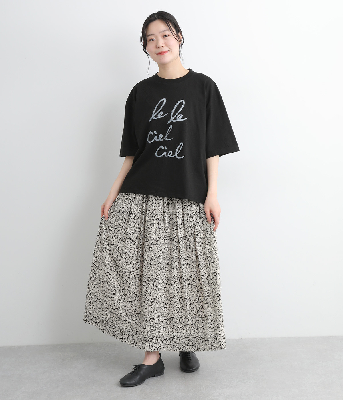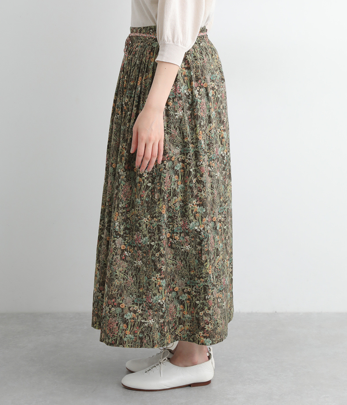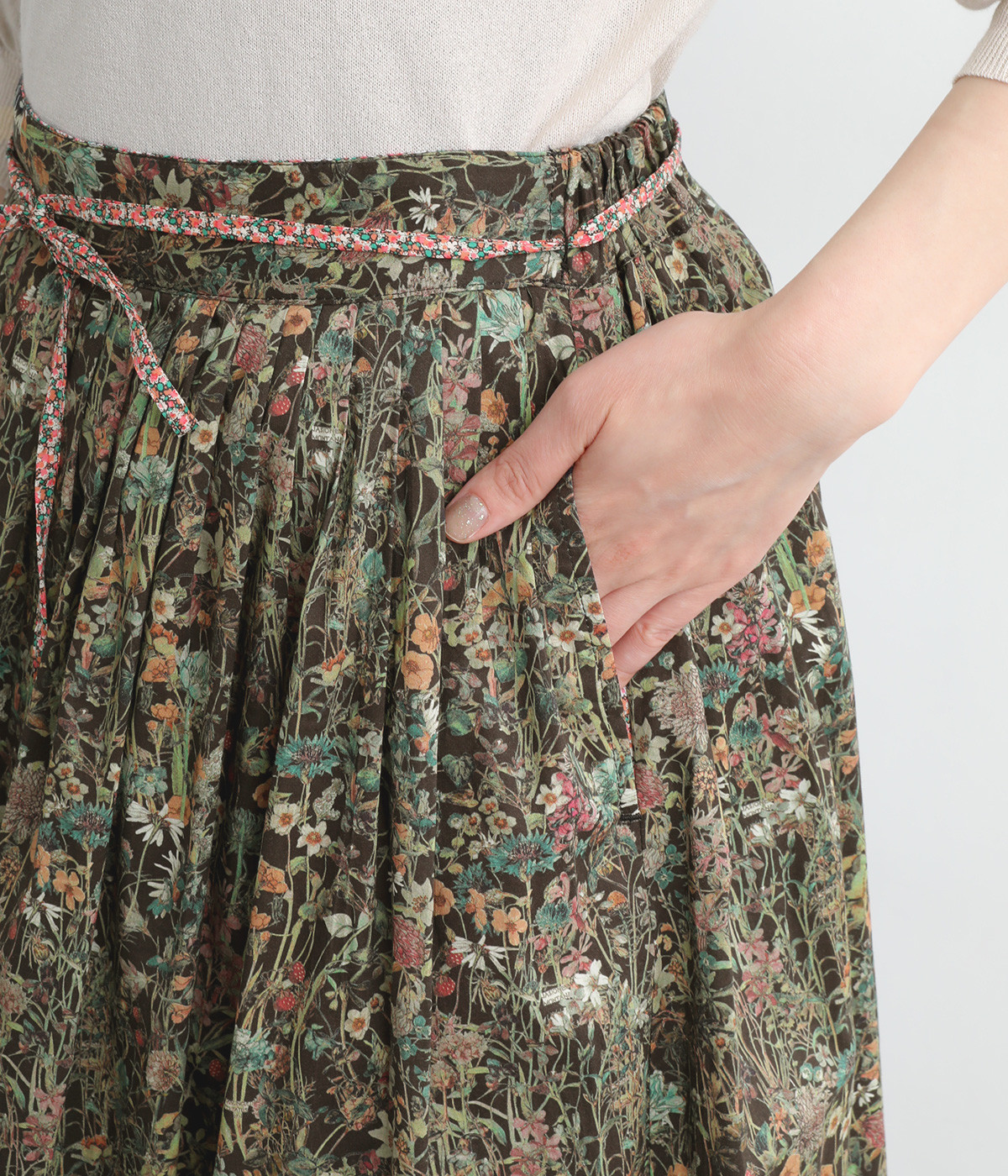 タックやギャザーを入れて贅沢にたっぷりと生地を使用したスカートです。リバティプリントを存分に味わえる一枚で、シンプルなスタイリングでもおしゃれ見えが叶います。ウエストは後ろにゴムを入れてフィット感を高め、細い柄生地リボンでマークできます。