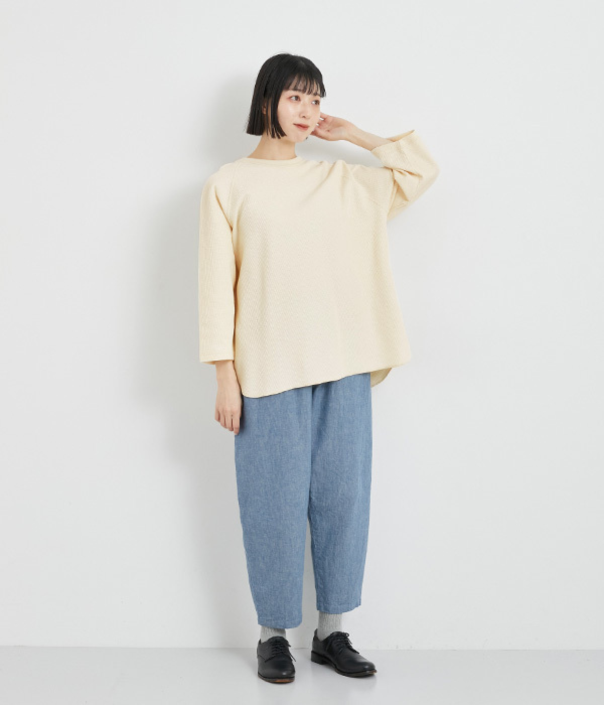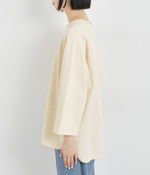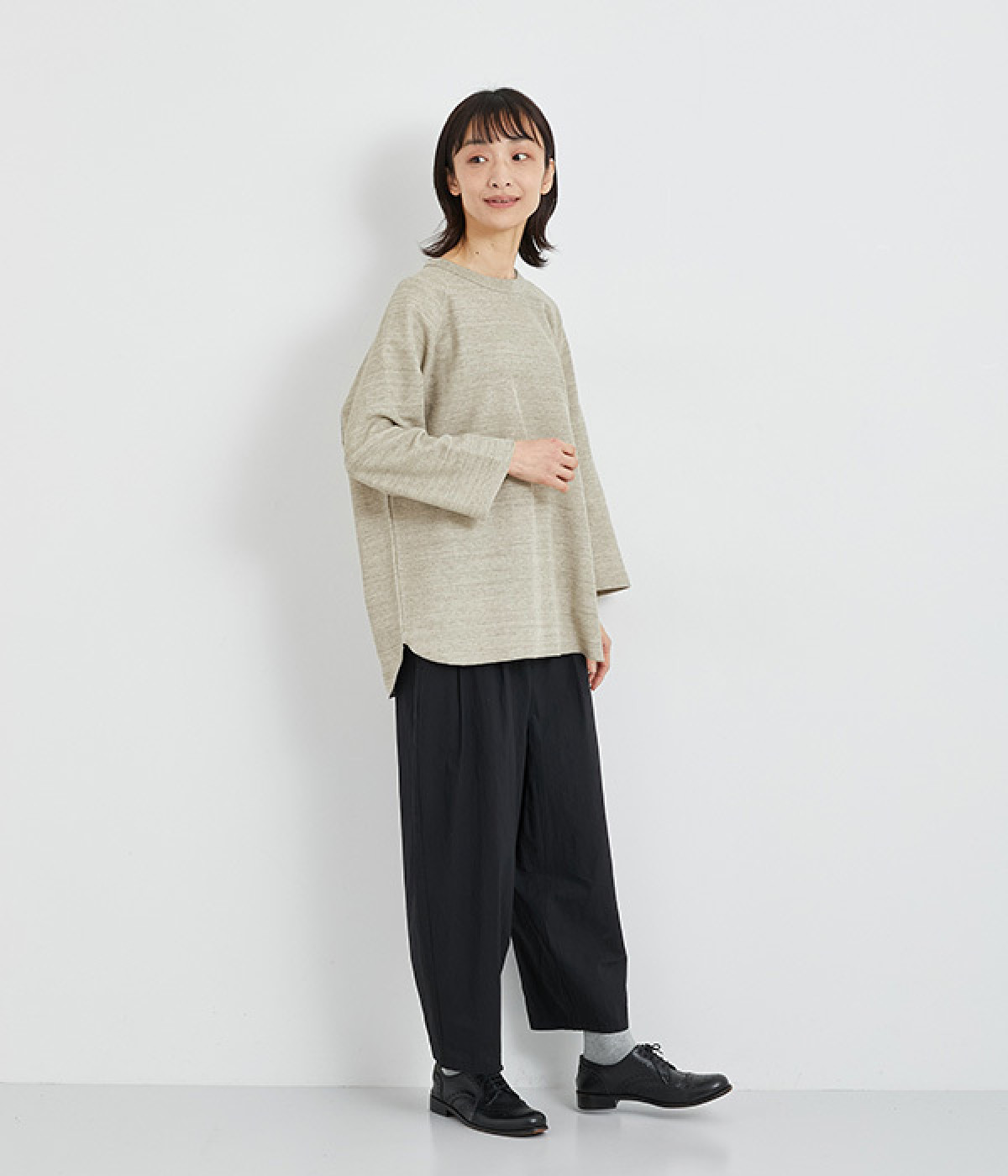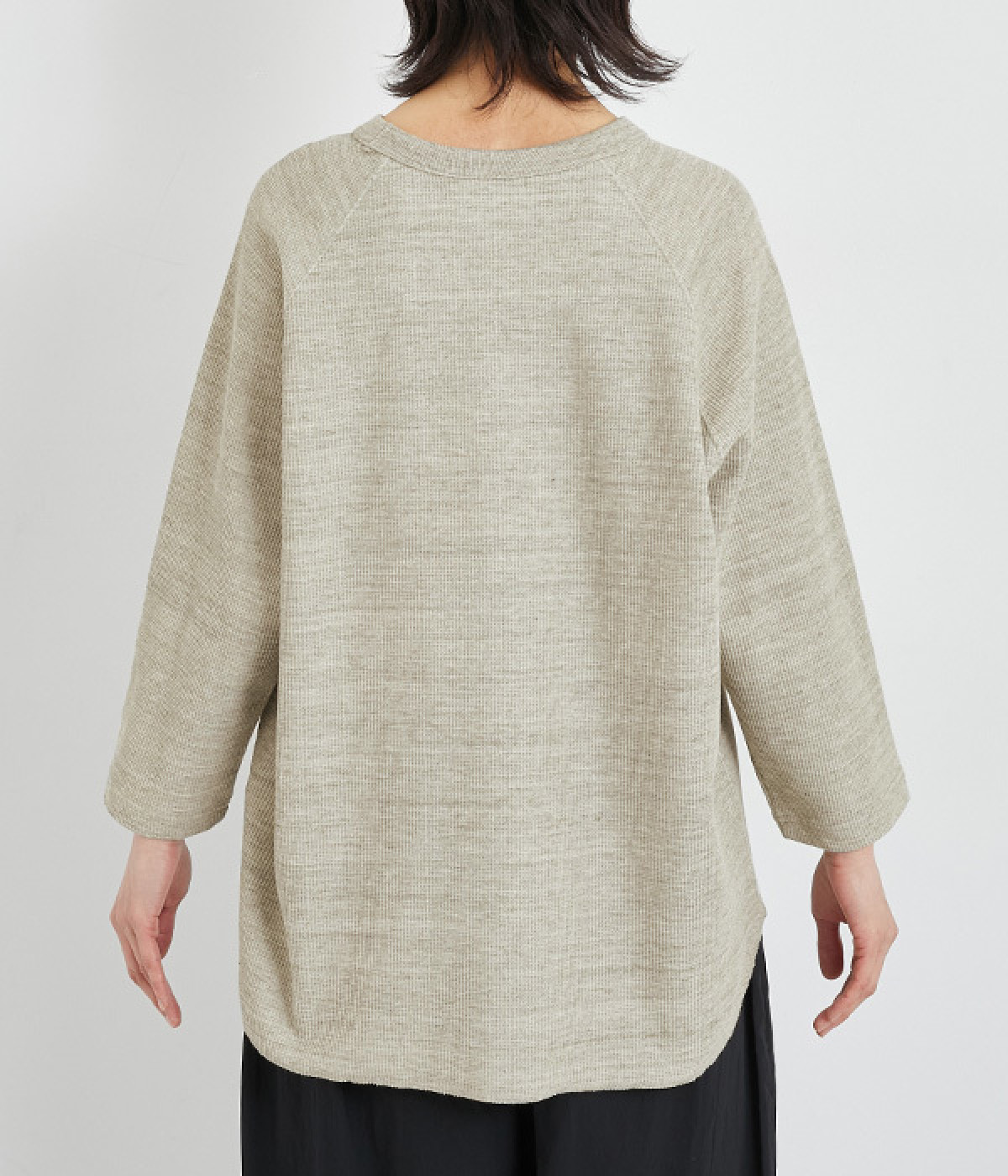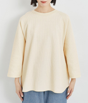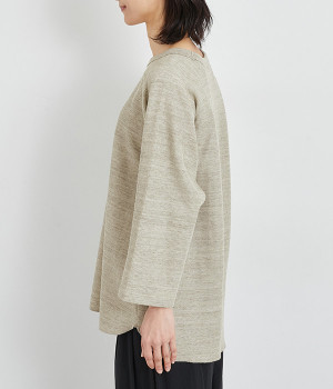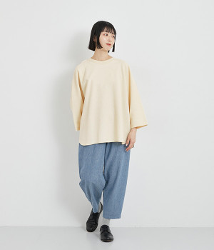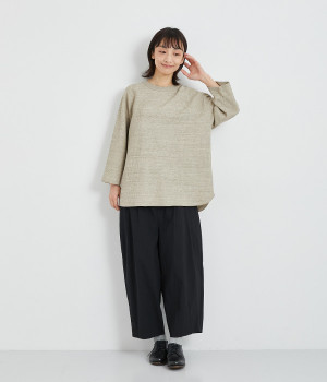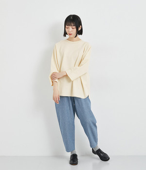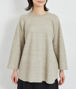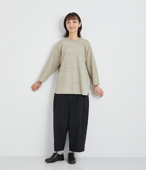シンプルな佇まいが魅力的なプルオーバーは、やや長めの着丈でリラックス感を高めています。ニット合わせで裾をチラ見せしたり、メインにもサブにもなる着まわし力の高さも◎ラグランスリーブで着心地も快適です。