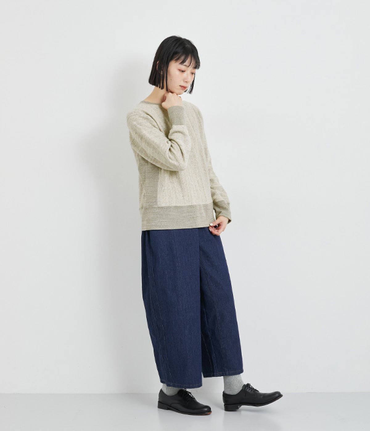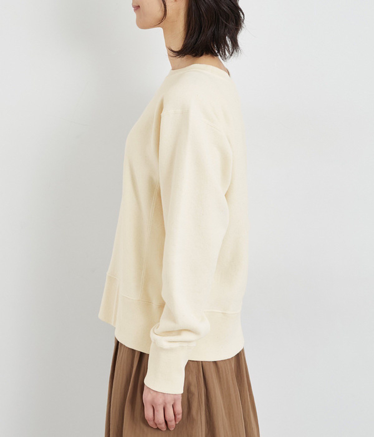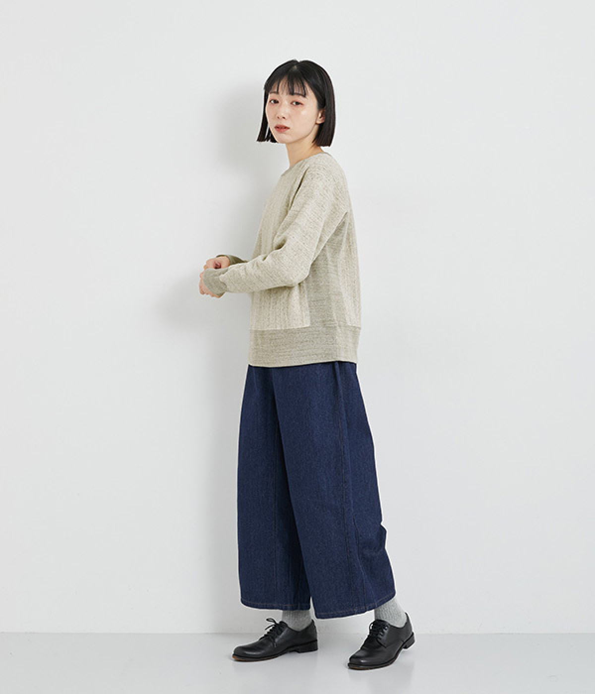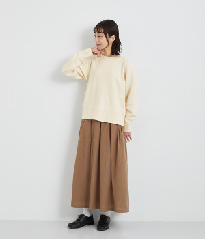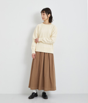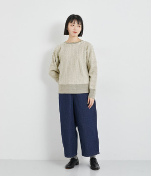 素材の良さを引き立てたシンプルなつくりに、太めのリブ切り替えがちょうどいいアクセントになっています。ラフだけど手抜きじゃないこなれ感が魅力で、大人のリラックススタイルに欠かせない一枚になりそう。