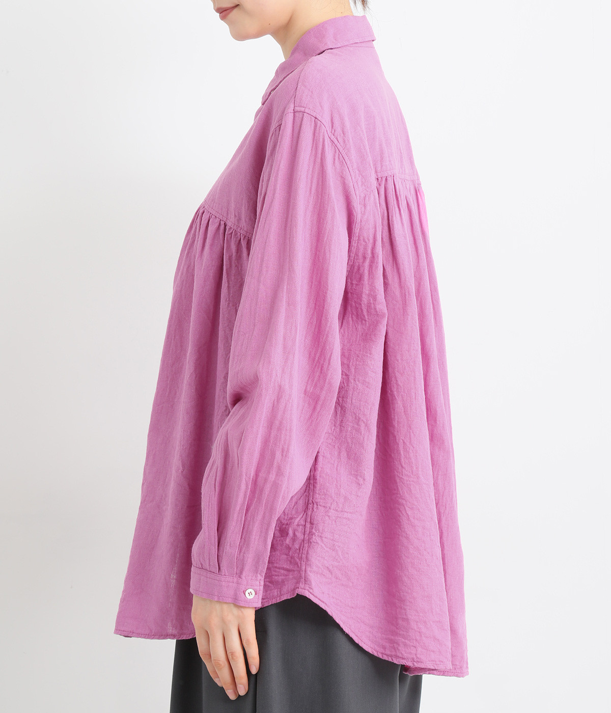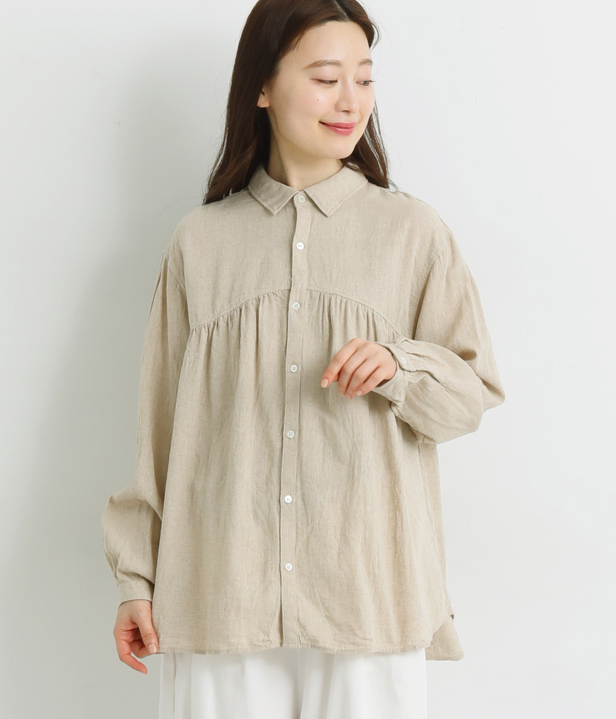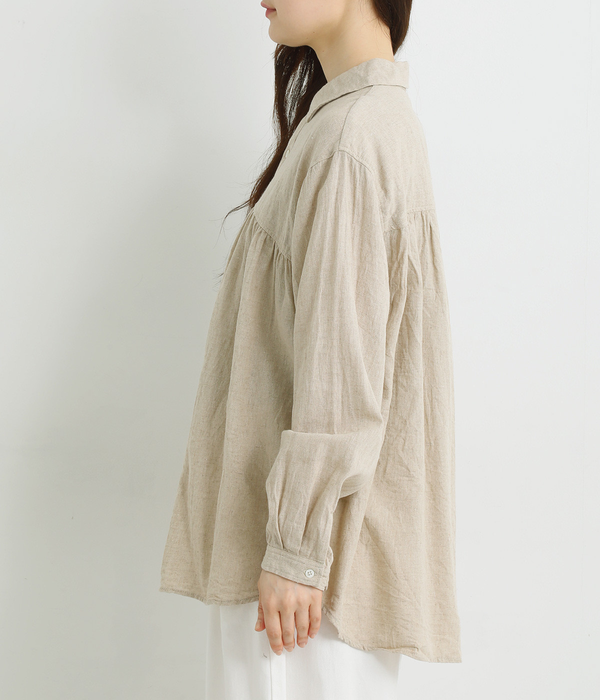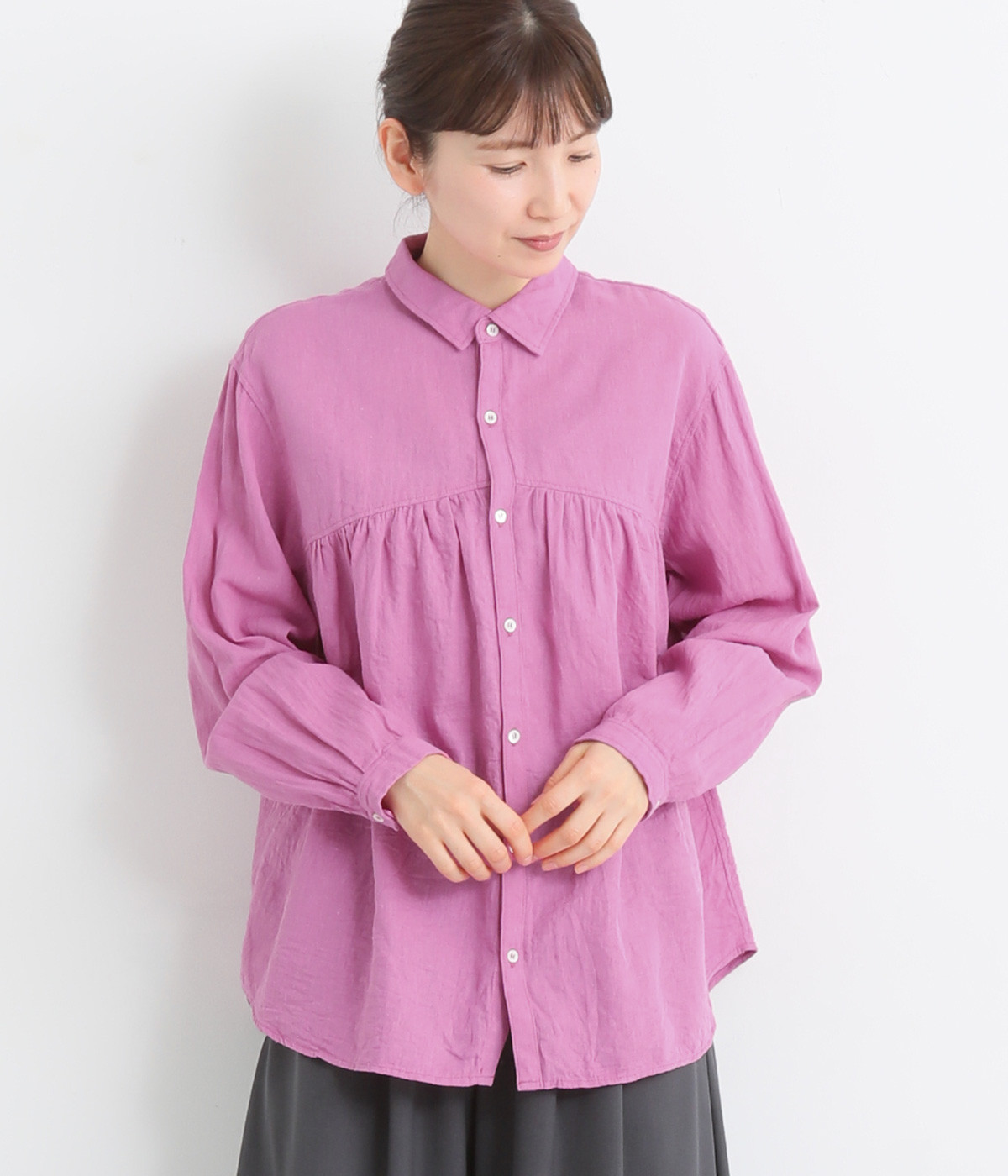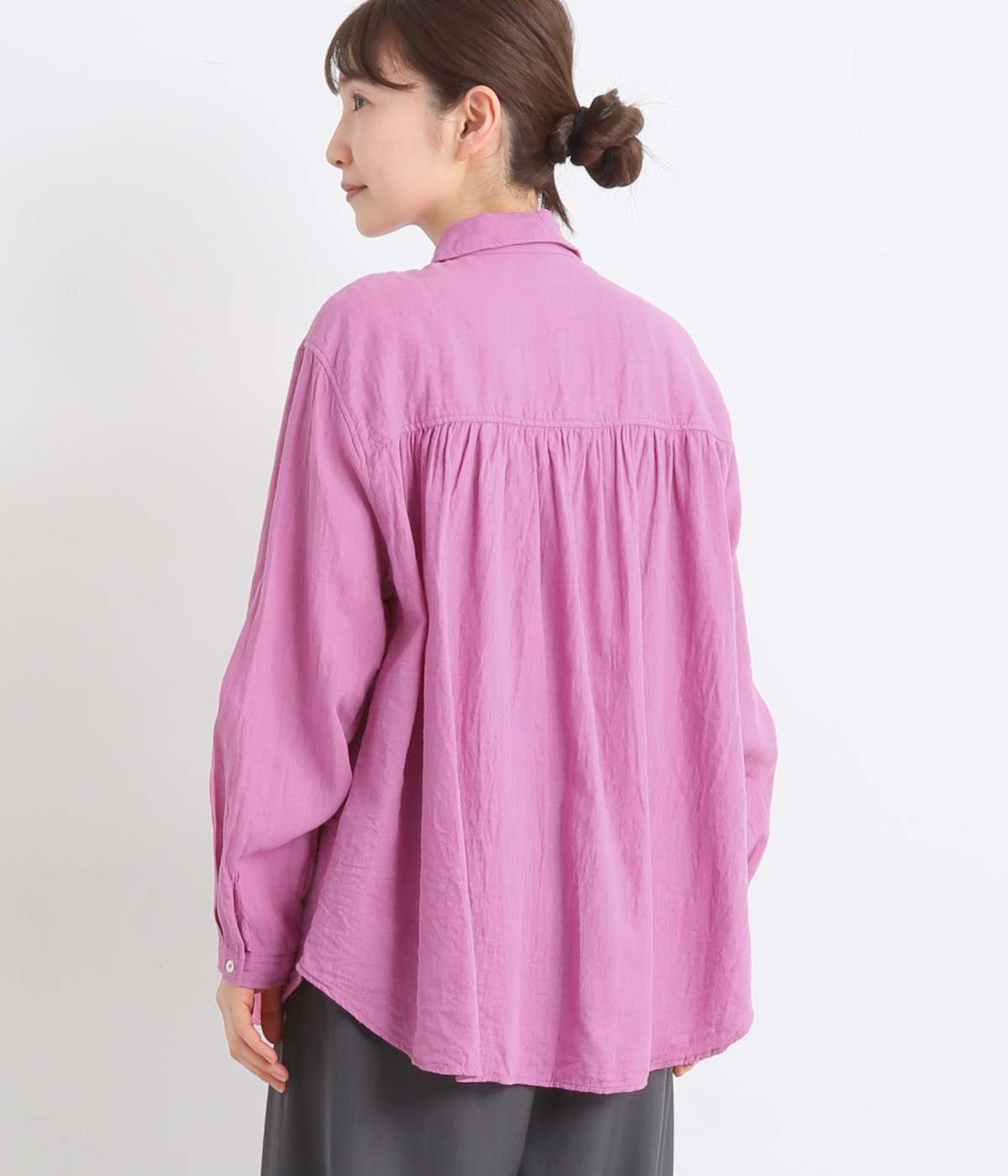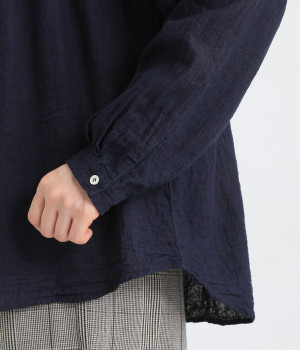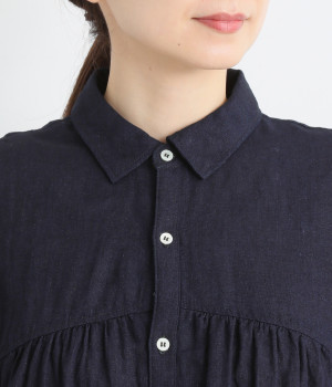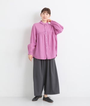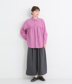前後のヨークにギャザーを入れてふんわりとやさし気に。肩のラインをなめらかに見せるドロップショルダーや、たっぷりと体が泳ぐワイドシルエットでくつろぎムードを演出します。襟つきなのできちんと感はしっかりキープ。