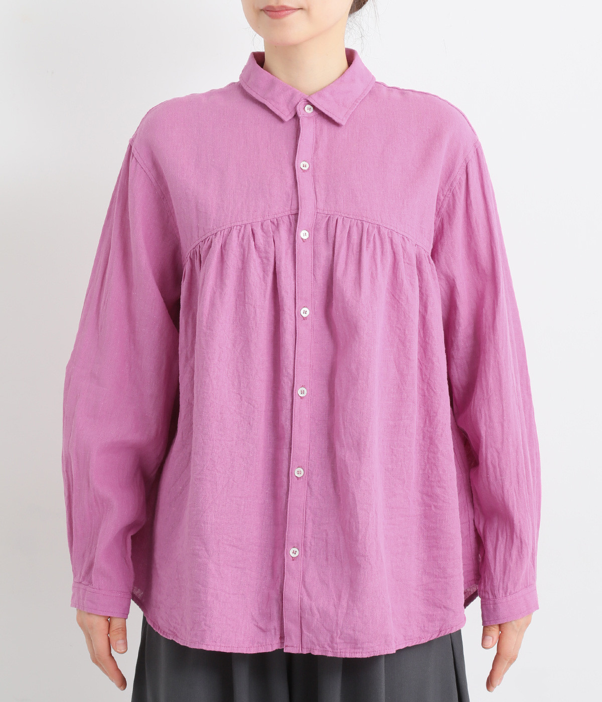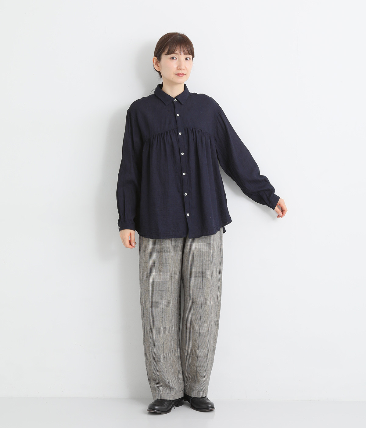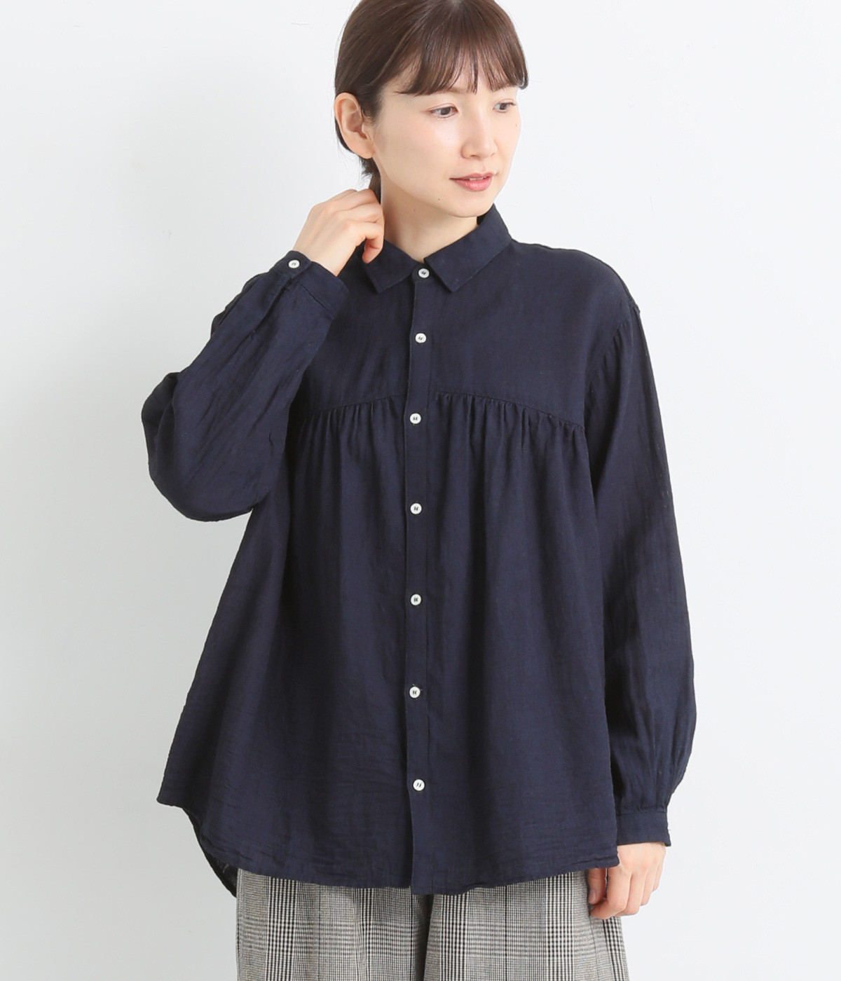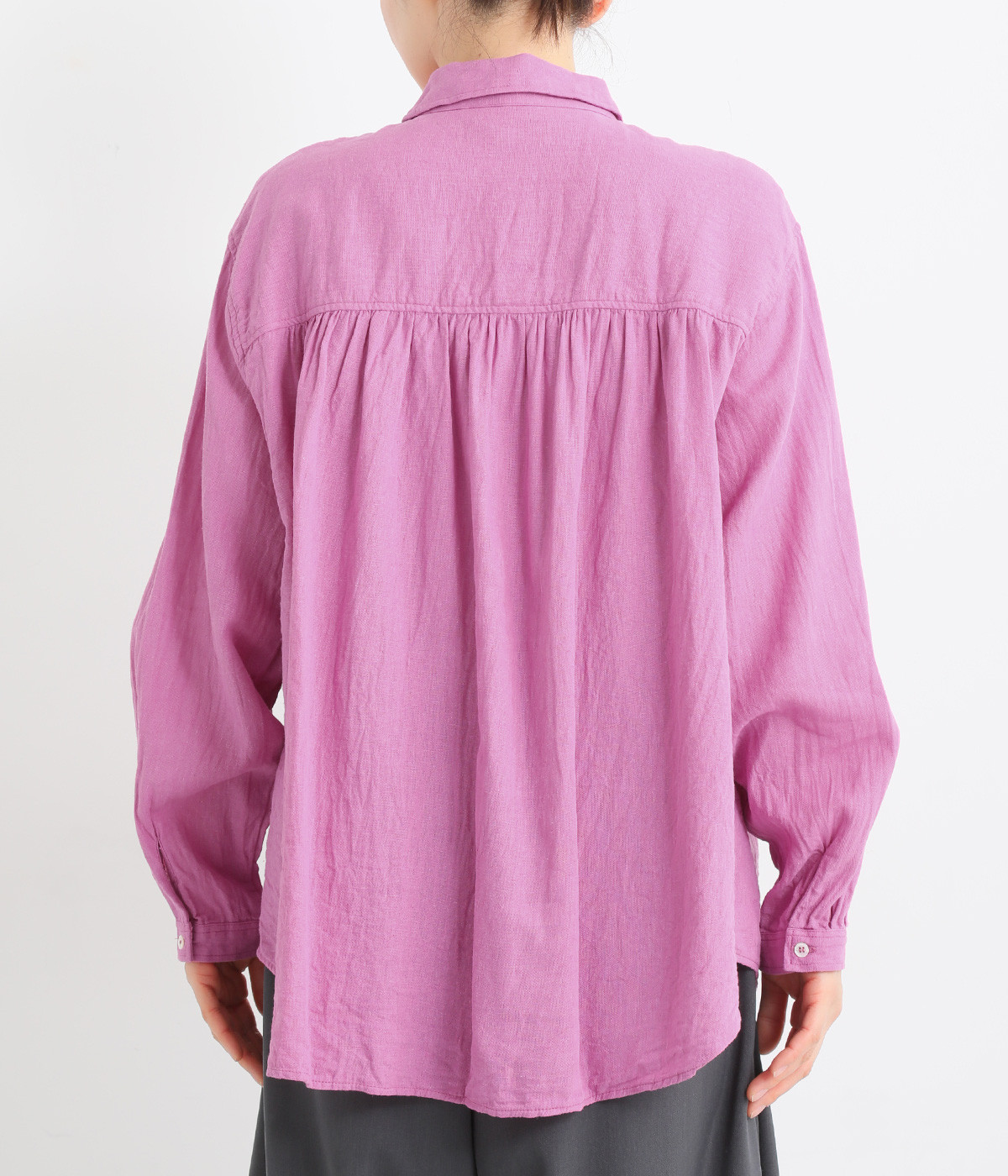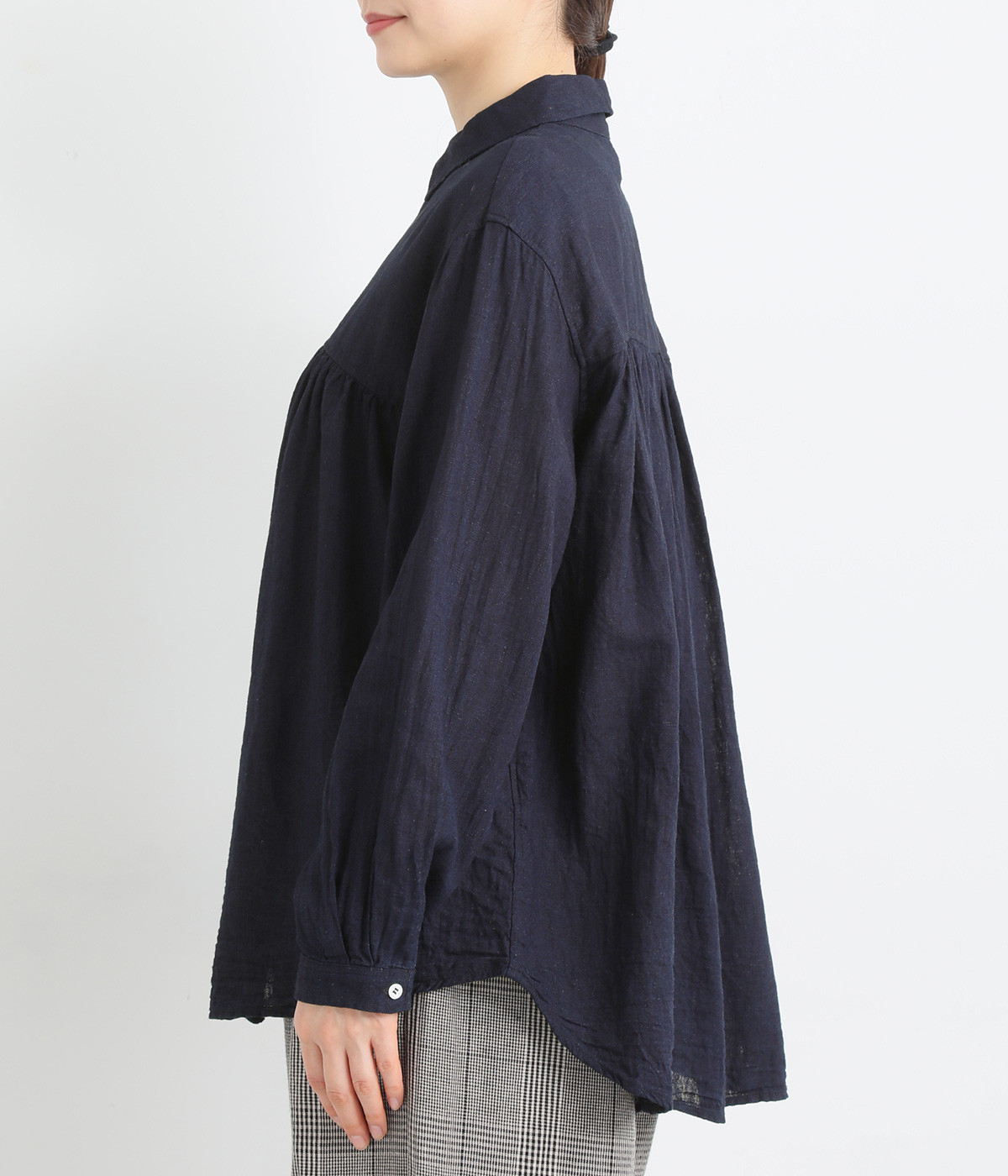 前後のヨークにギャザーを入れてふんわりとやさし気に。肩のラインをなめらかに見せるドロップショルダーや、たっぷりと体が泳ぐワイドシルエットでくつろぎムードを演出します。襟つきなのできちんと感はしっかりキープ。