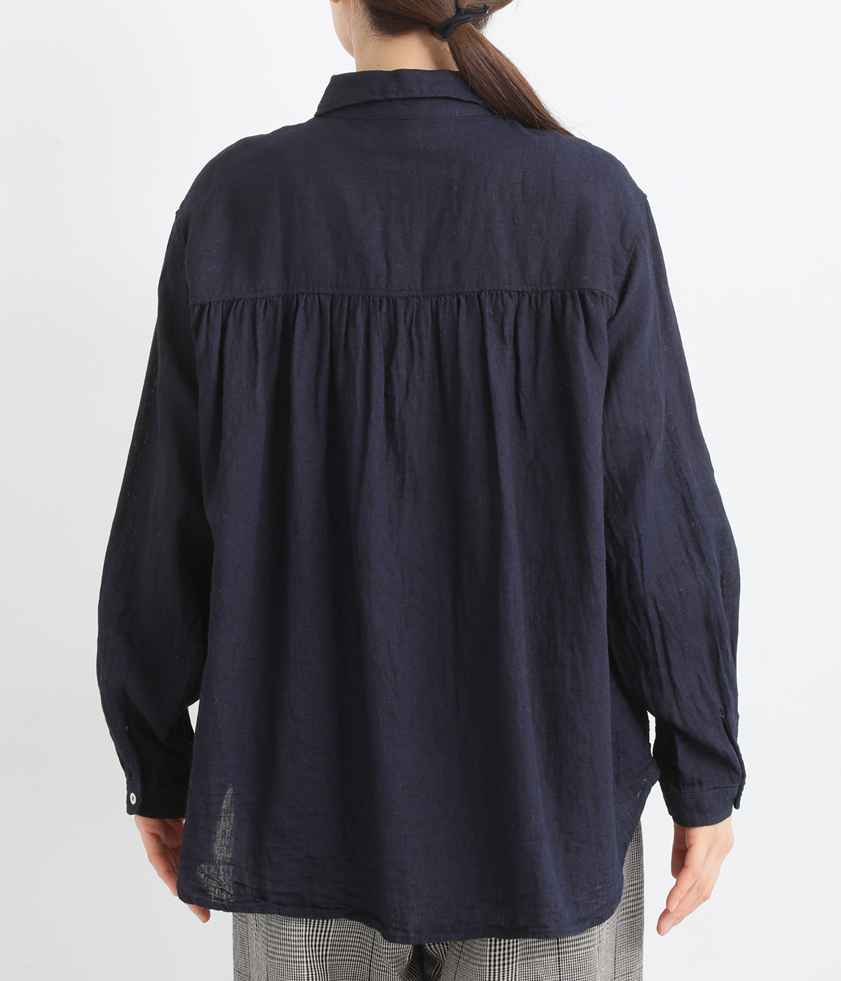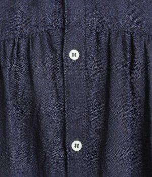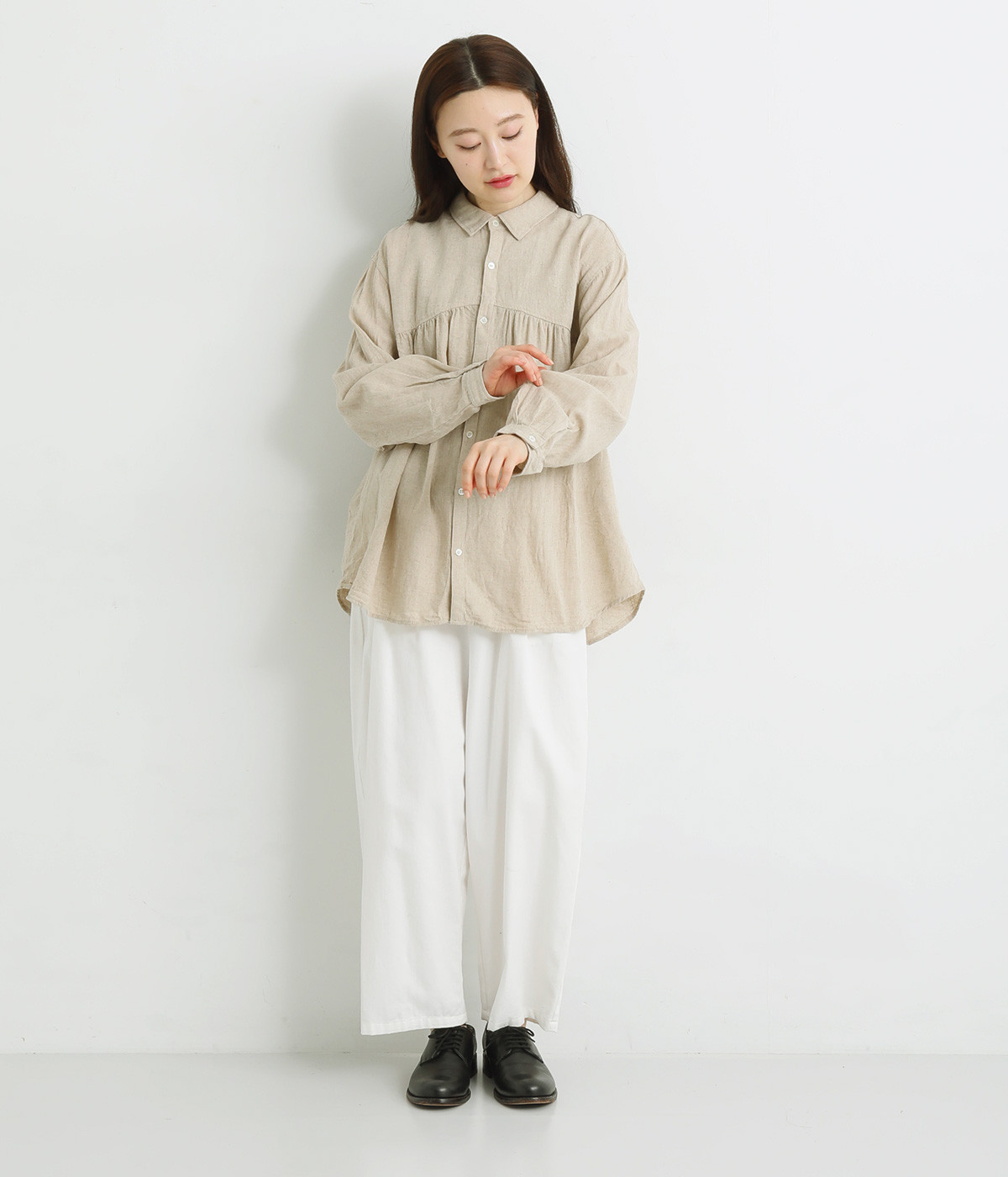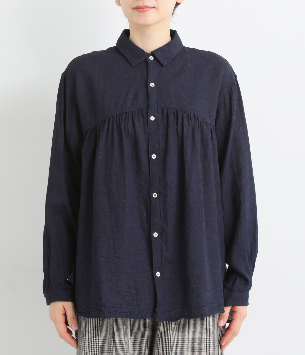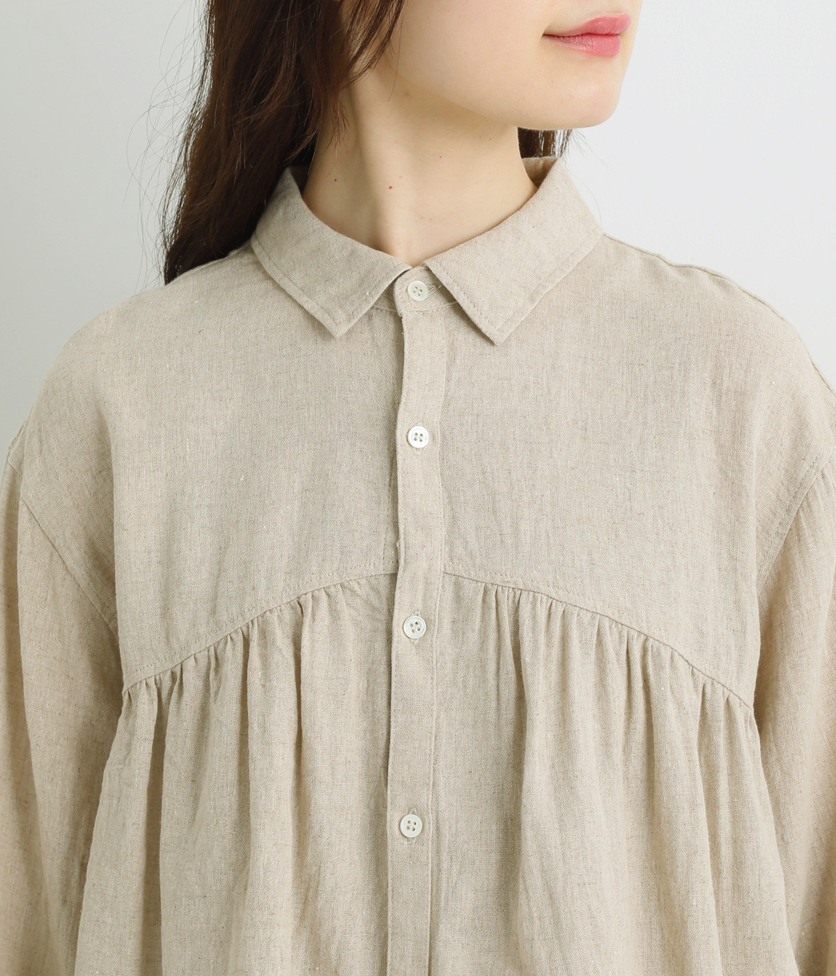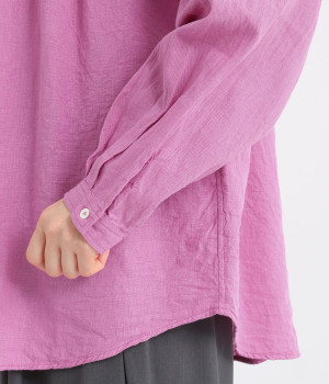 前後のヨークにギャザーを入れてふんわりとやさし気に。肩のラインをなめらかに見せるドロップショルダーや、たっぷりと体が泳ぐワイドシルエットでくつろぎムードを演出します。襟つきなのできちんと感はしっかりキープ。