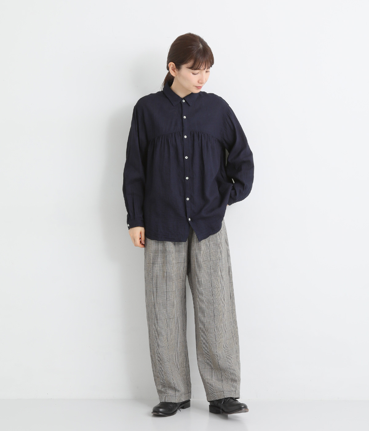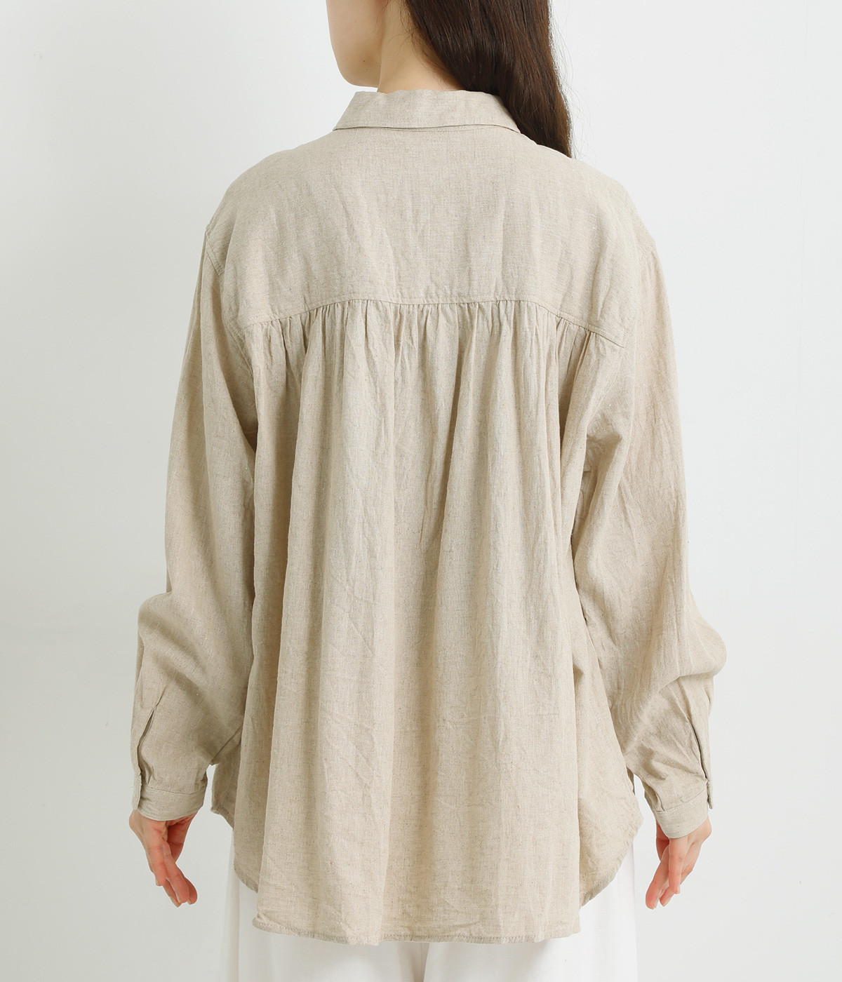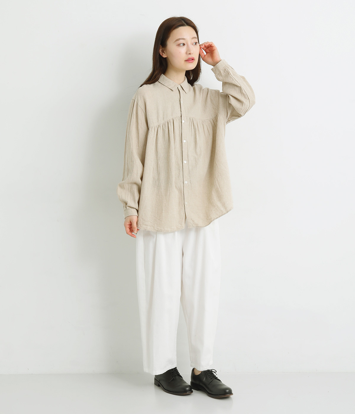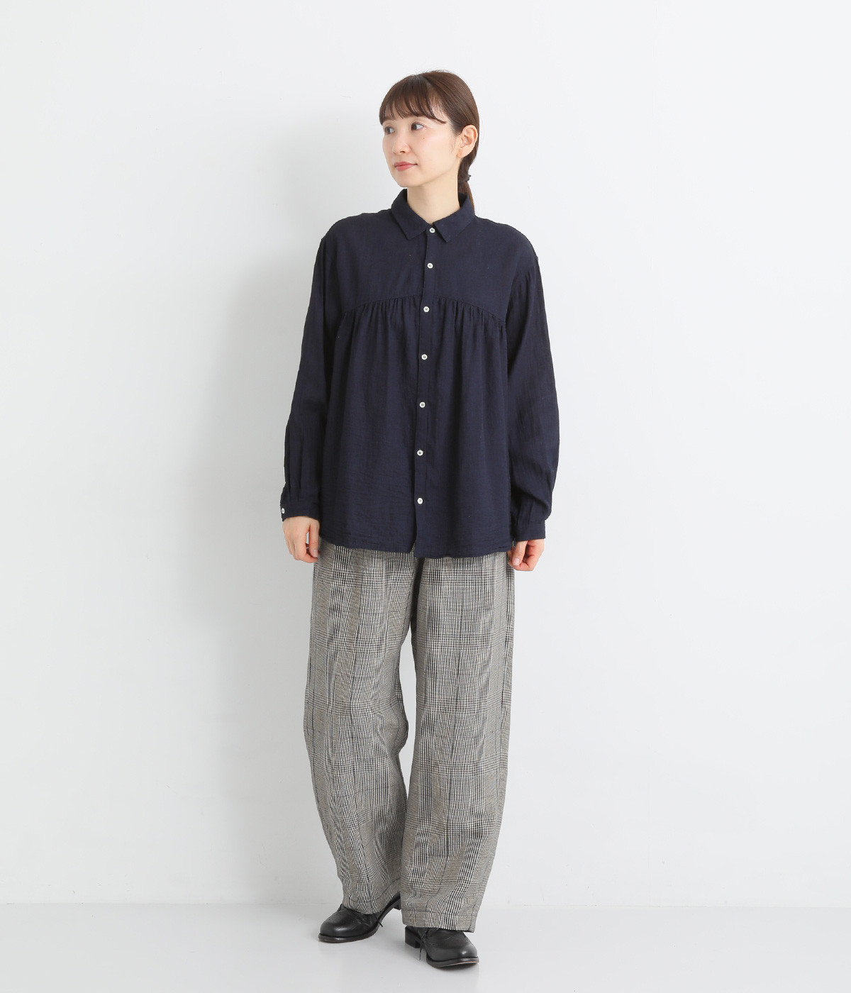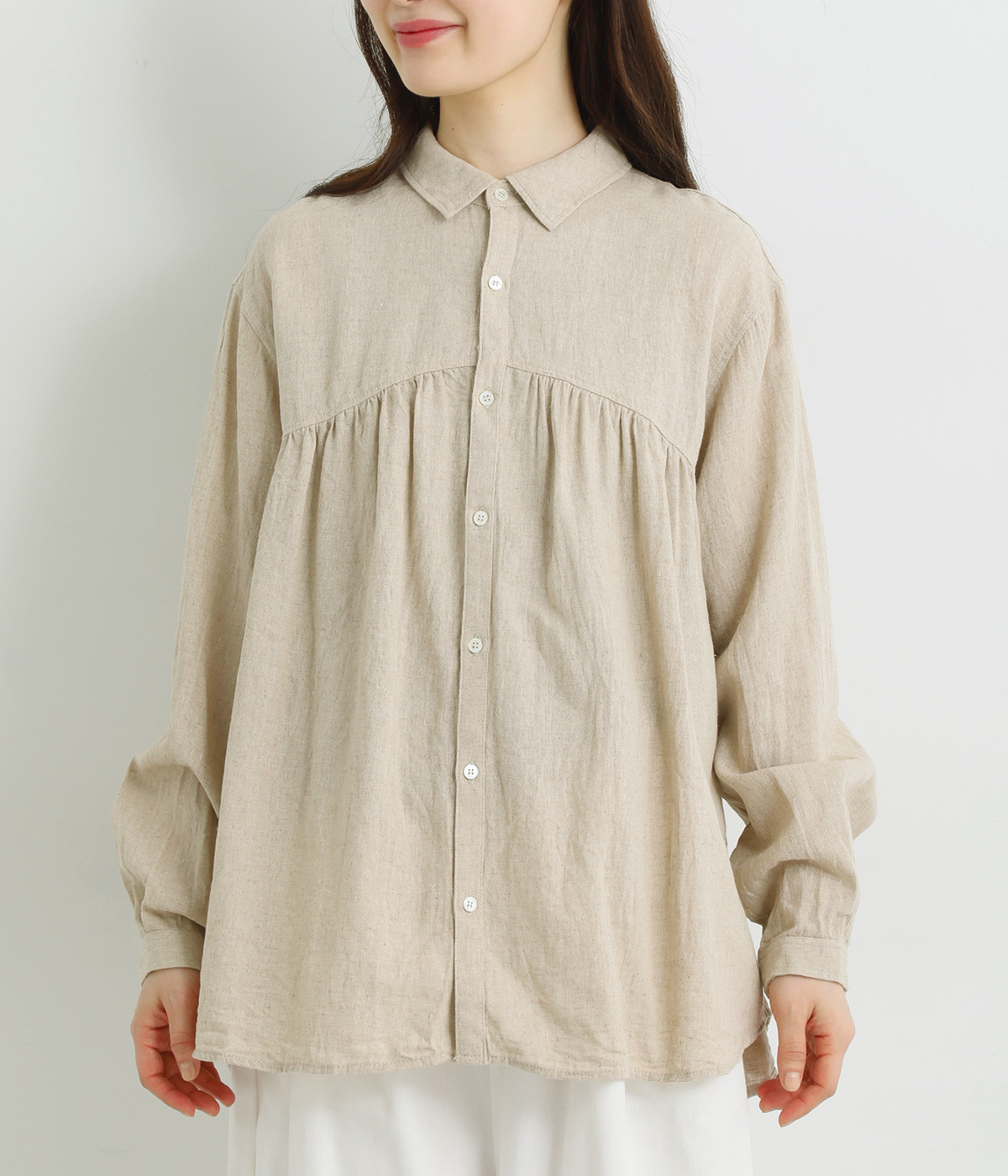 前後のヨークにギャザーを入れてふんわりとやさし気に。肩のラインをなめらかに見せるドロップショルダーや、たっぷりと体が泳ぐワイドシルエットでくつろぎムードを演出します。襟つきなのできちんと感はしっかりキープ。